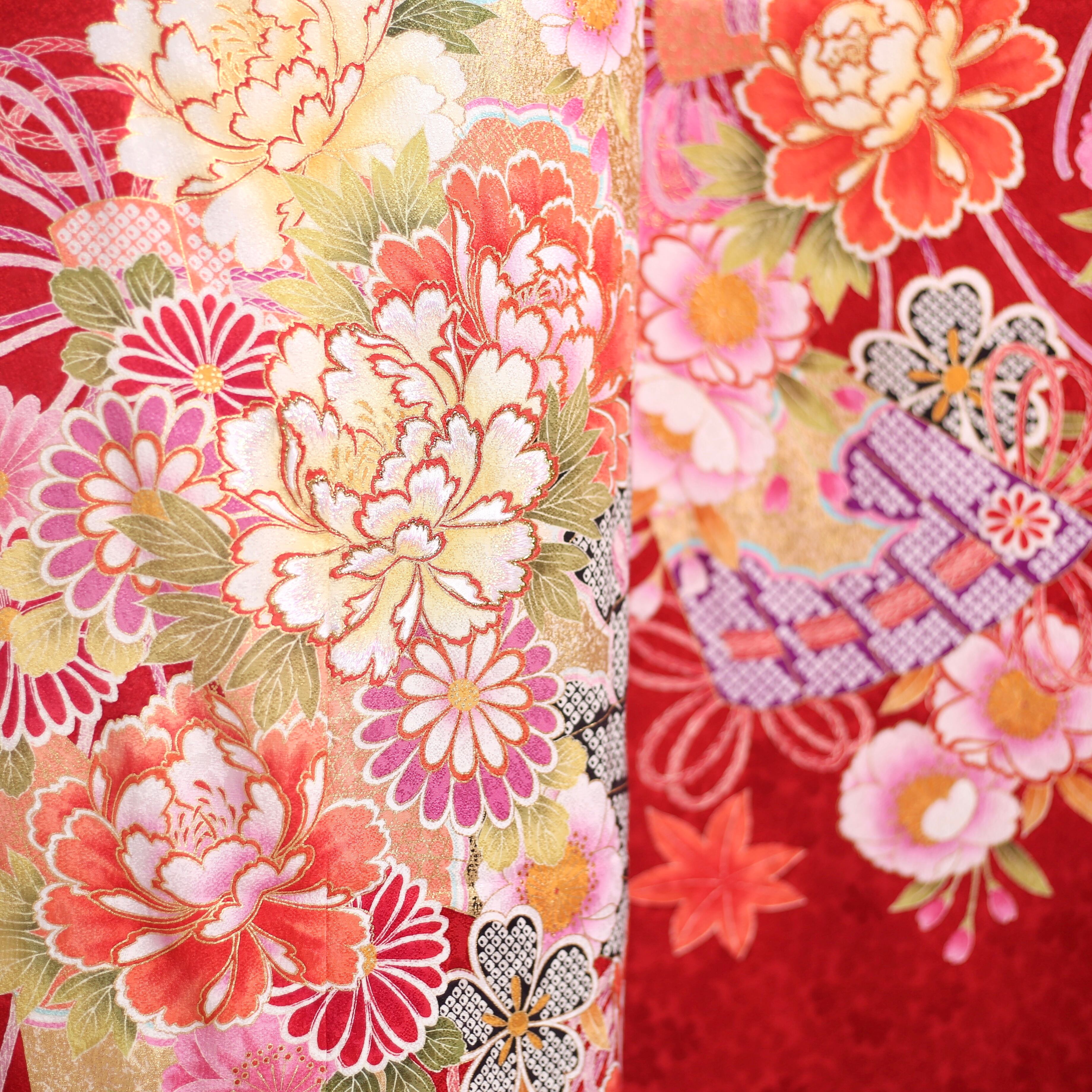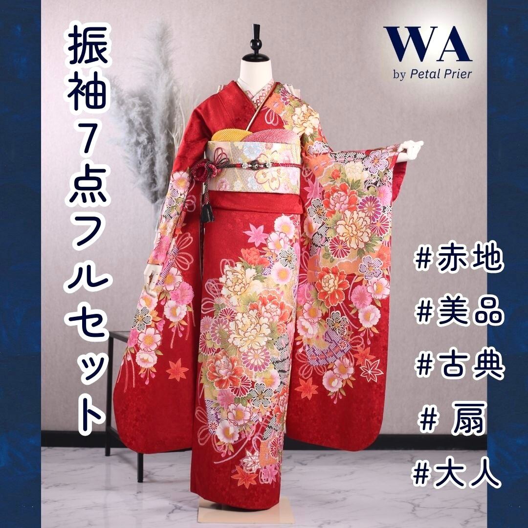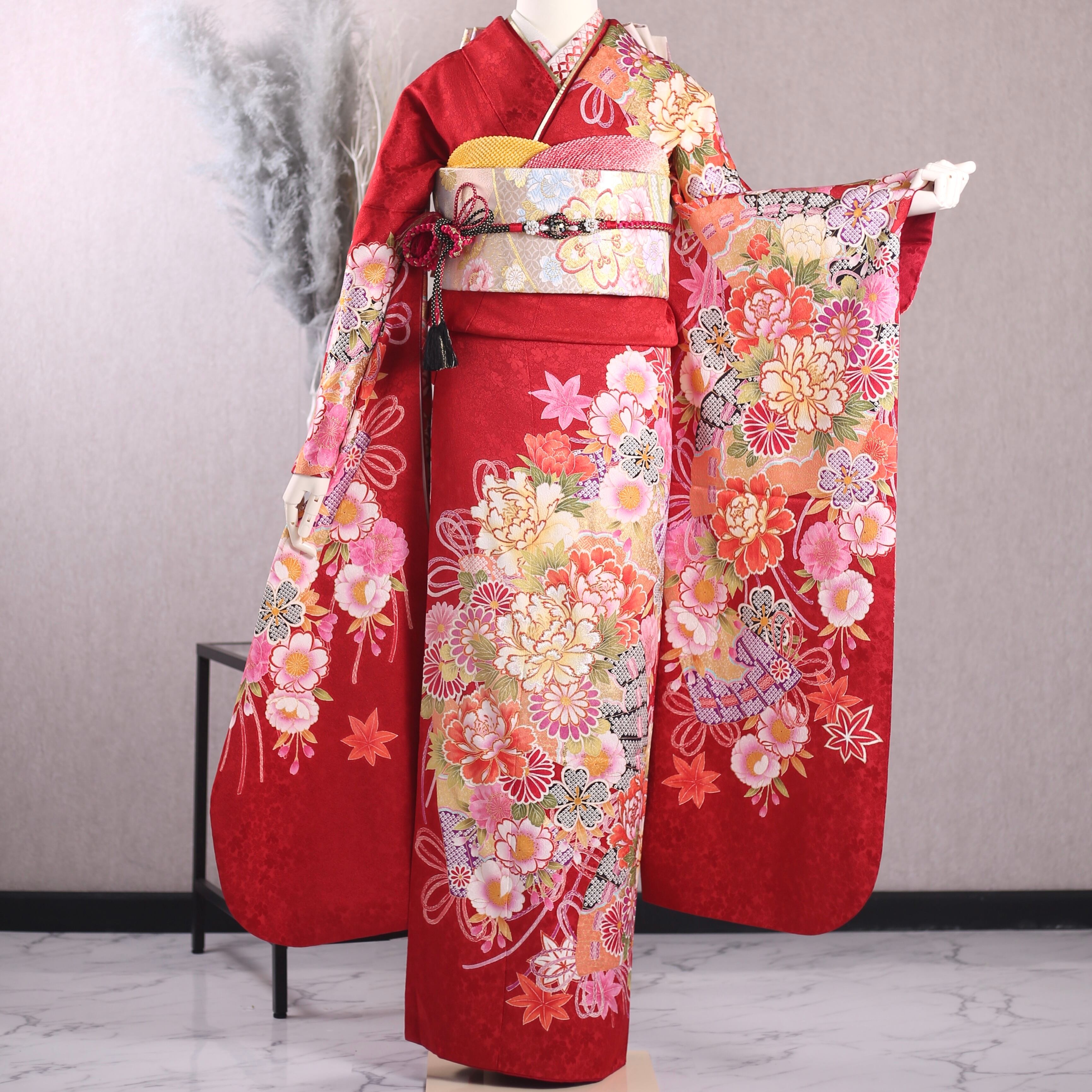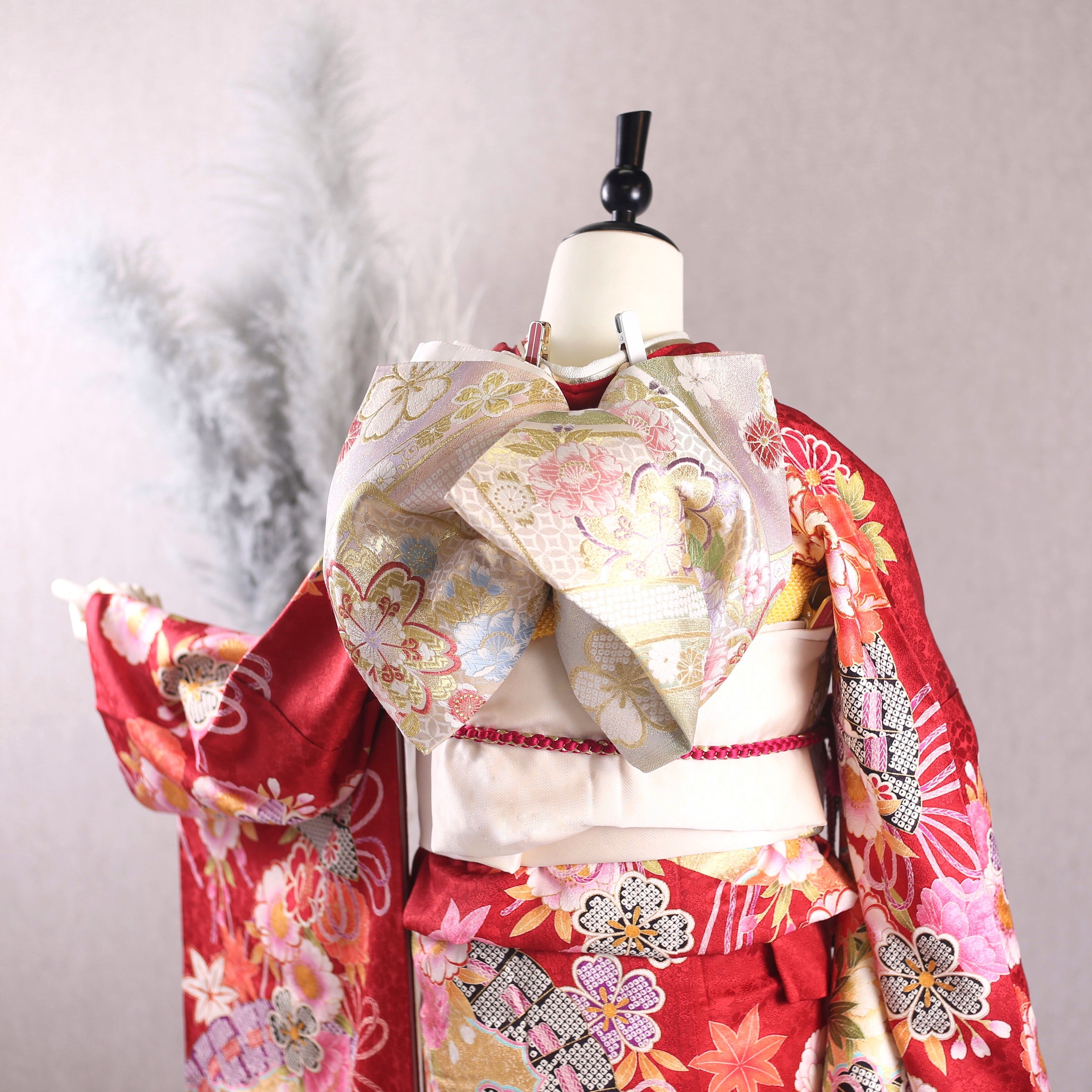 振袖フルセット 振袖セット 振袖 LLサイズ 赤×古典 美品 成人式 着物 晴れ着 7点フルセット KF-102