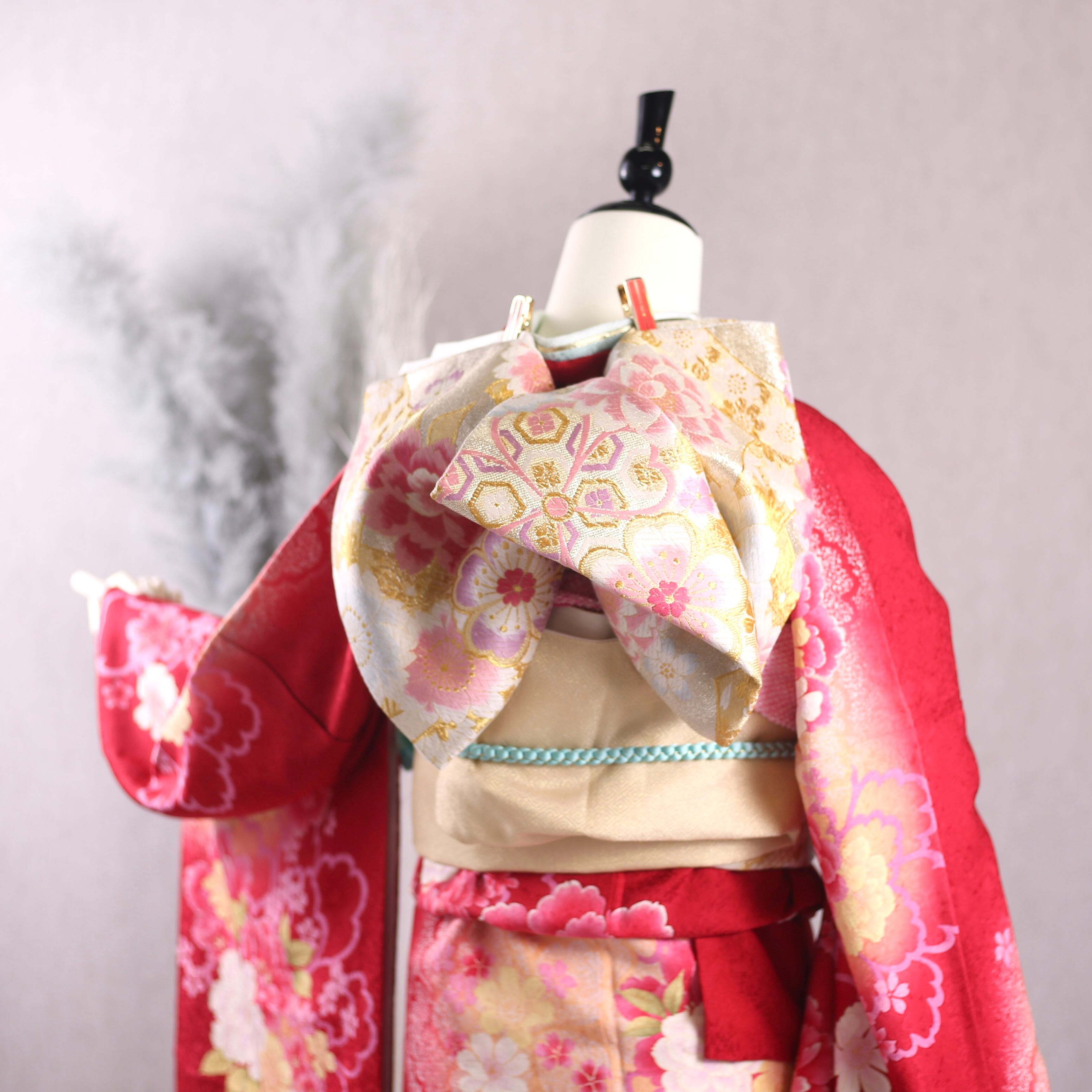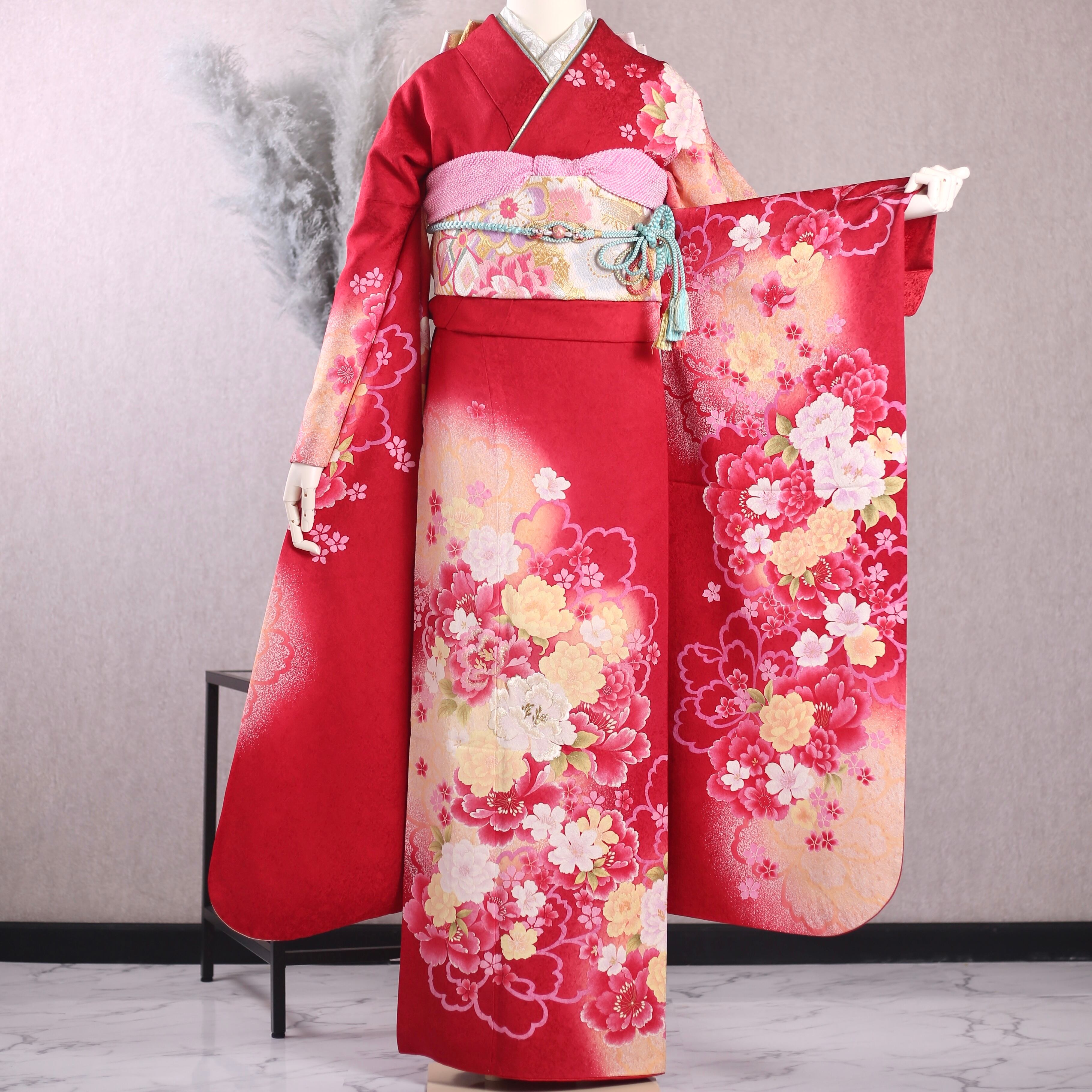 振袖フルセット 振袖セット 振袖 LLサイズ 赤×キュート 美品 成人式 着物 晴れ着 6点セット KFN-94