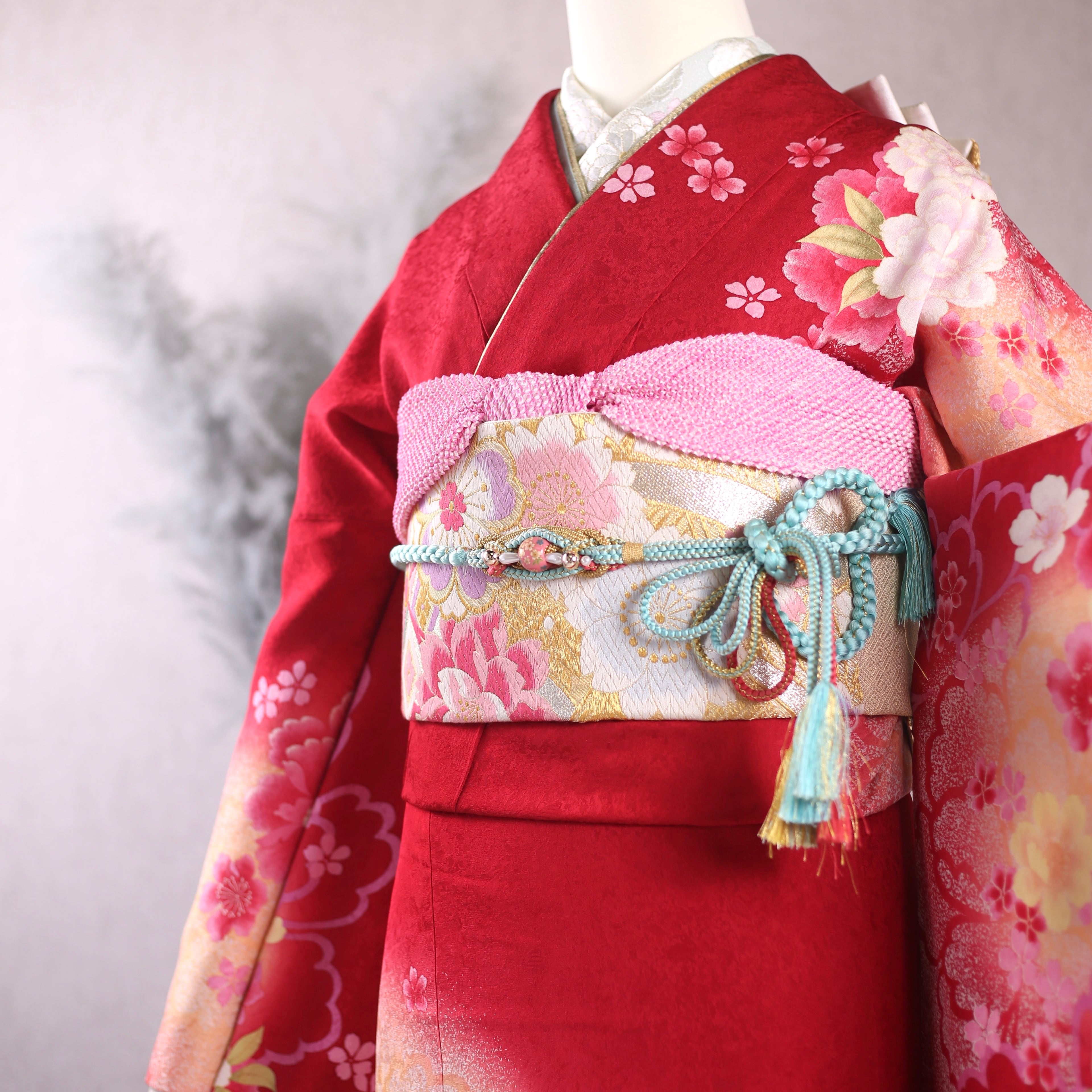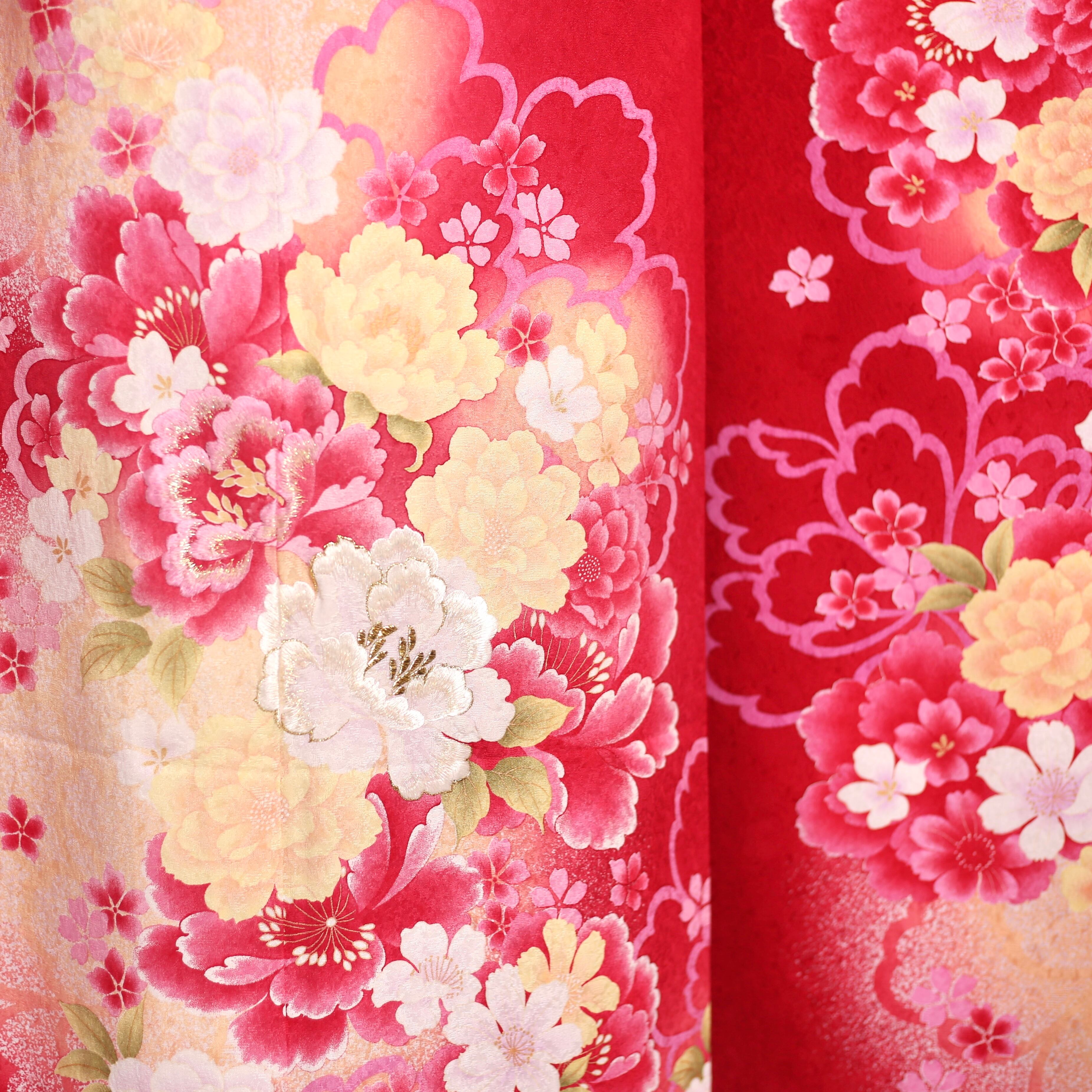 鮮やかな赤地に可憐な花柄が印象的な振袖です。