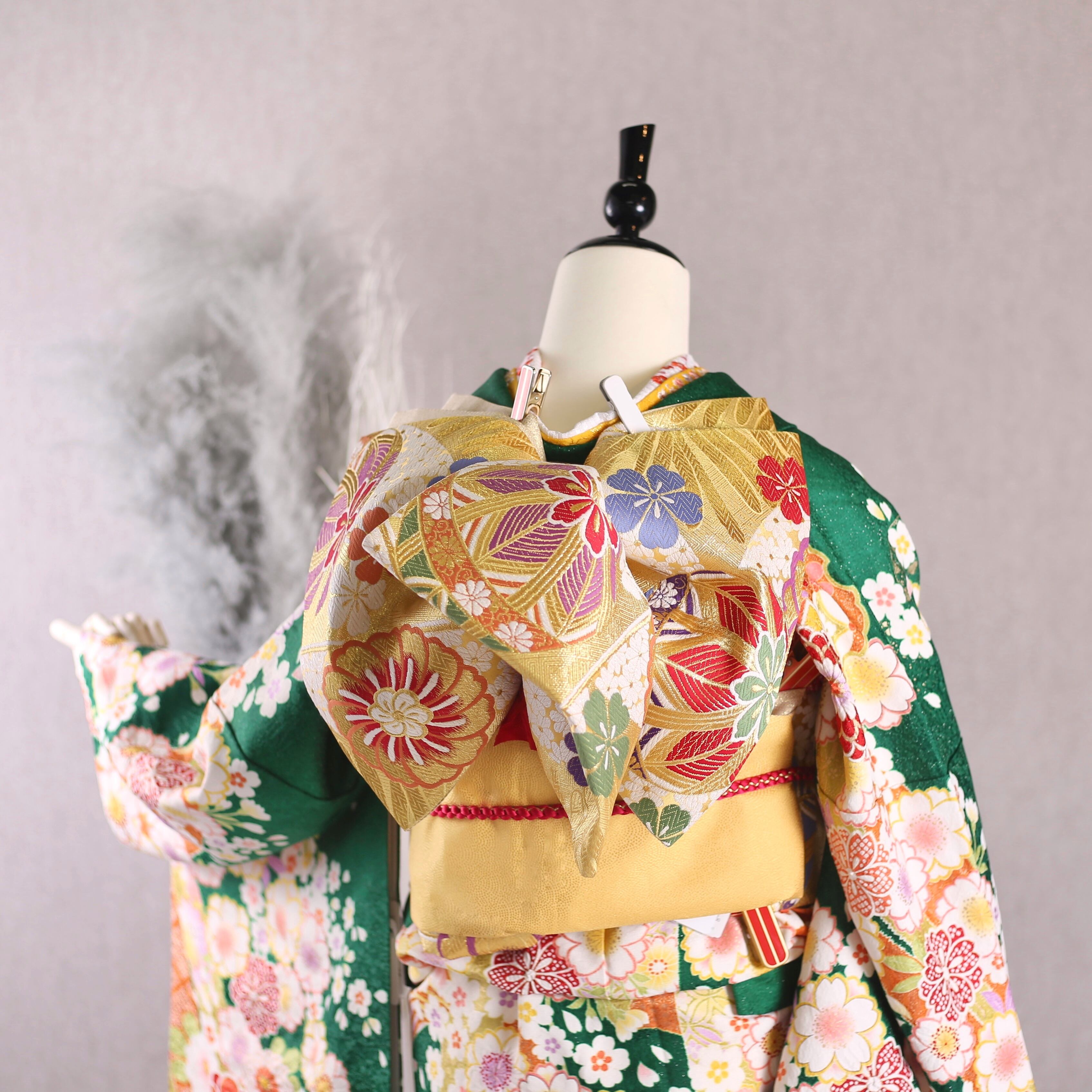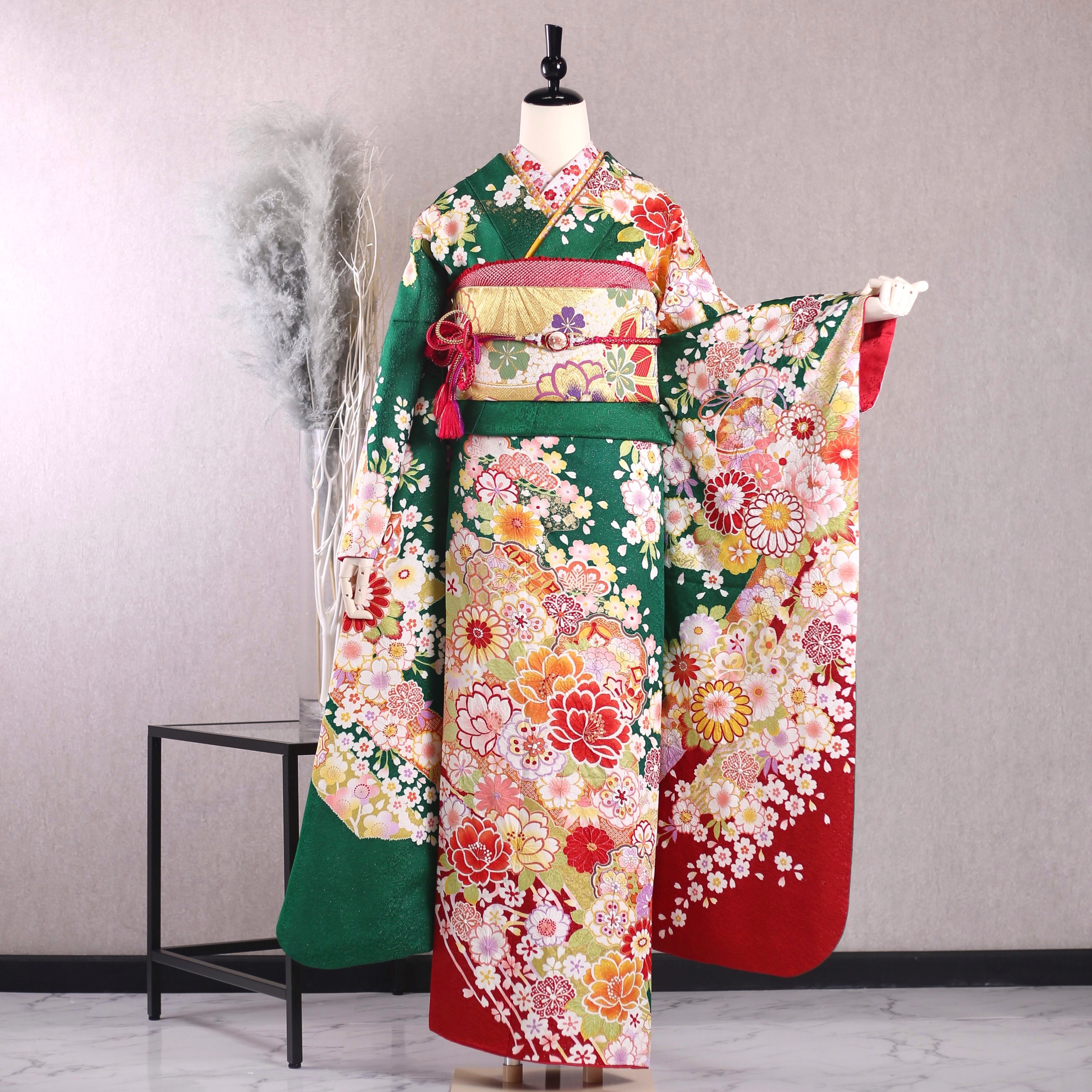 振袖フルセット 振袖セット 振袖 LLサイズ 緑×新古典 美品 成人式 着物 晴れ着 7点フルセット KF-109
