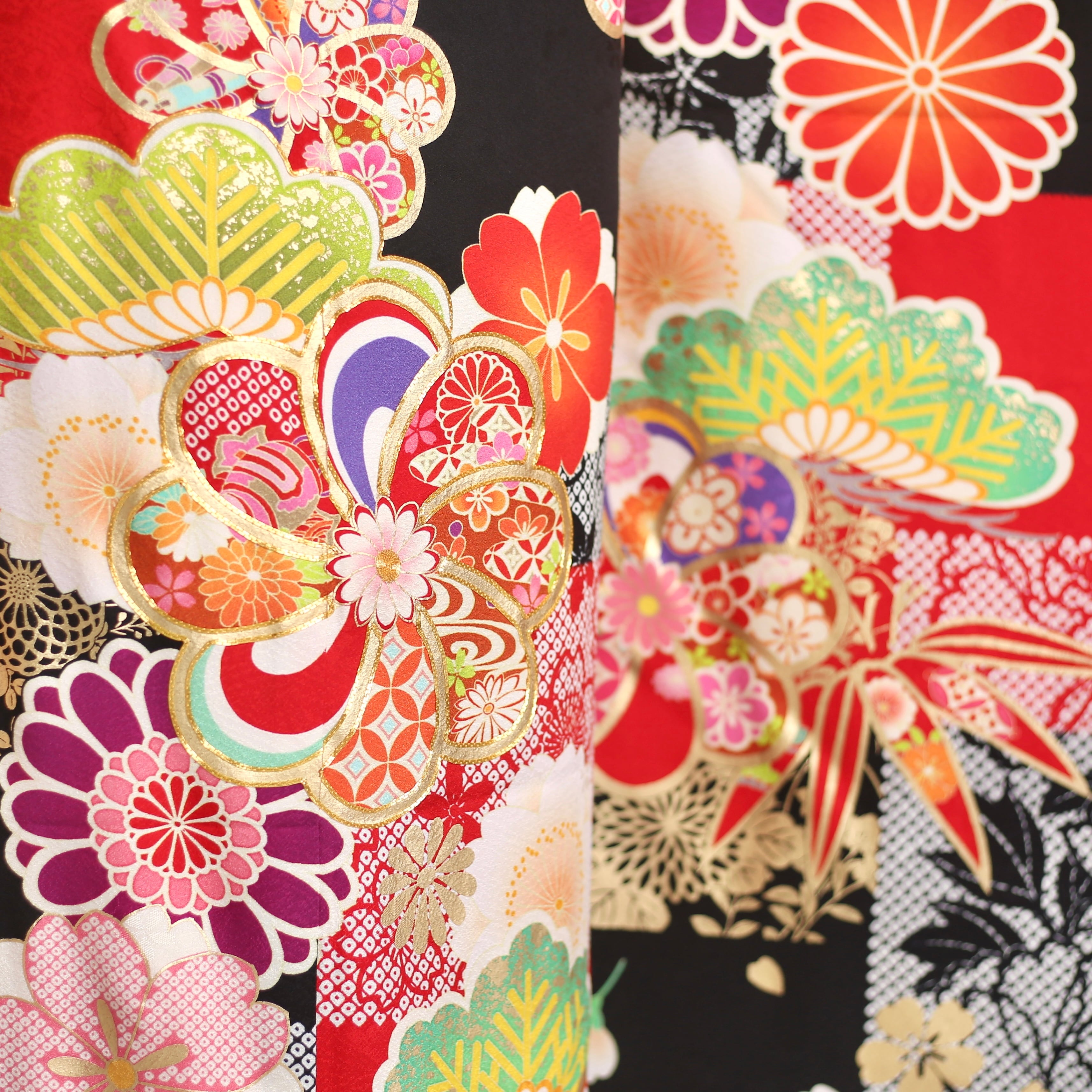 黒地に鮮やかな松竹梅が映えるレトロモダンな振袖です。