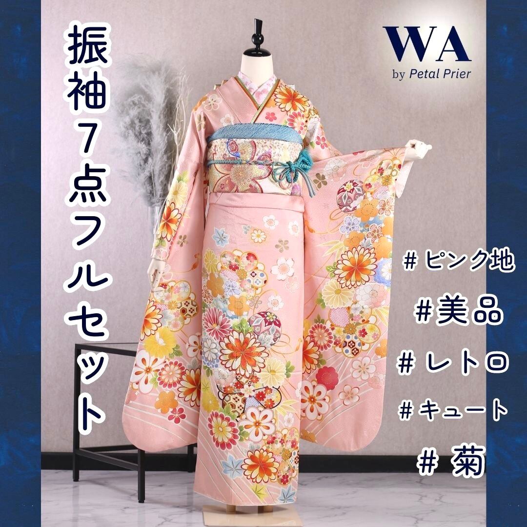 振袖フルセット 振袖セット 振袖 Lサイズ ピンク×レトロ 美品 成人式 着物 晴れ着 7点フルセット KF-145