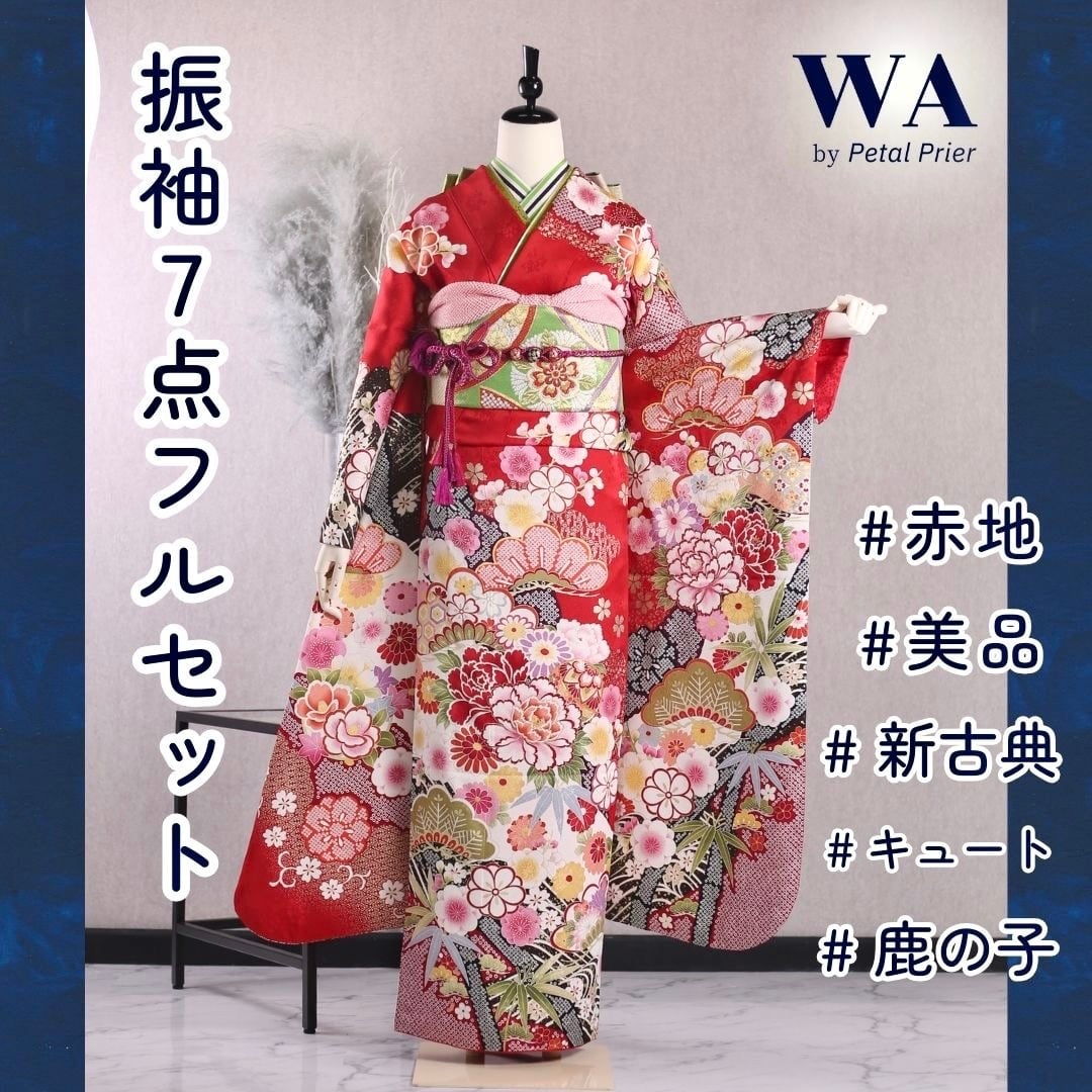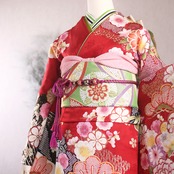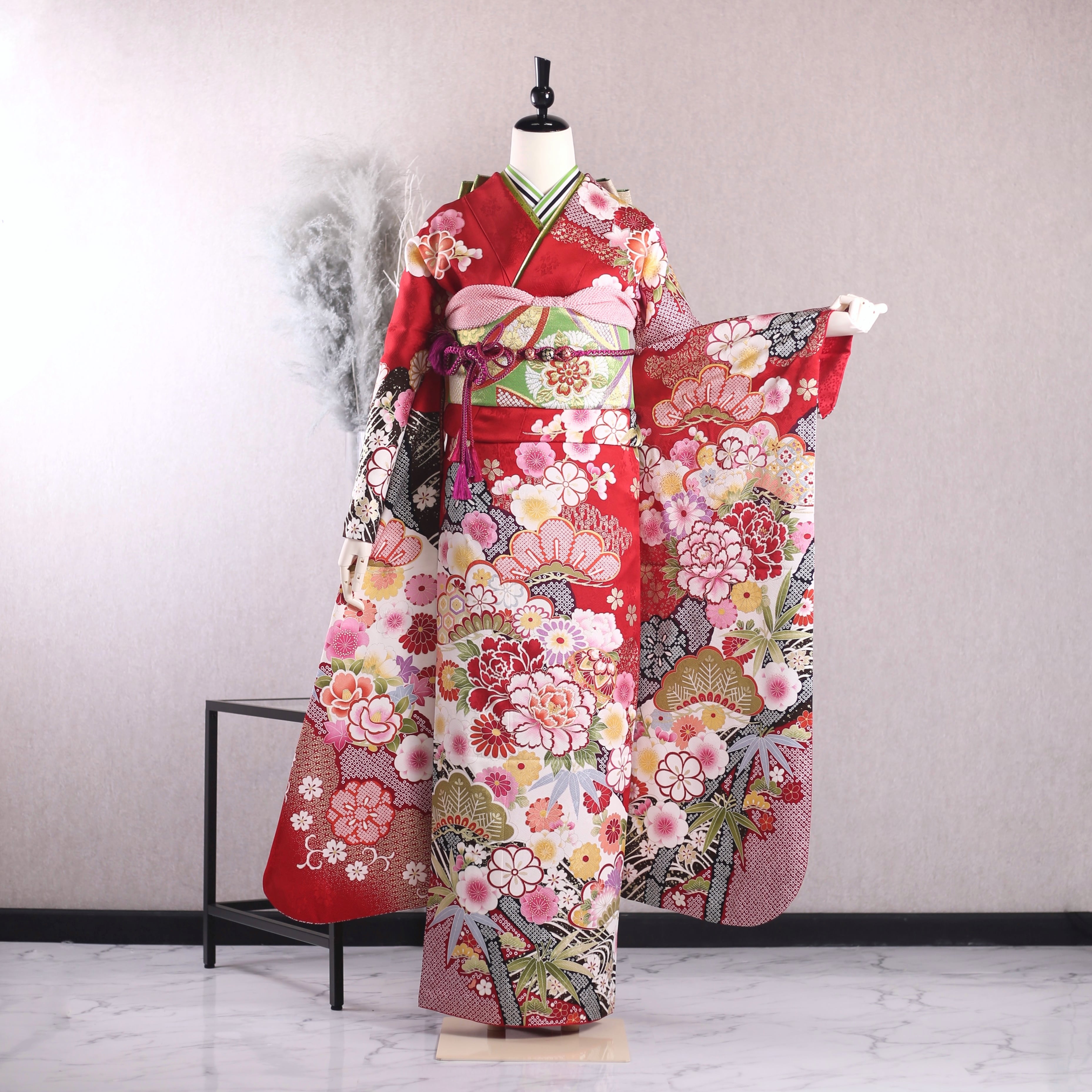 振袖フルセット 振袖セット 振袖 LLサイズ 赤×新古典 美品 成人式 着物 晴れ着 7点フルセット KF-167