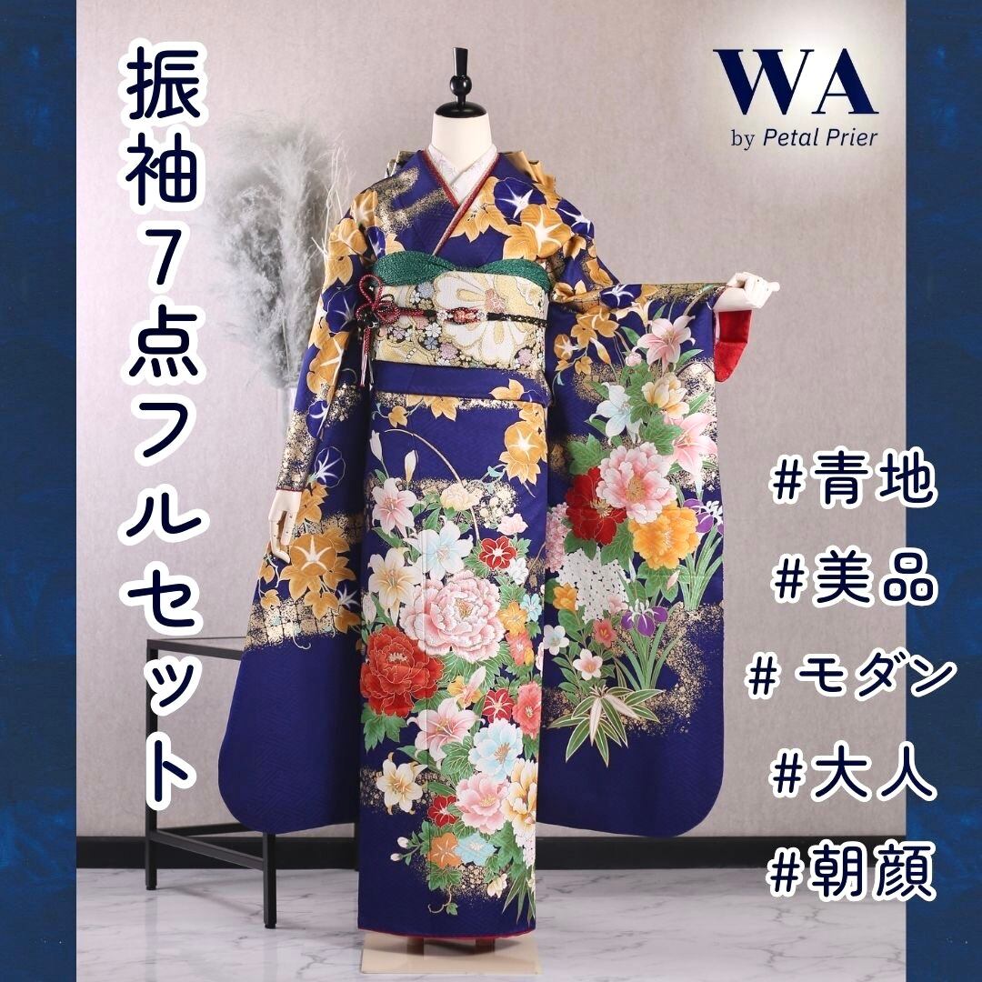 振袖フルセット 振袖セット 振袖 LLサイズ 青×モダン 美品 成人式 着物 晴れ着 7点フルセット KF-166
