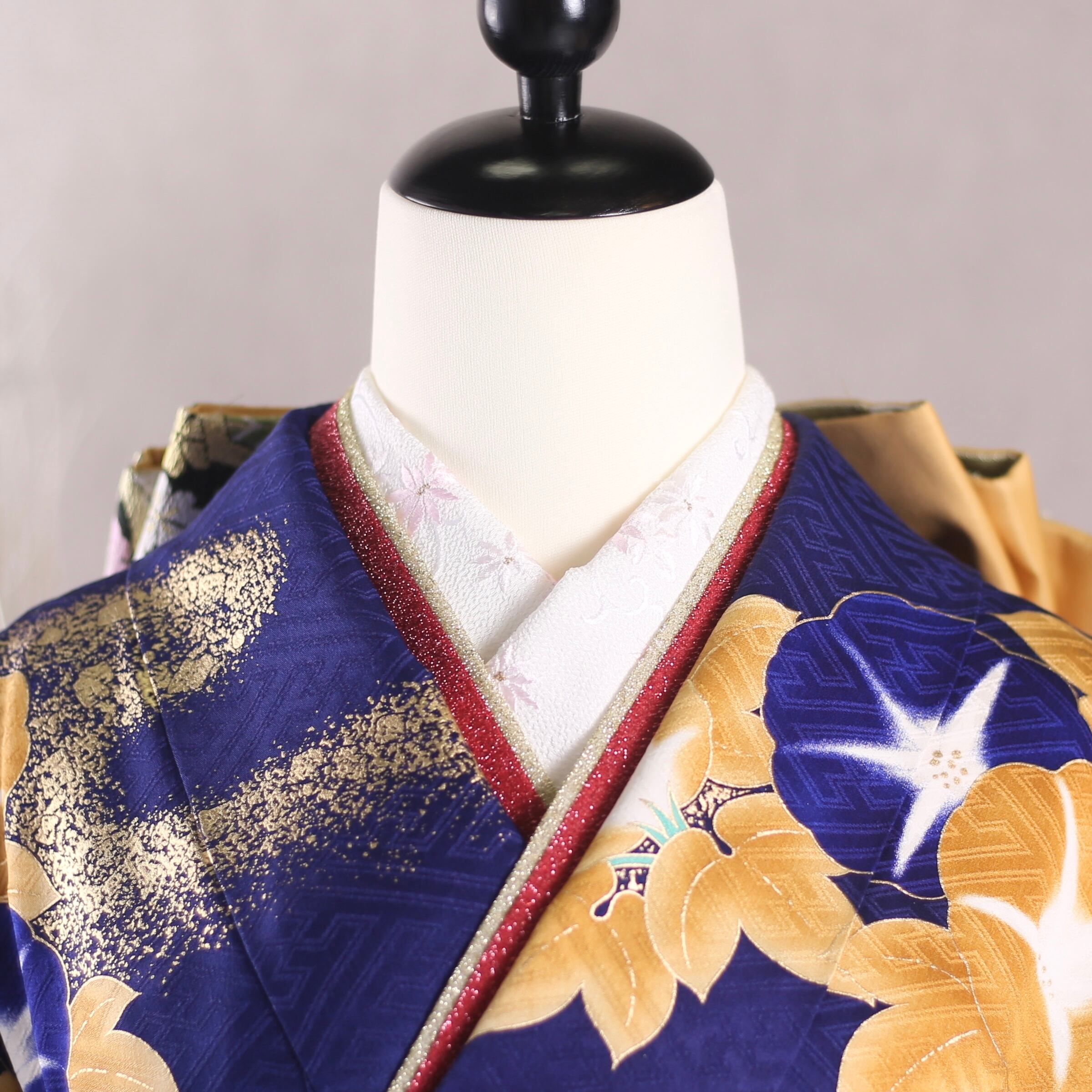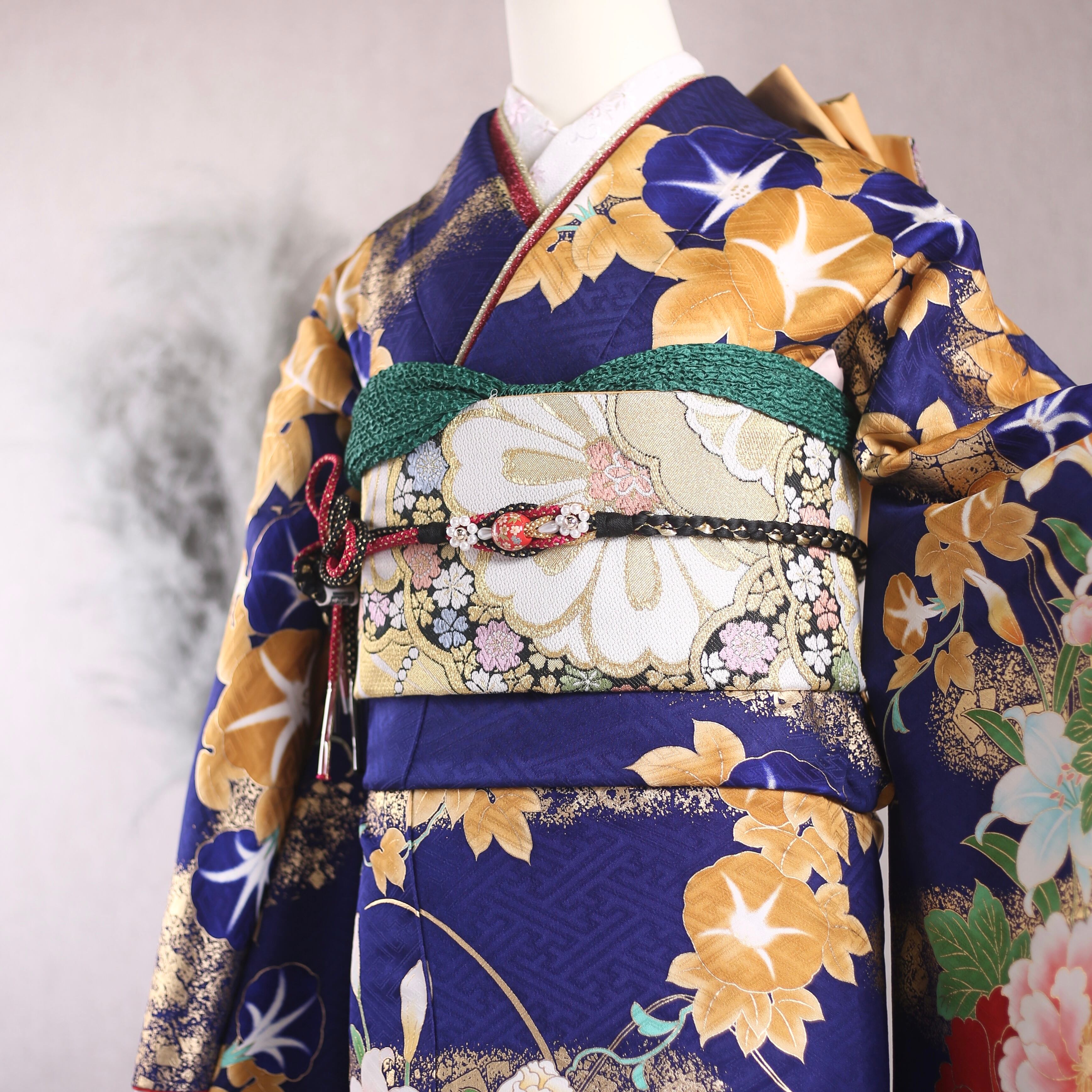 聡明さが際立つ青地に朝顔が印象的なモダンな振袖です。