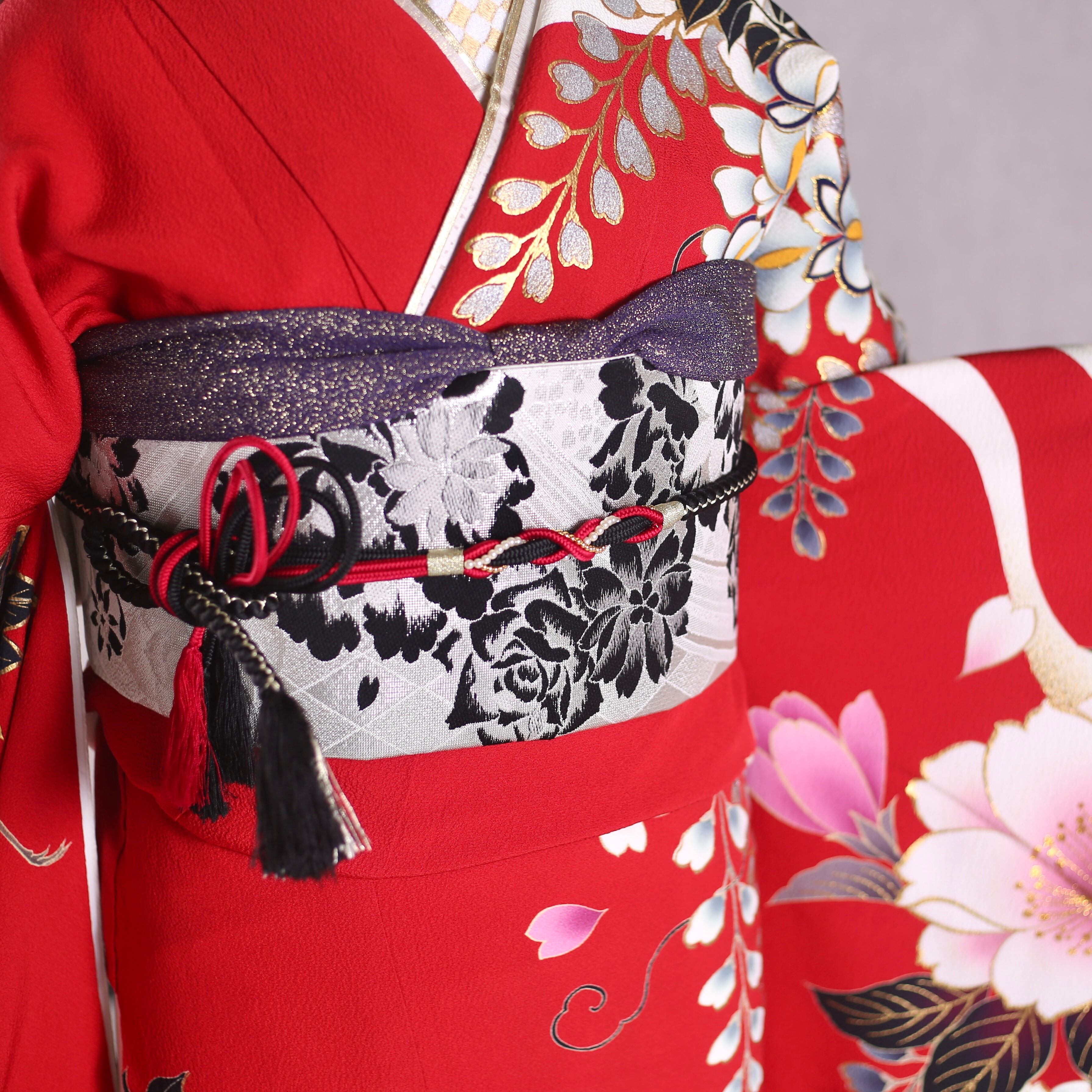 振袖フルセット 振袖セット 振袖 LLサイズ 赤×モダン 美品 成人式 着物 晴れ着 7点フルセット KF-150