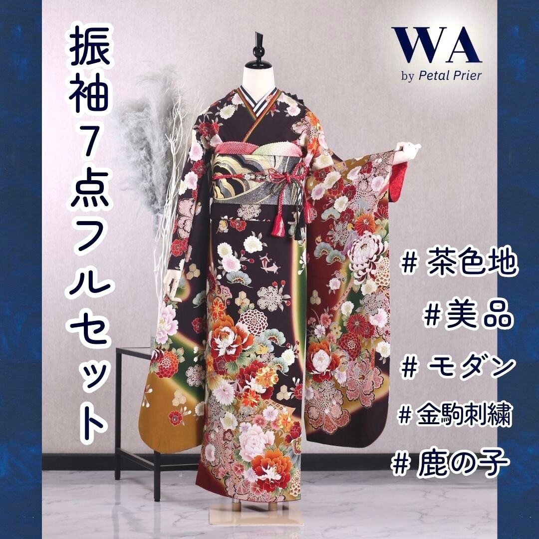 振袖フルセット 振袖セット 振袖 M〜Lサイズ 茶×モダン 美品 成人式 着物 晴れ着 7点フルセット KF-161
