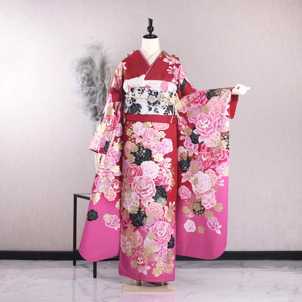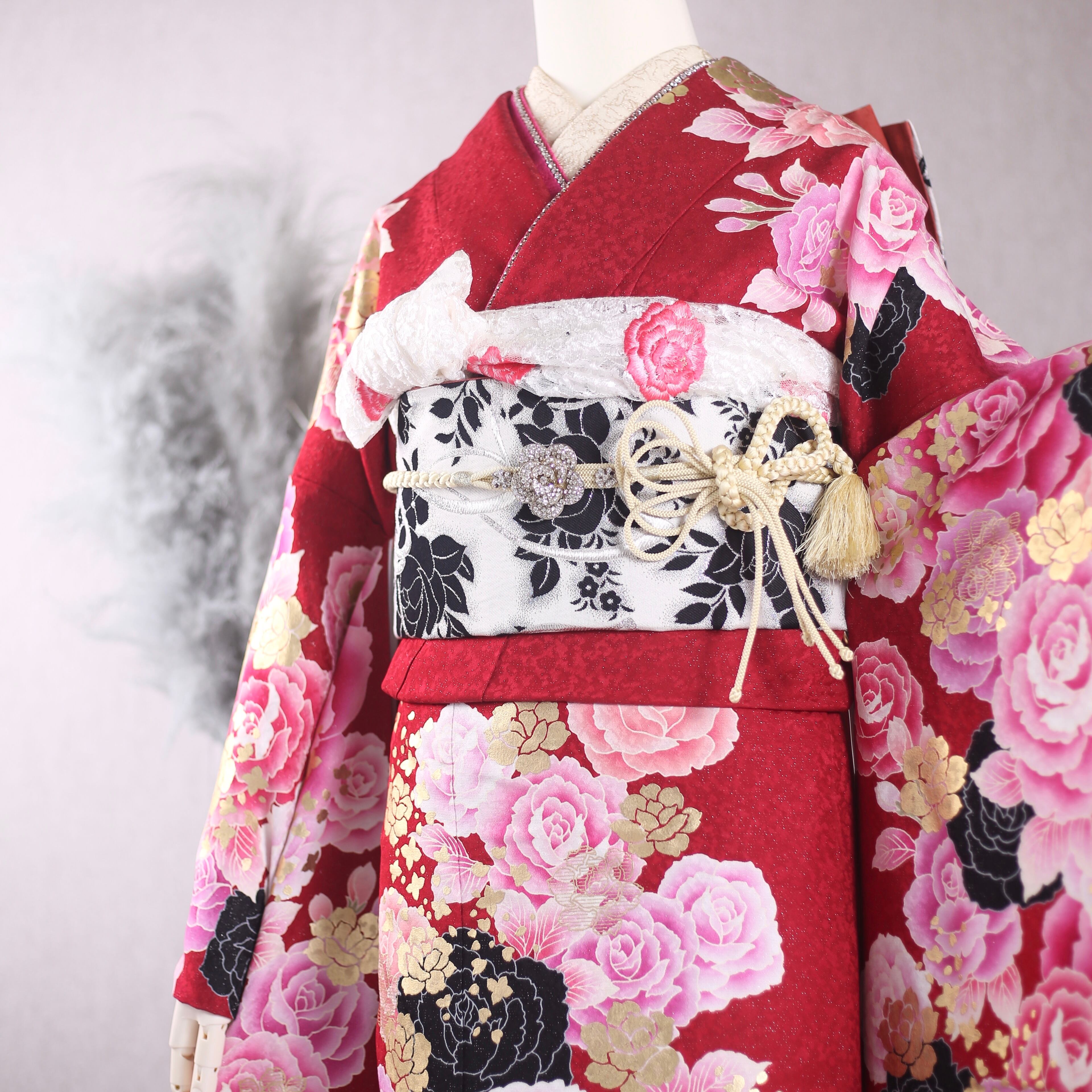 振袖フルセット 振袖セット 振袖 LLサイズ 赤×バラ 美品 成人式 着物 晴れ着 7点フルセット KF-170