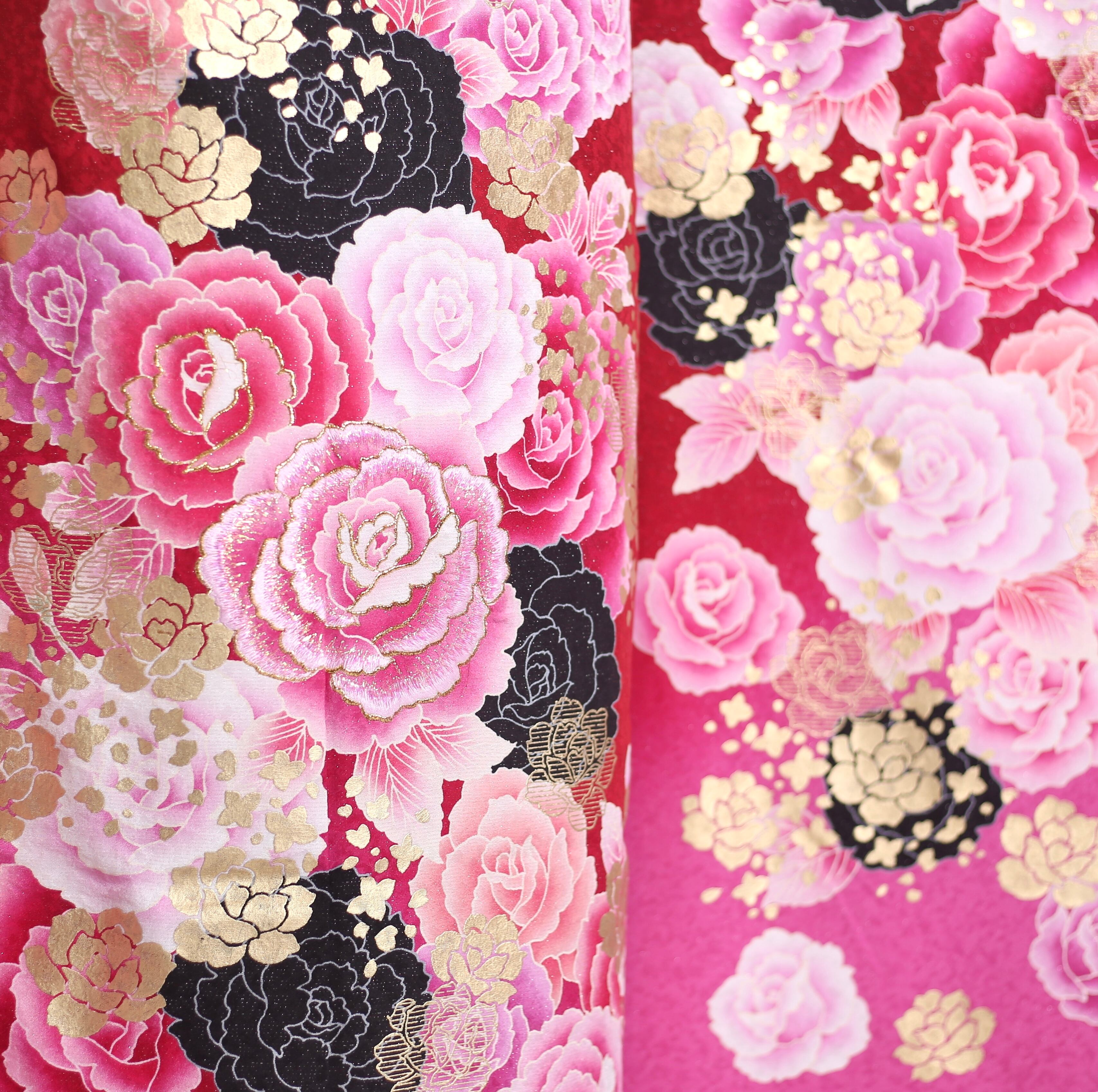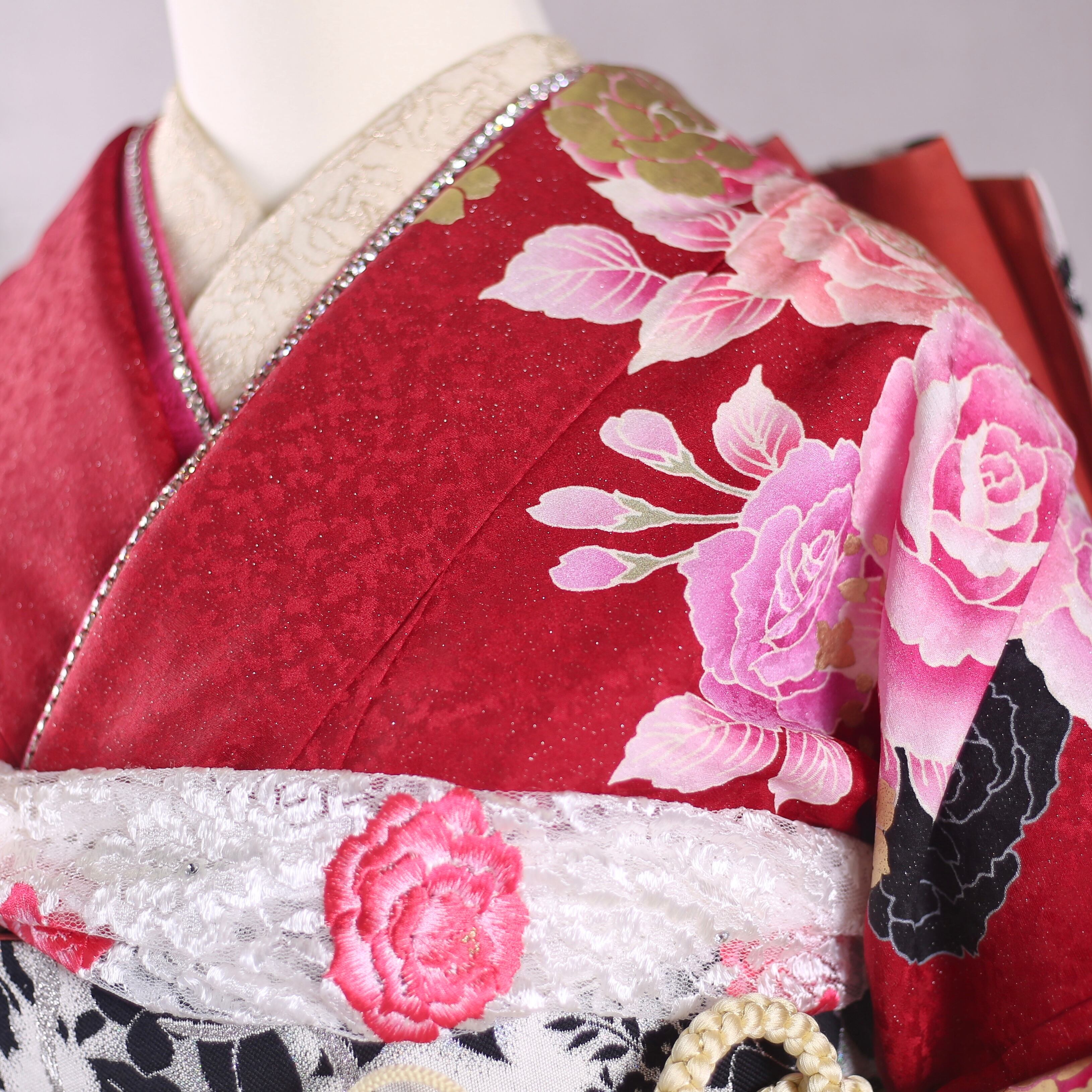 赤地に豪華な薔薇がたくさん入っている華やかな振袖です。