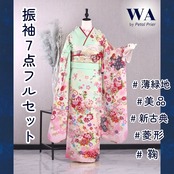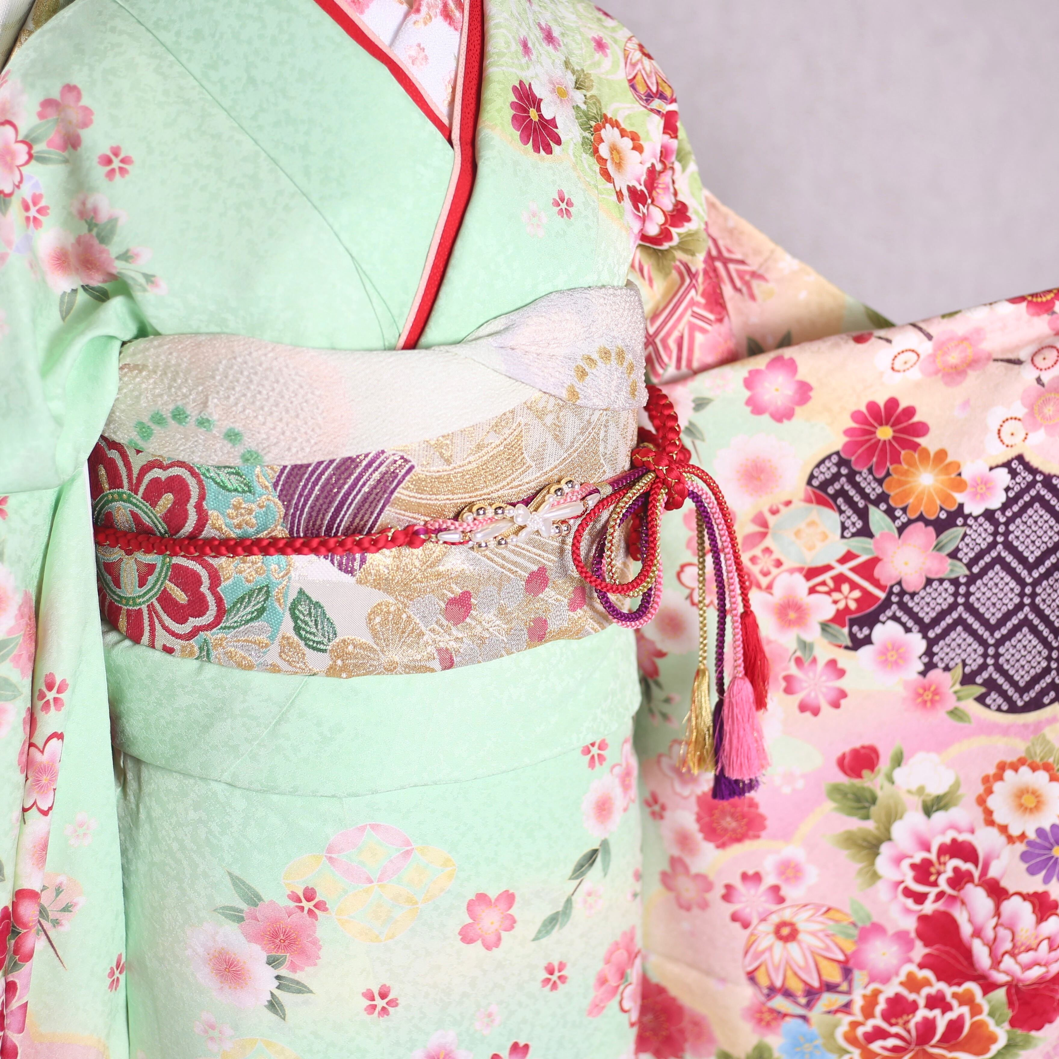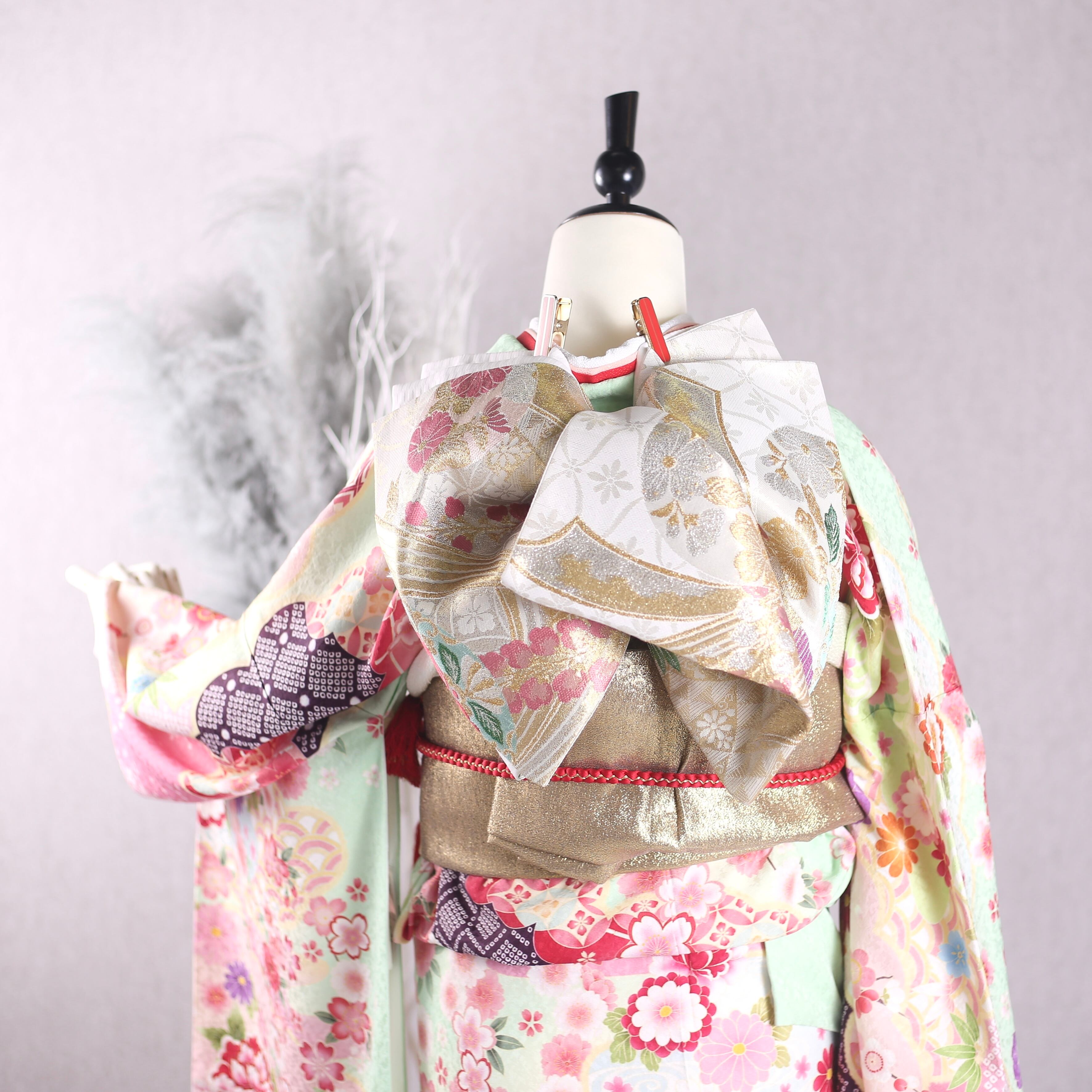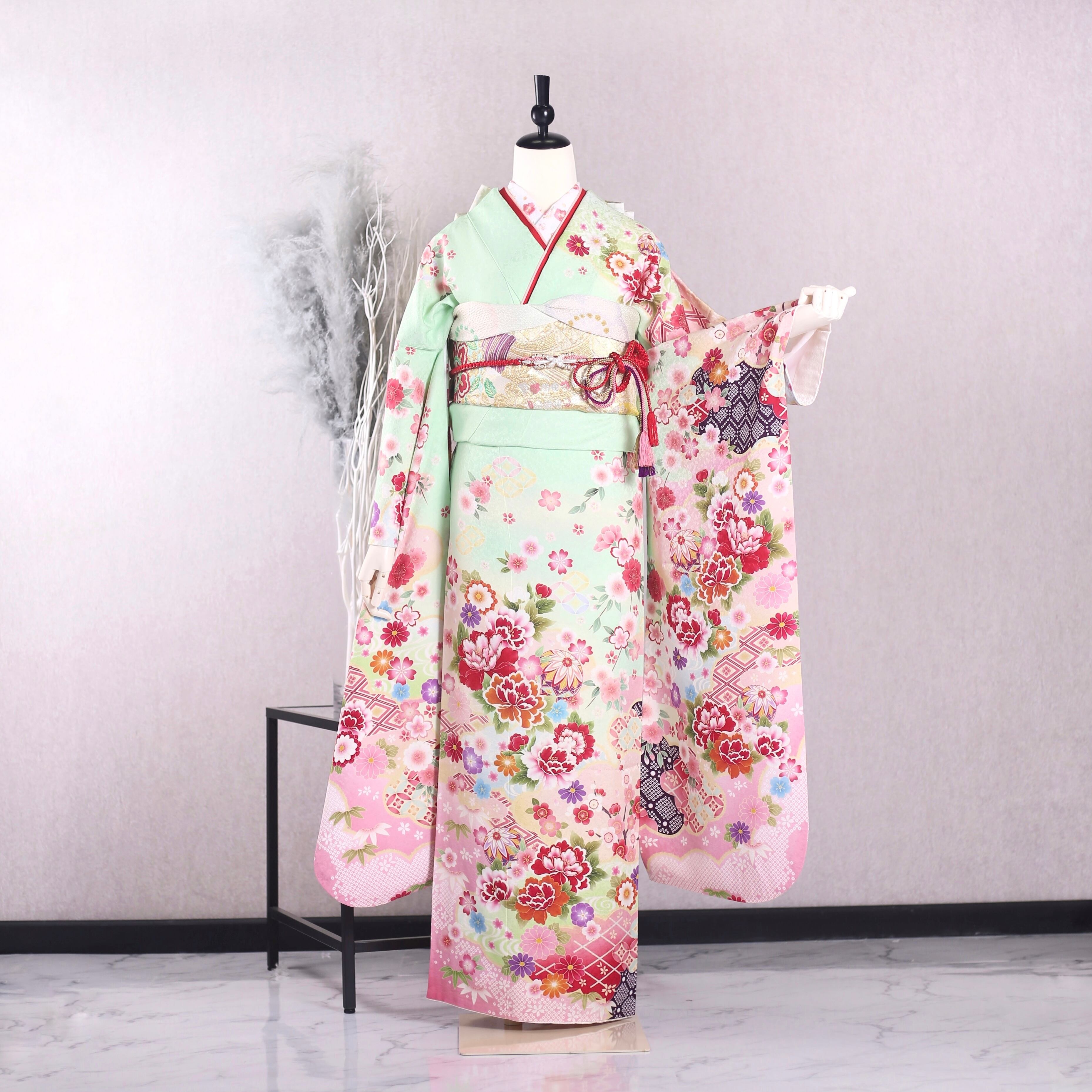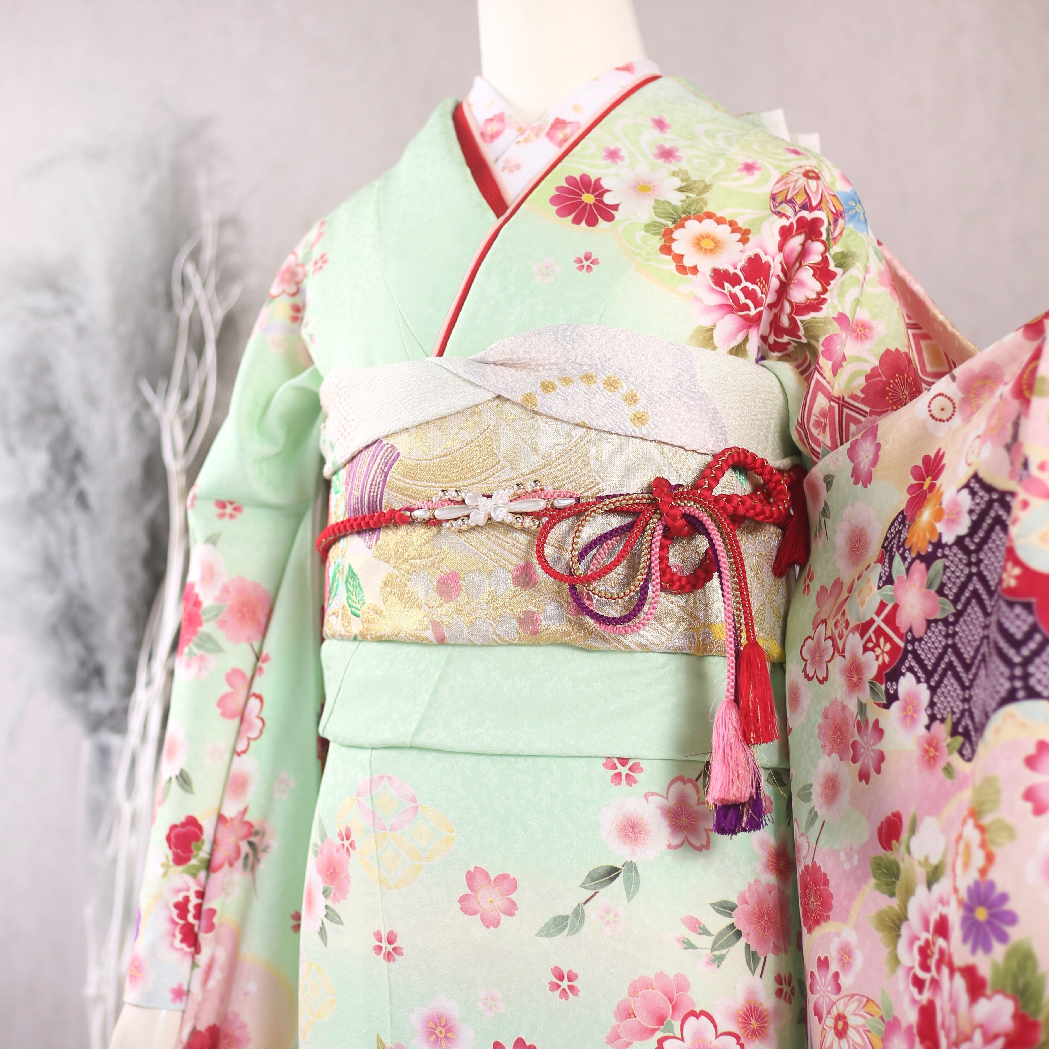 振袖フルセット 振袖セット 振袖 Lサイズ 薄緑×新古典 美品 成人式 着物 晴れ着 7点フルセット KF-156