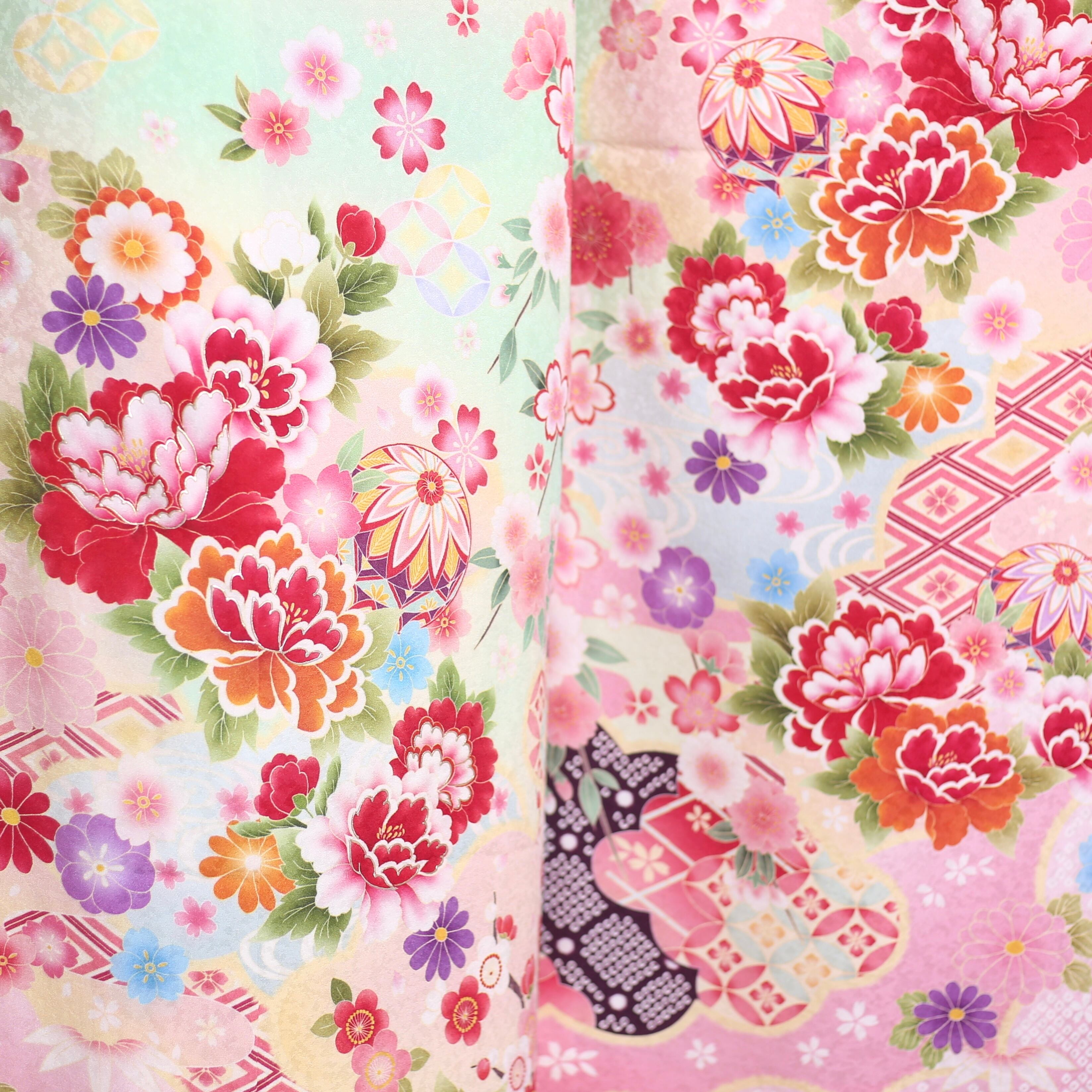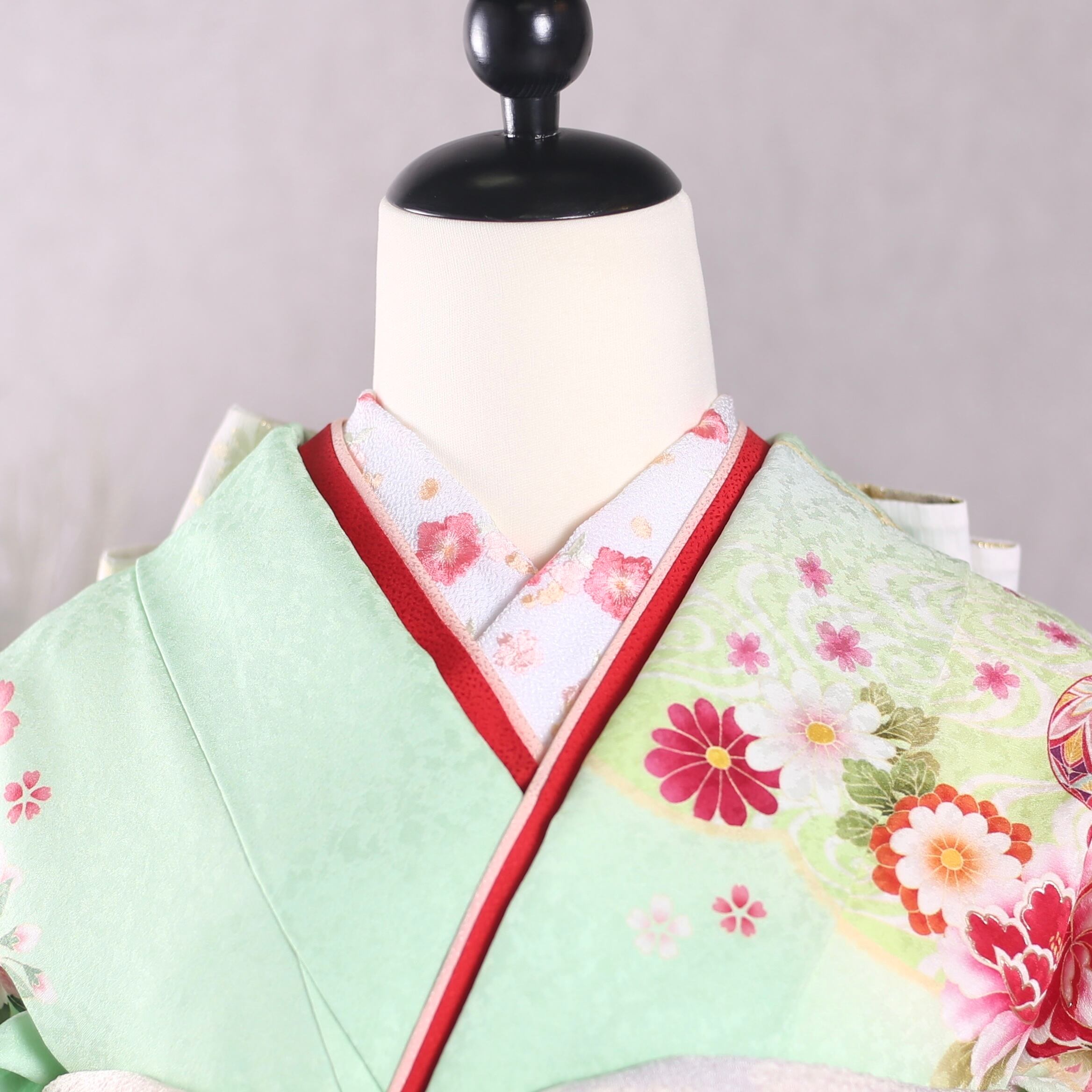 ミントカラーに菱形や鞠が映える新古典振袖です。