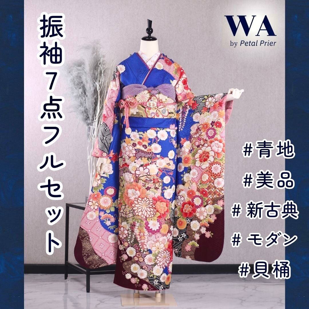 振袖フルセット 振袖セット 振袖 Lサイズ 青×新古典 美品 成人式 着物 晴れ着 7点フルセット KF-151