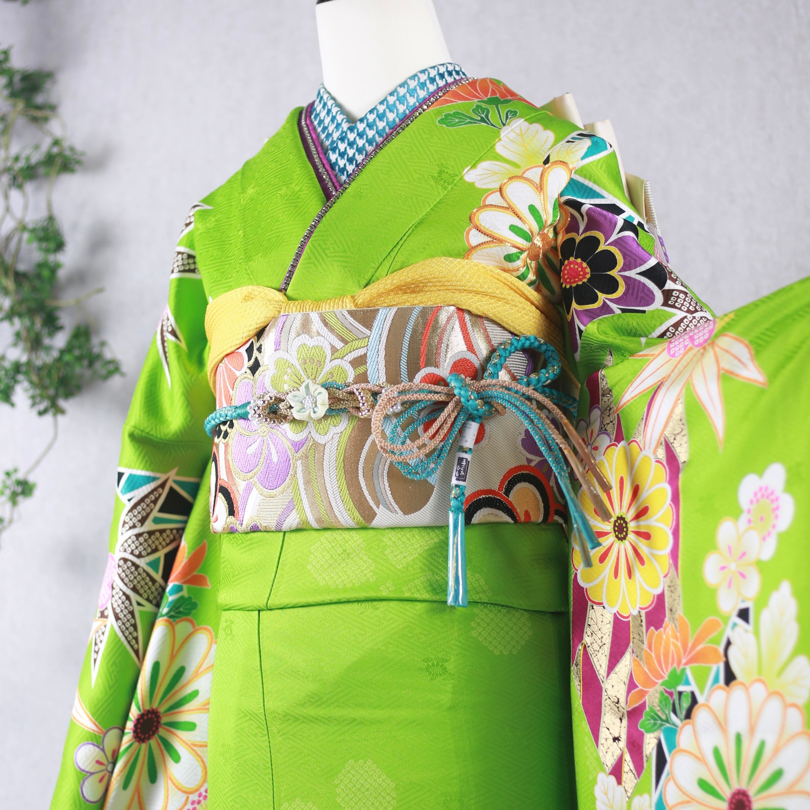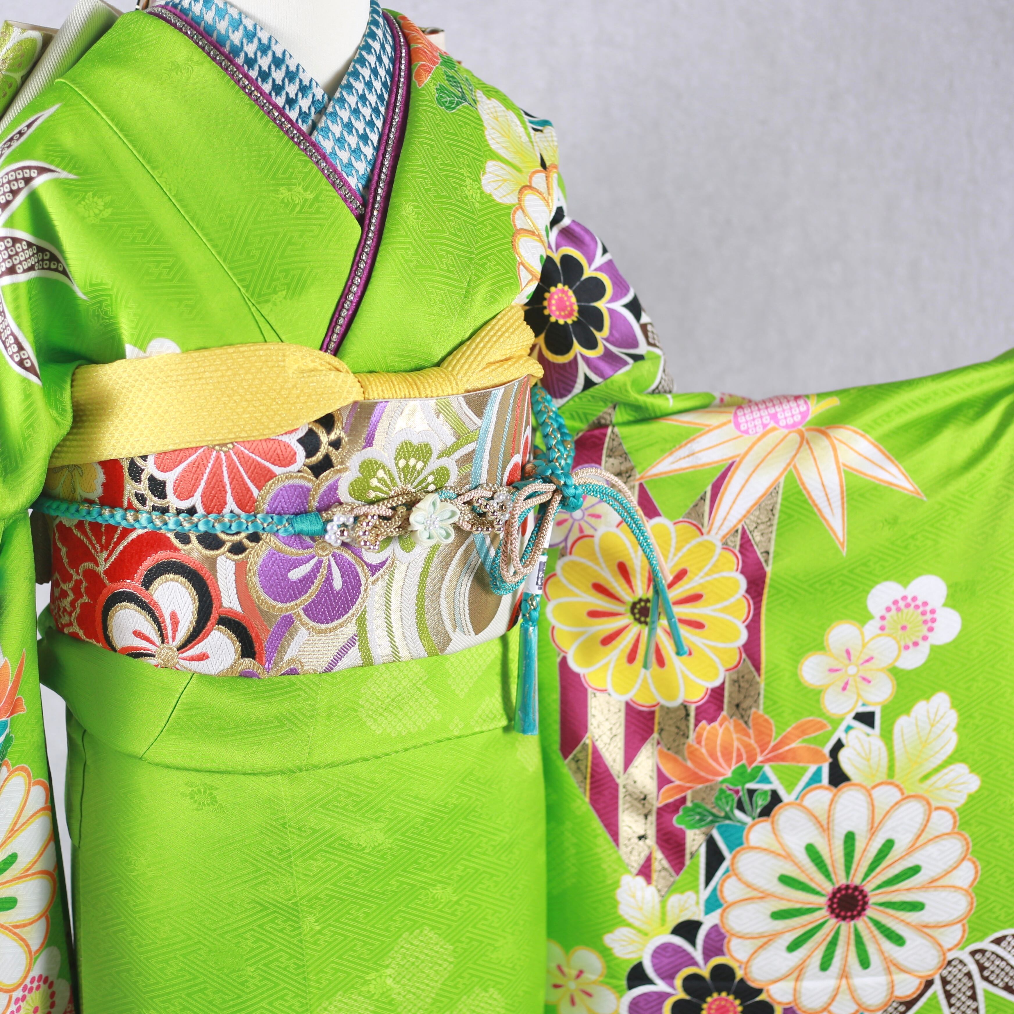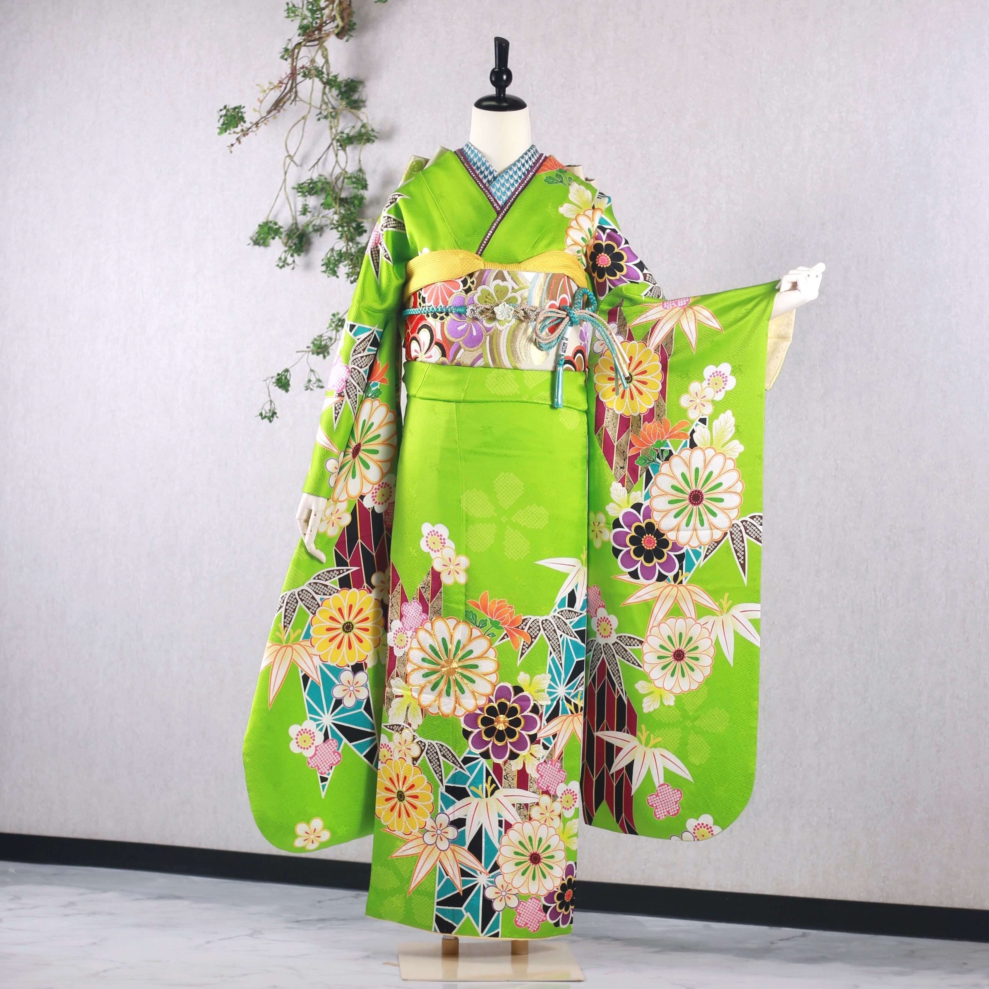 鮮やかな黄緑地にレトロな柄で周りと振袖に差をつけたい方にオススメです。