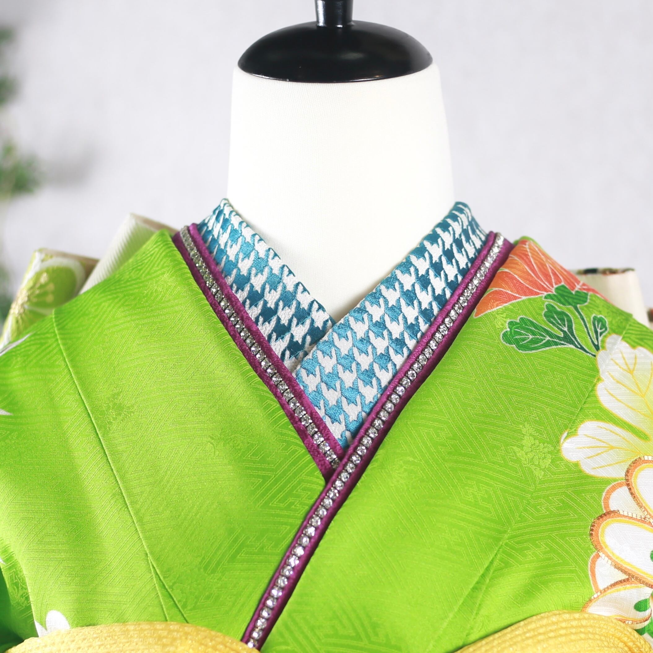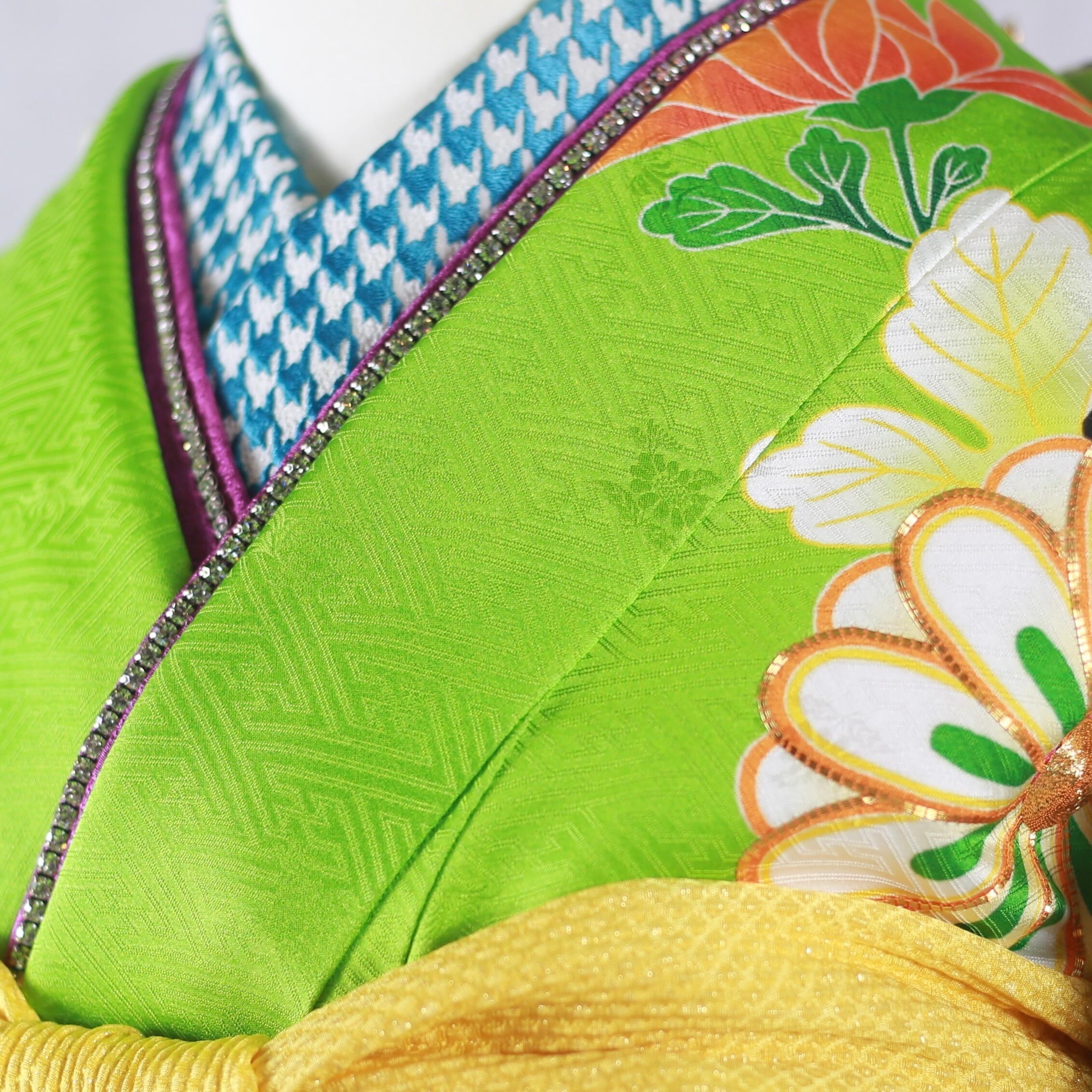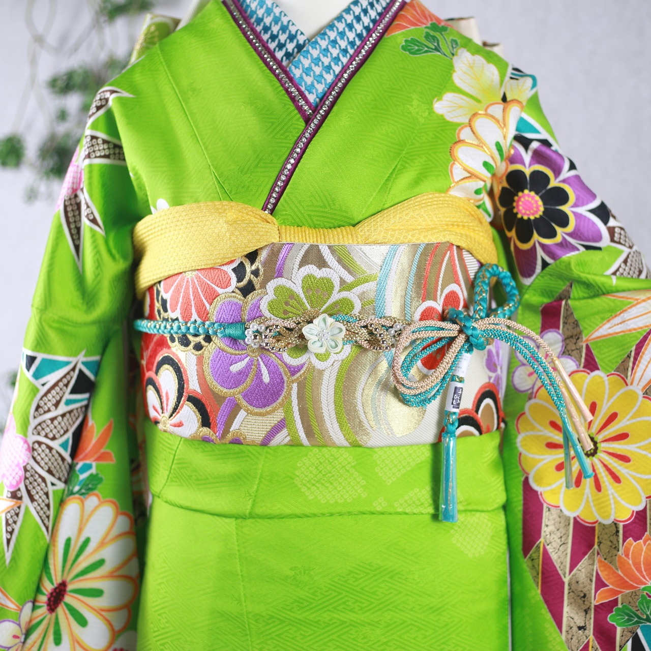 鮮やかな黄緑地にレトロな柄で周りと振袖に差をつけたい方にオススメです。