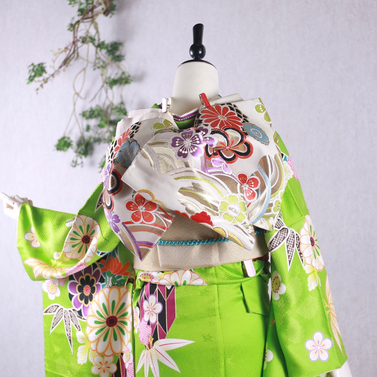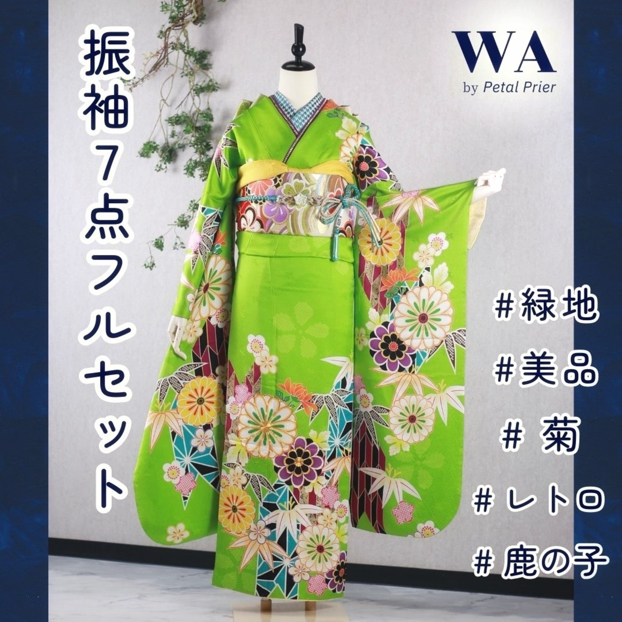 振袖フルセット 振袖セット 振袖 Lサイズ 黄緑×レトロ 美品 成人式 着物 晴れ着 7点フルセット KF-195