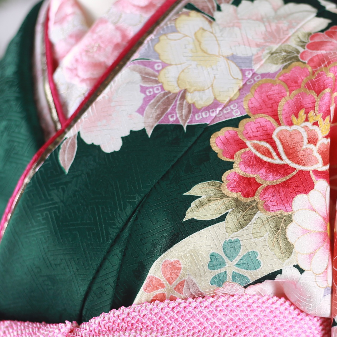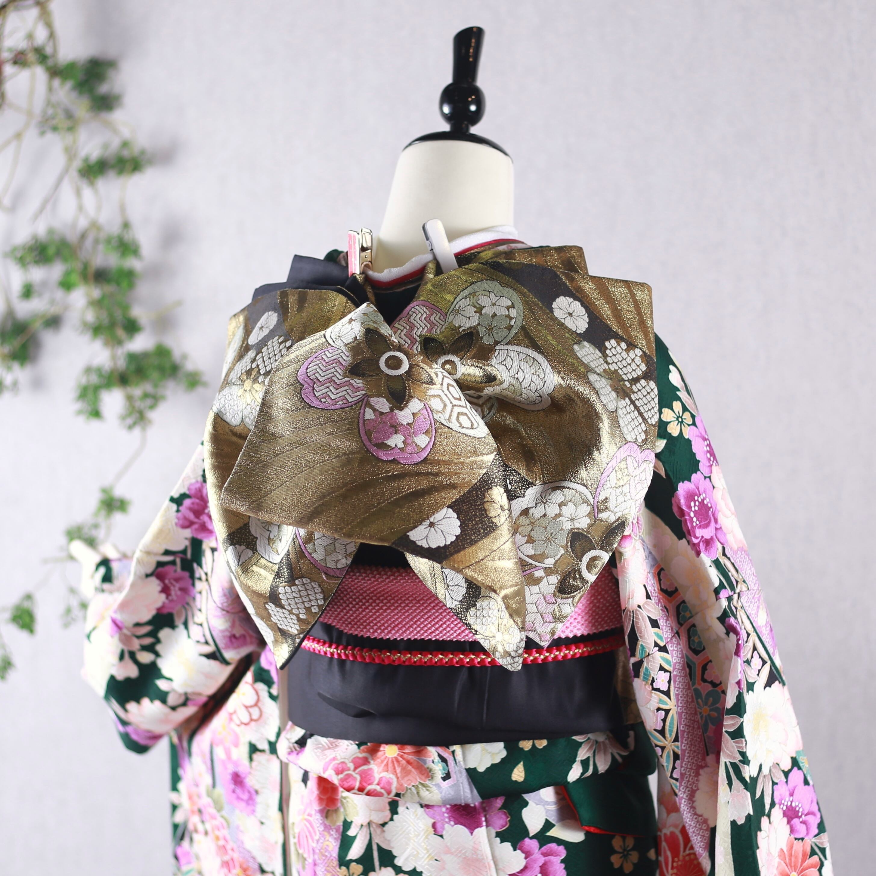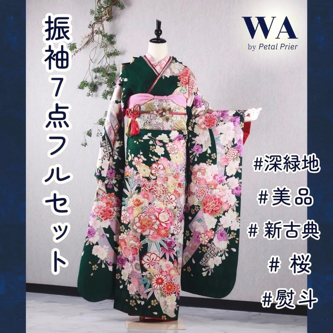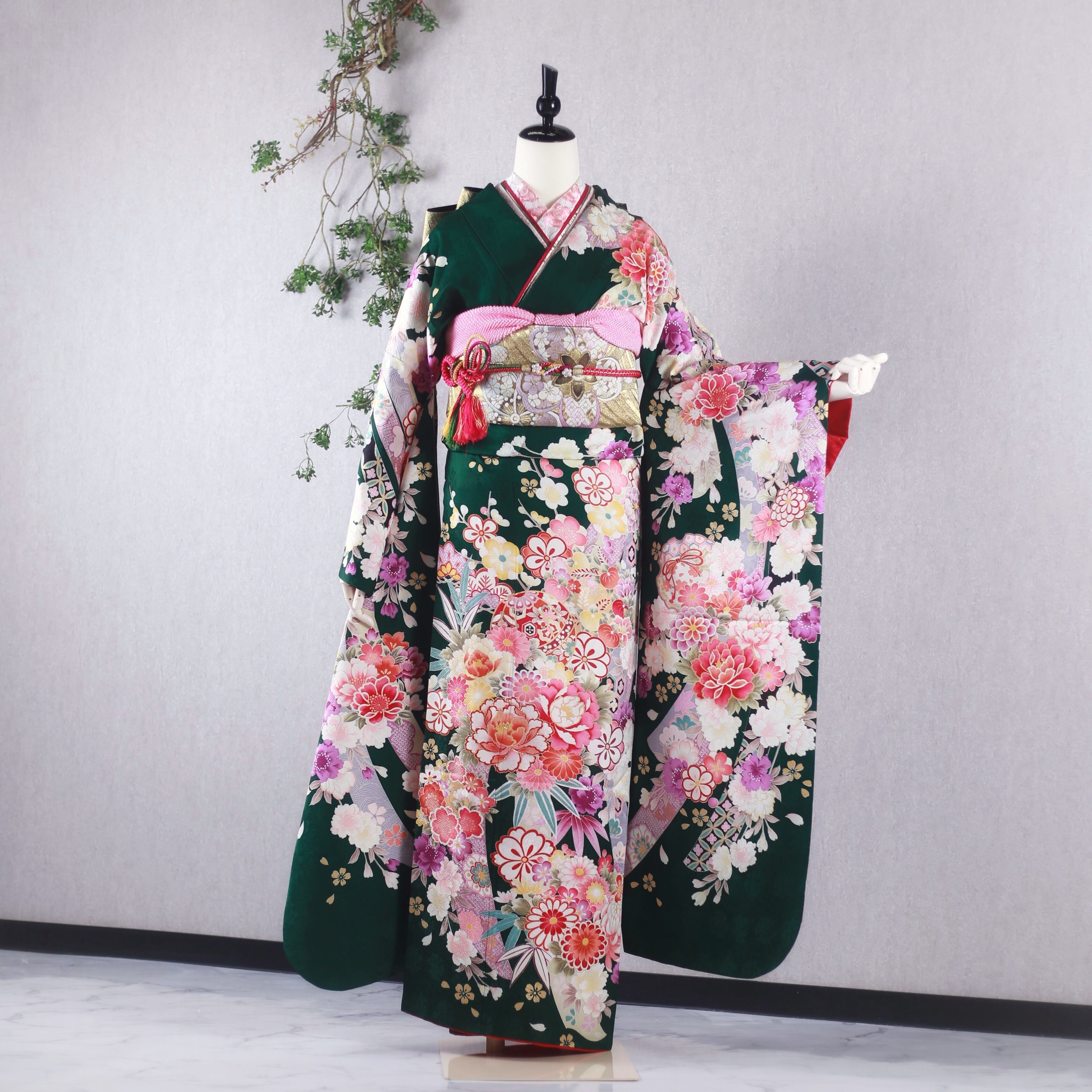 振袖フルセット 振袖セット 振袖 LLサイズ 深緑×新古典 美品 成人式 着物 晴れ着 7点フルセット KF-204
