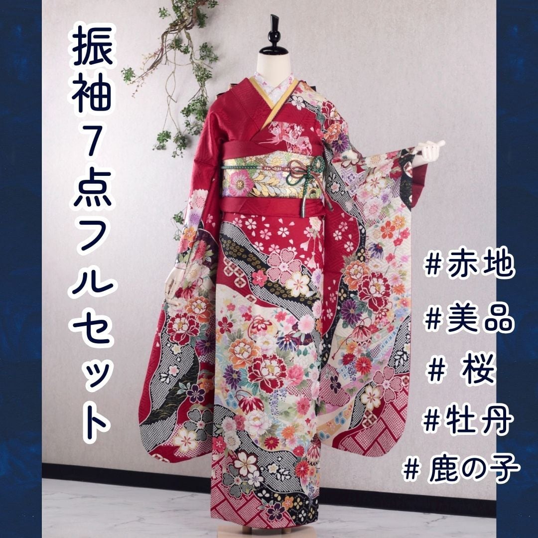振袖フルセット 振袖セット 振袖 Mサイズ 赤×桜 美品 成人式 着物 晴れ着 7点フルセット F-303