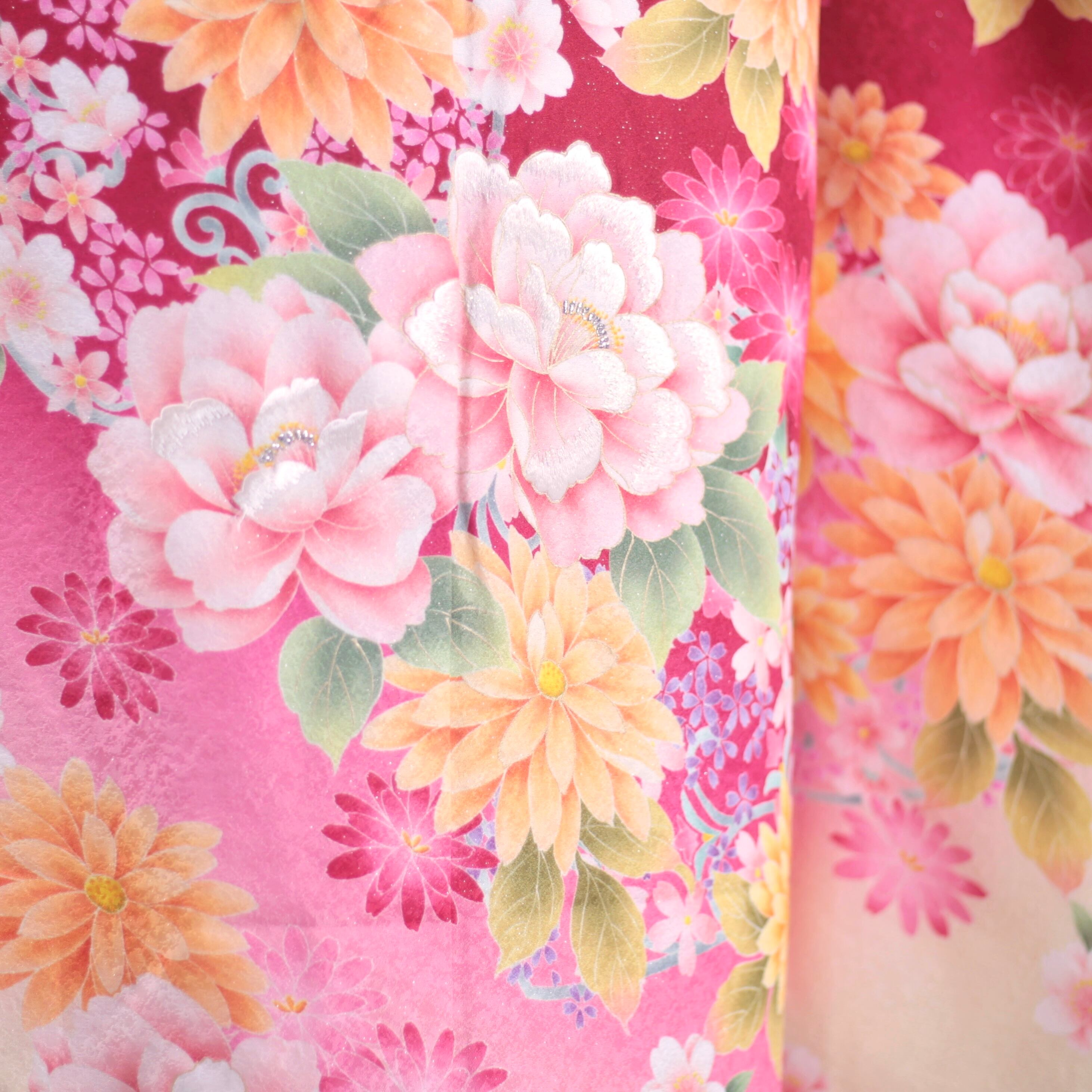 深みのあるピンク地に明るく鮮やかな牡丹が女性らしさを出してくれる一品です。