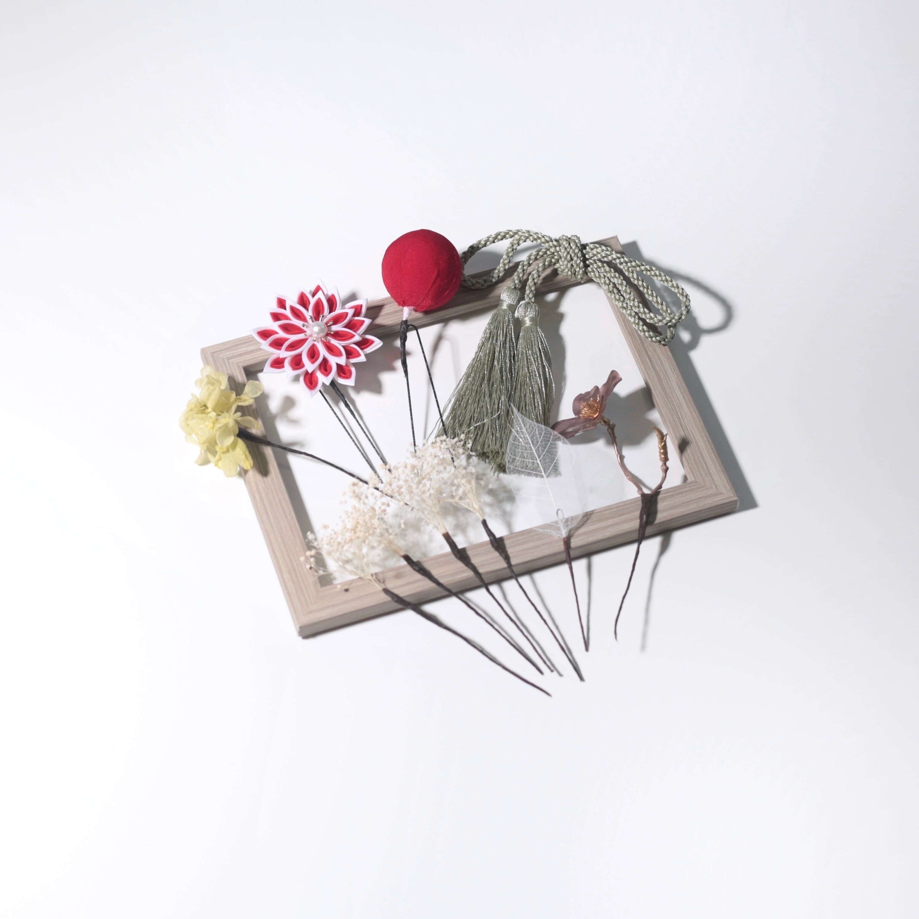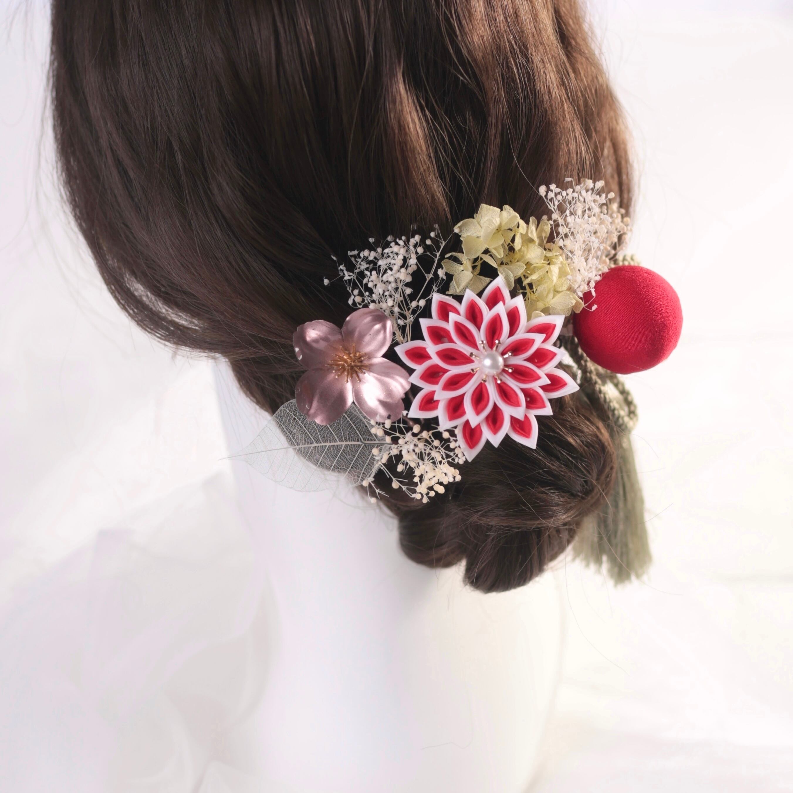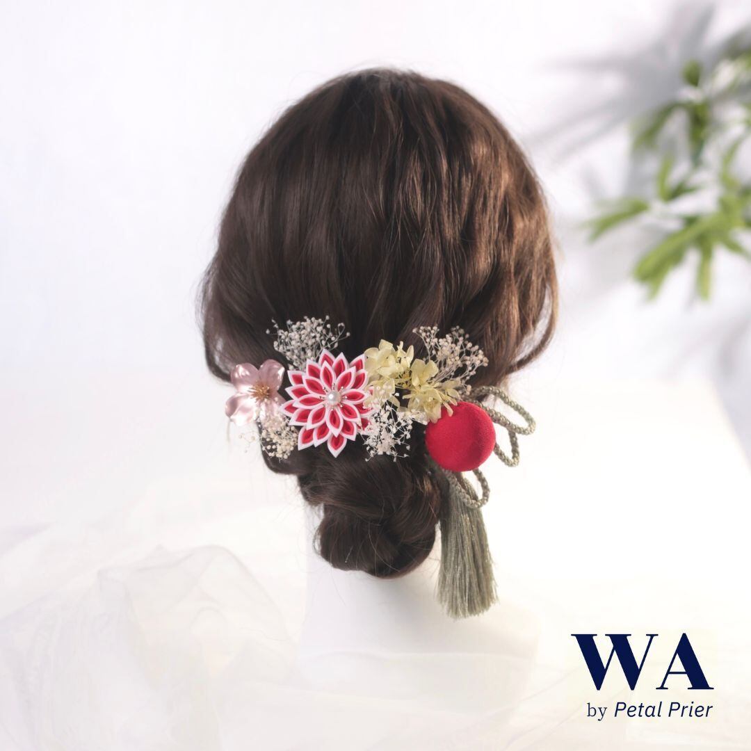 髪飾り 髪飾りセット 成人式 振袖 結婚式 ブライダル ヘッドドレス 卒業式 七五三 前撮り 赤 レッド 白 ホワイト 緑 グリーン カスミソウ あじさい つまみ細工 リーフ タッセル K-159 | WA by Petal Prier