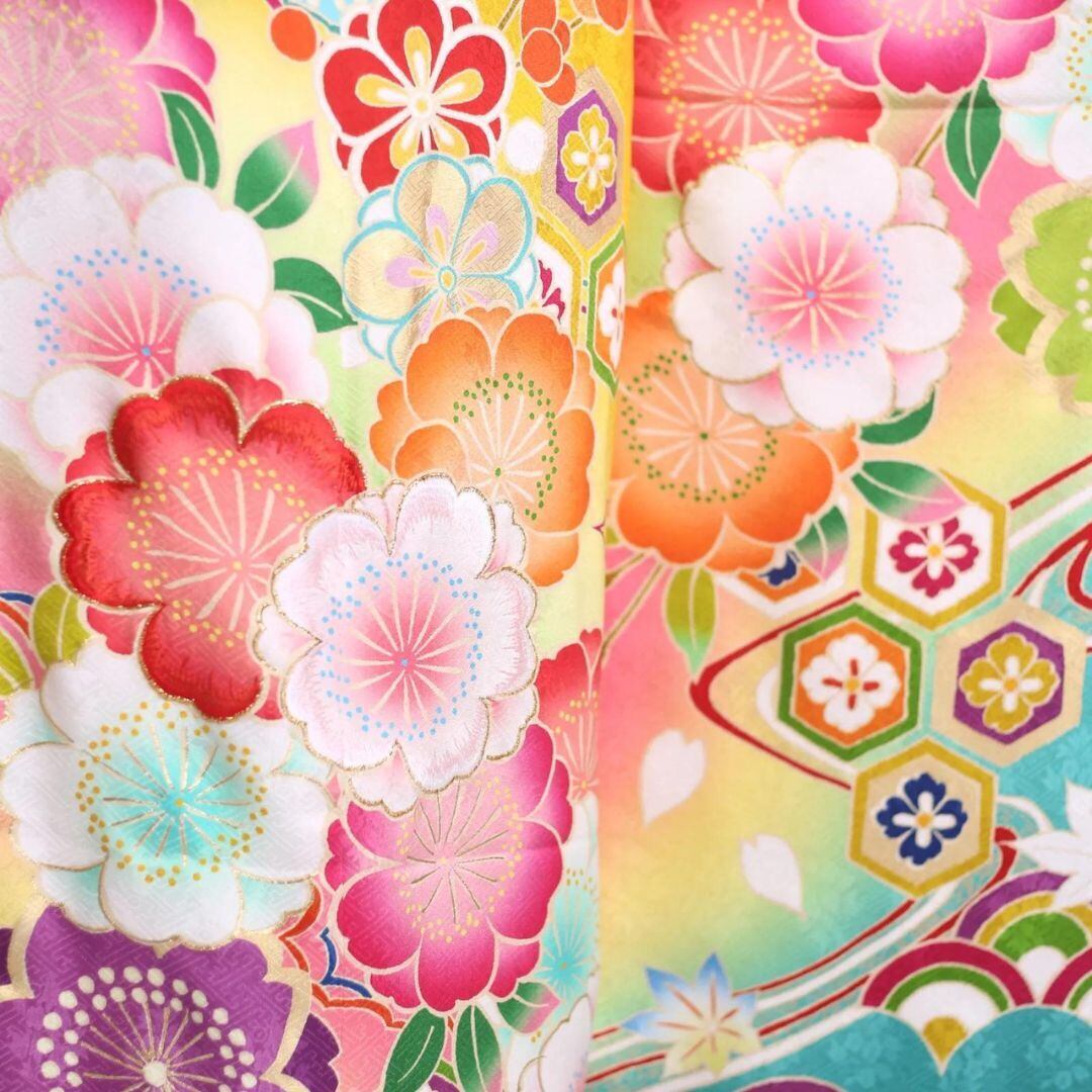 目を惹く黄色地に水色のぼかしが印象的なレトロポップ振袖です。