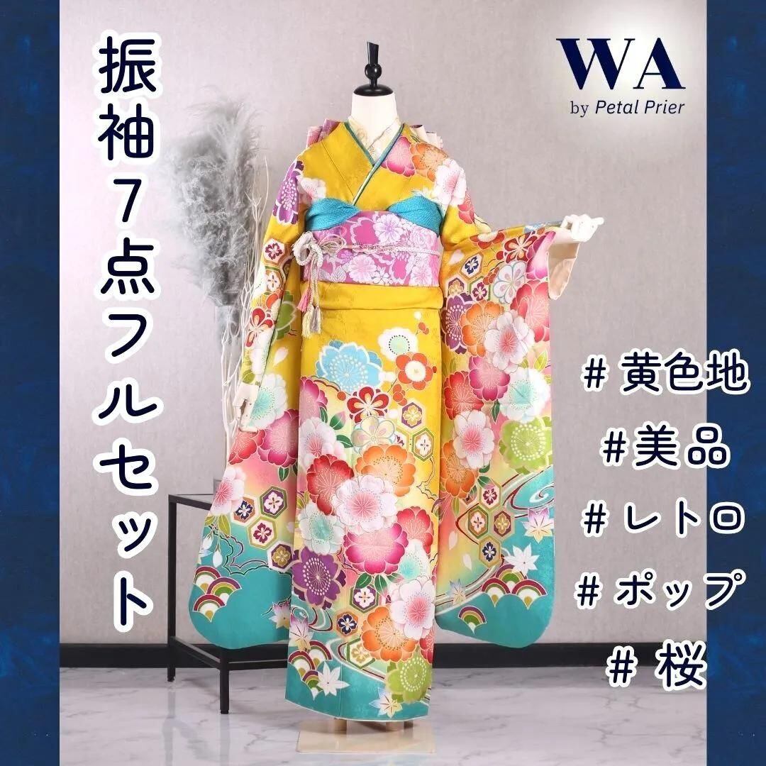 振袖フルセット 振袖セット 振袖 Lサイズ 黄×レトロポップ 美品 成人式 着物 晴れ着 7点フルセット KF-140