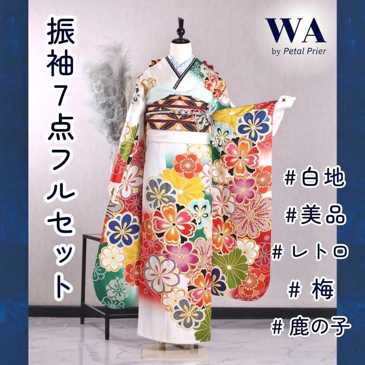 白地に鮮やかな梅や鹿の子が映えるレトロ振袖です。