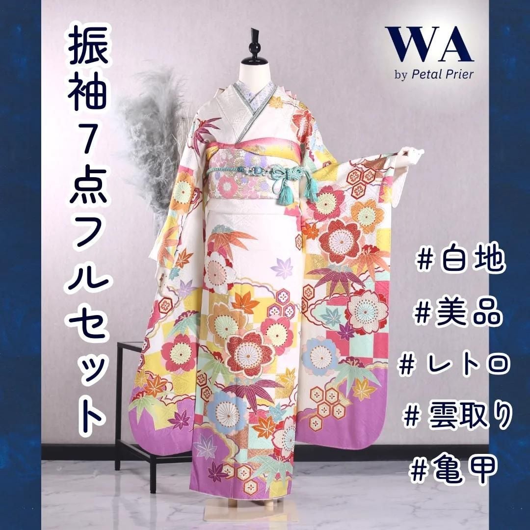振袖フルセット 振袖セット 振袖 Lサイズ 白×レトロ 美品 成人式 着物 晴れ着 7点フルセット KF-129