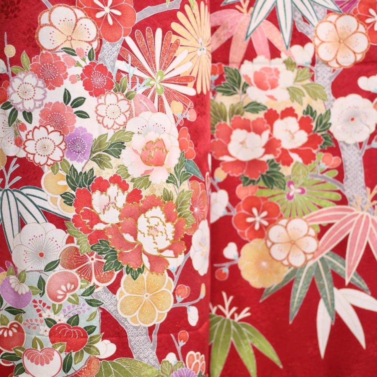 鮮やかな赤地に竹や牡丹が印象的な古典振袖です。