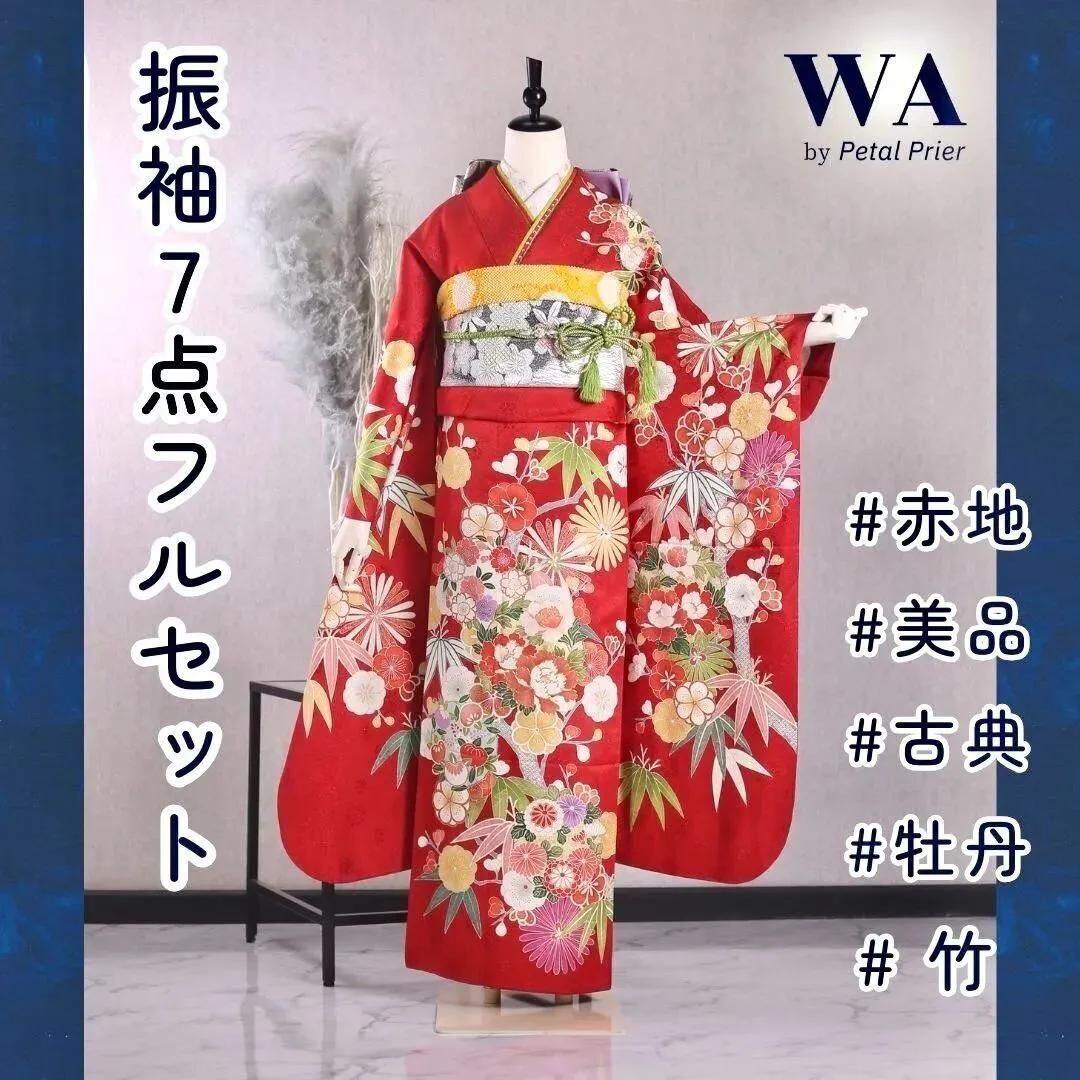 振袖フルセット 振袖セット 振袖 M〜Lサイズ 赤×古典 美品 成人式 着物 晴れ着 7点フルセット KF-138