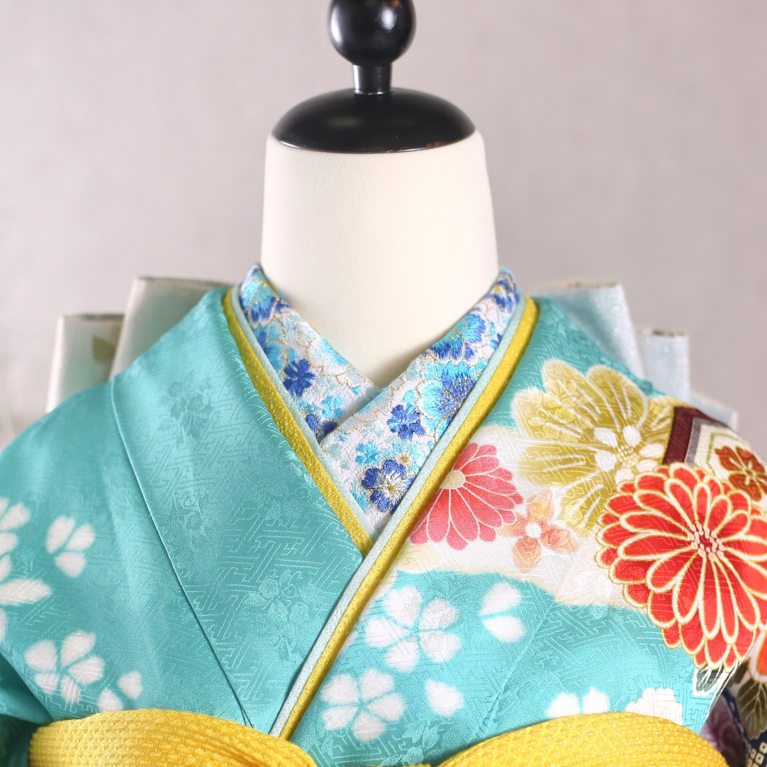 涼しげな水色地に菊柄や鹿の子が印象的な振袖です。