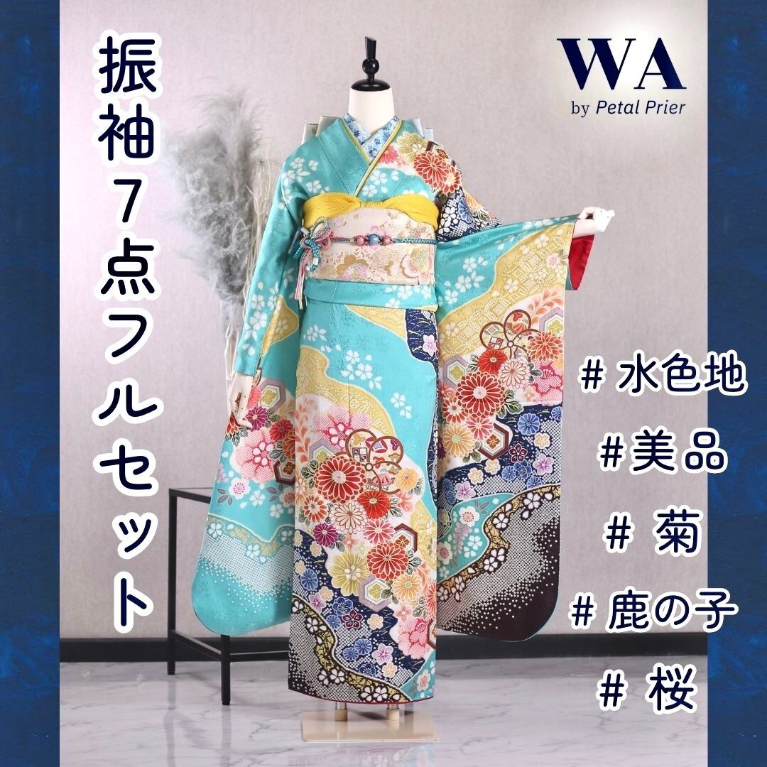 振袖フルセット 振袖セット 振袖 Lサイズ 水色×古典 美品 成人式 着物 晴れ着 7点フルセット KF-130