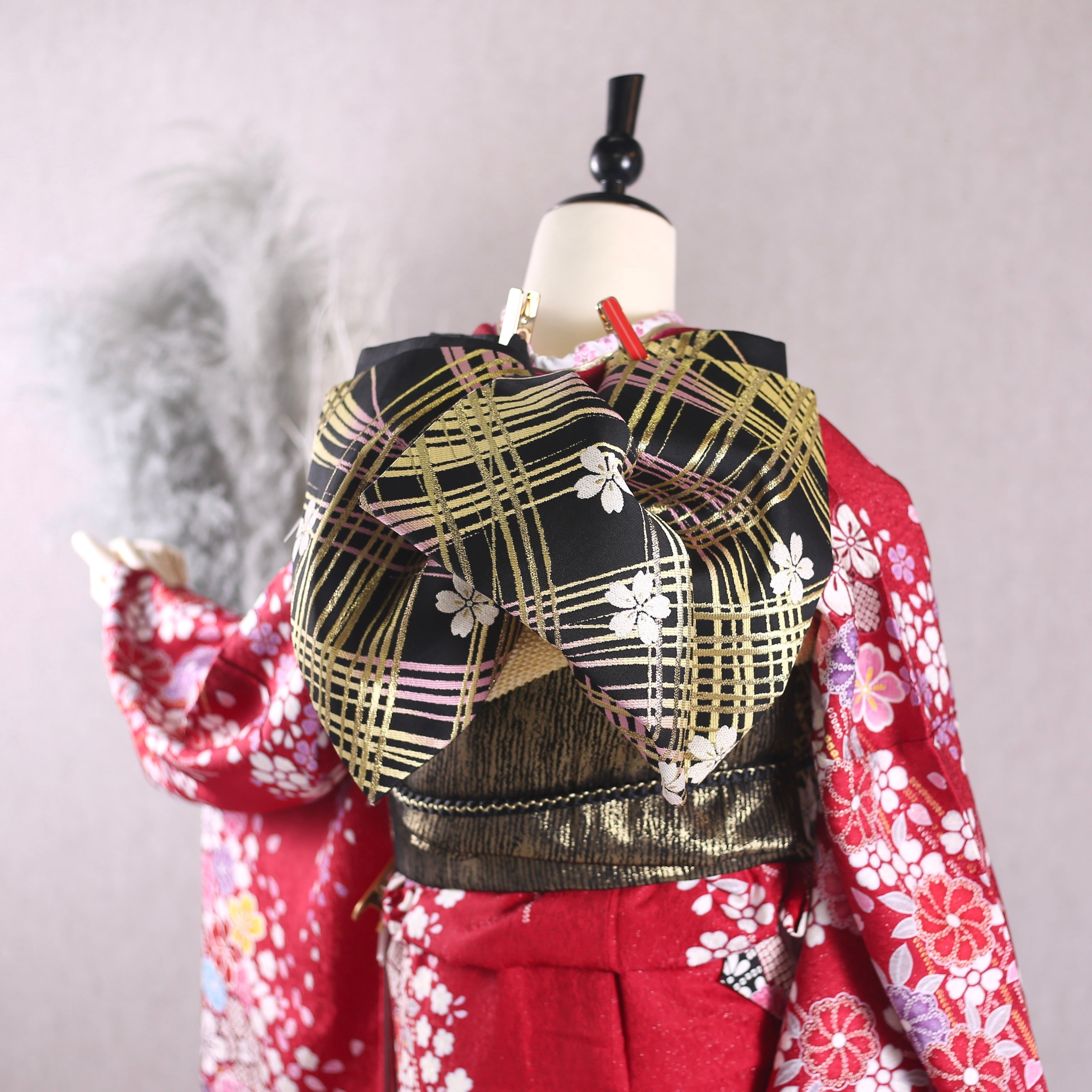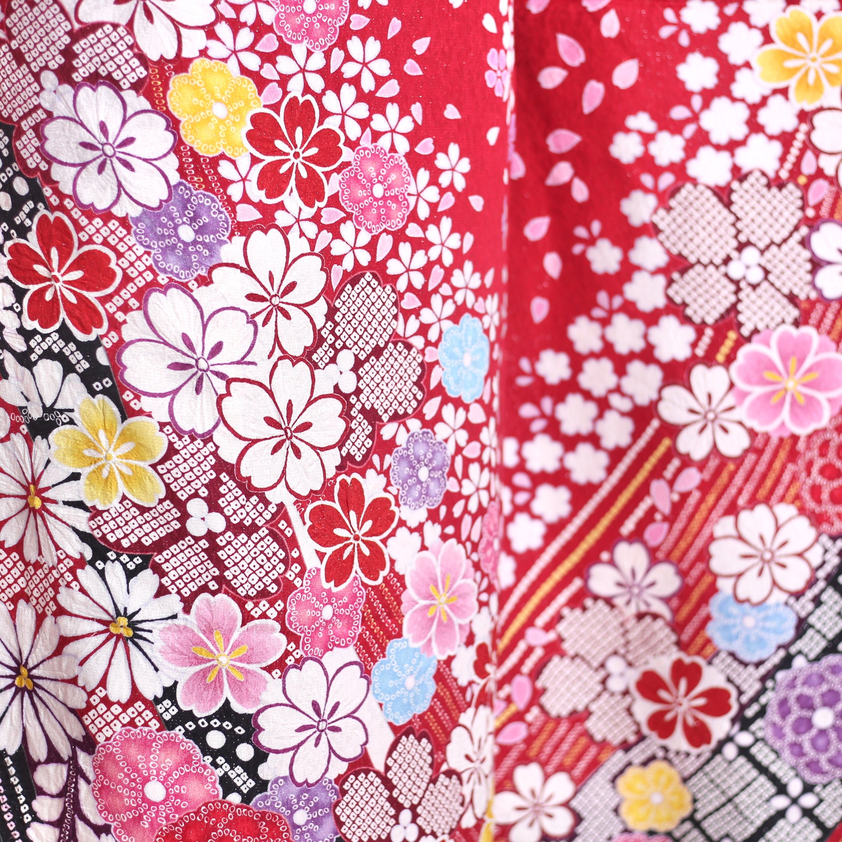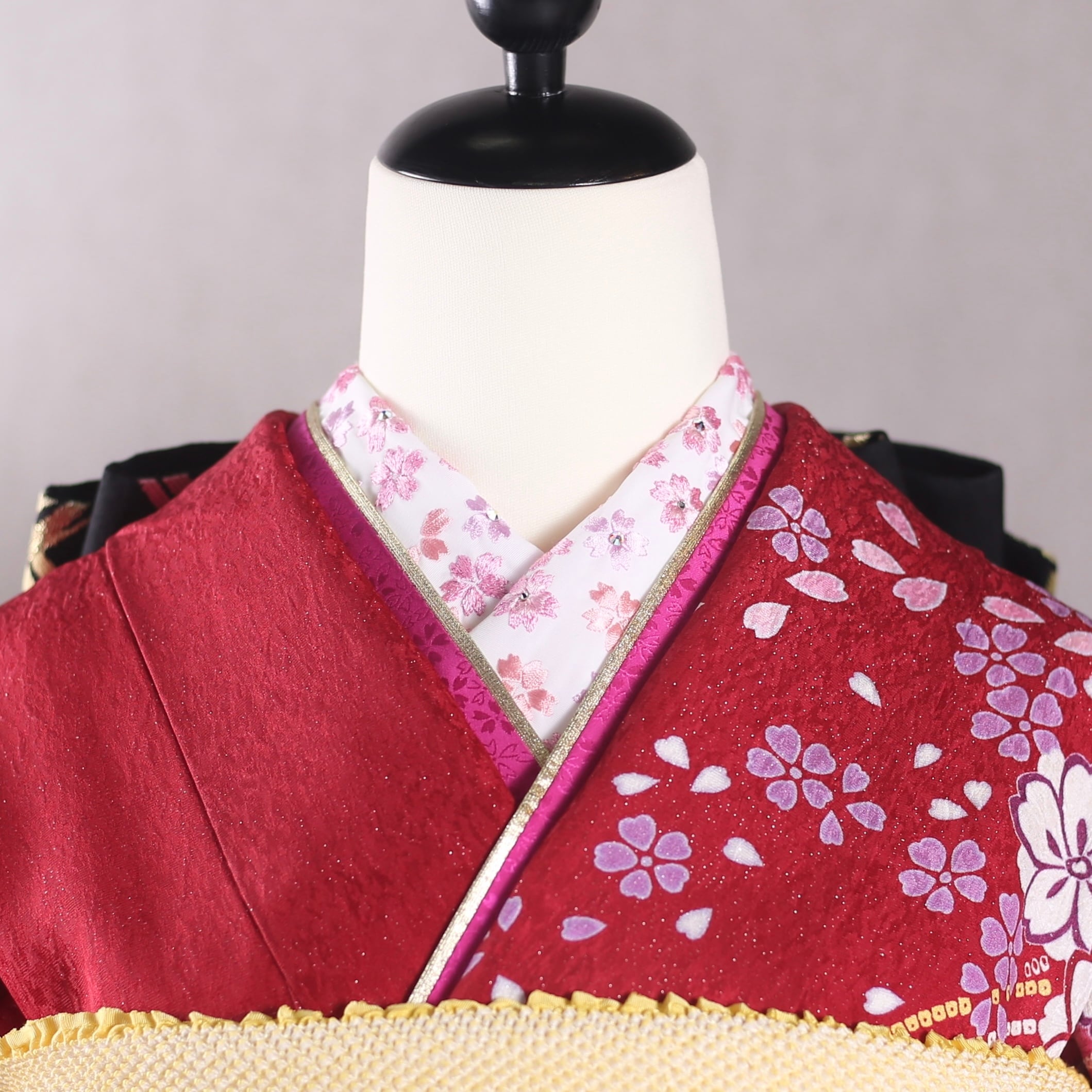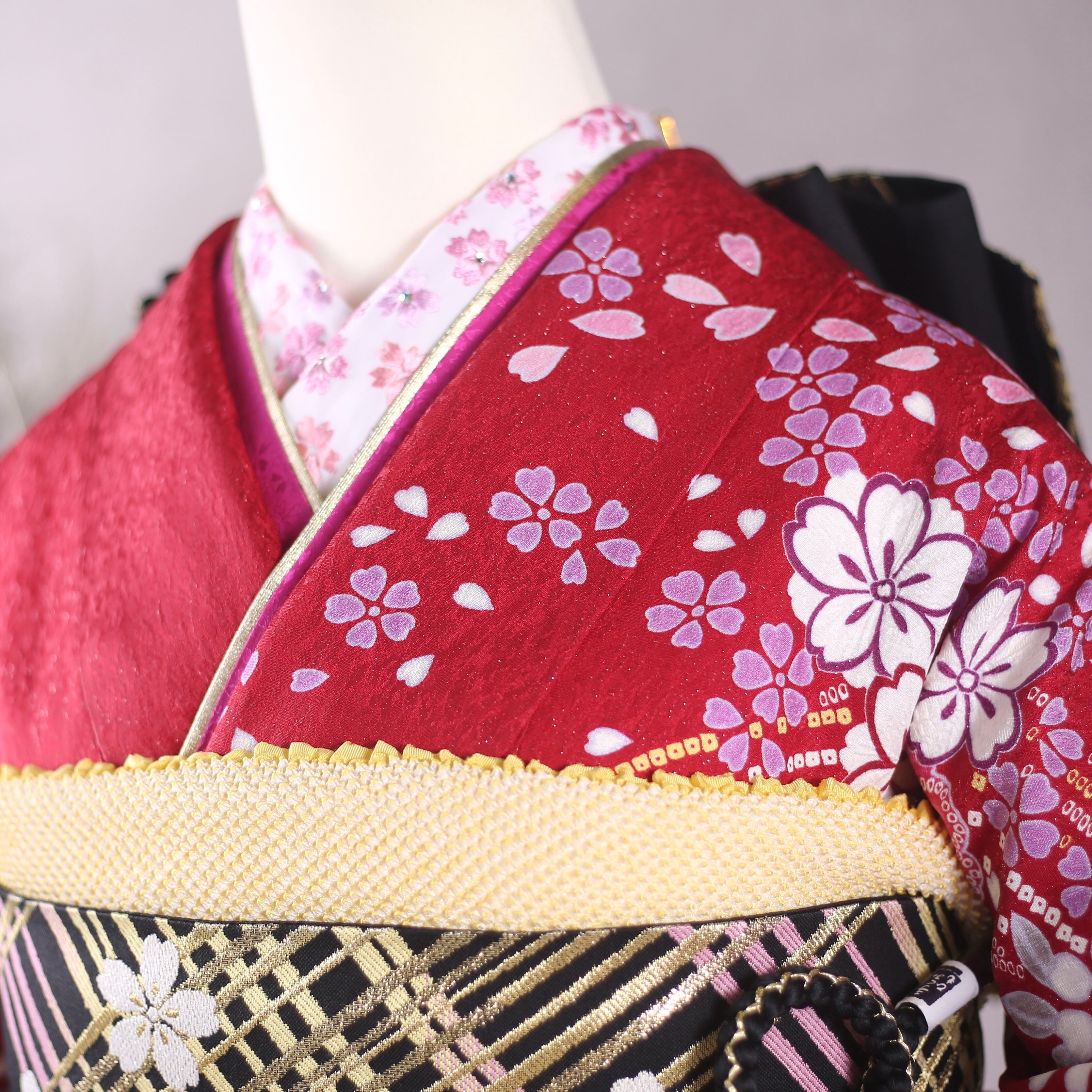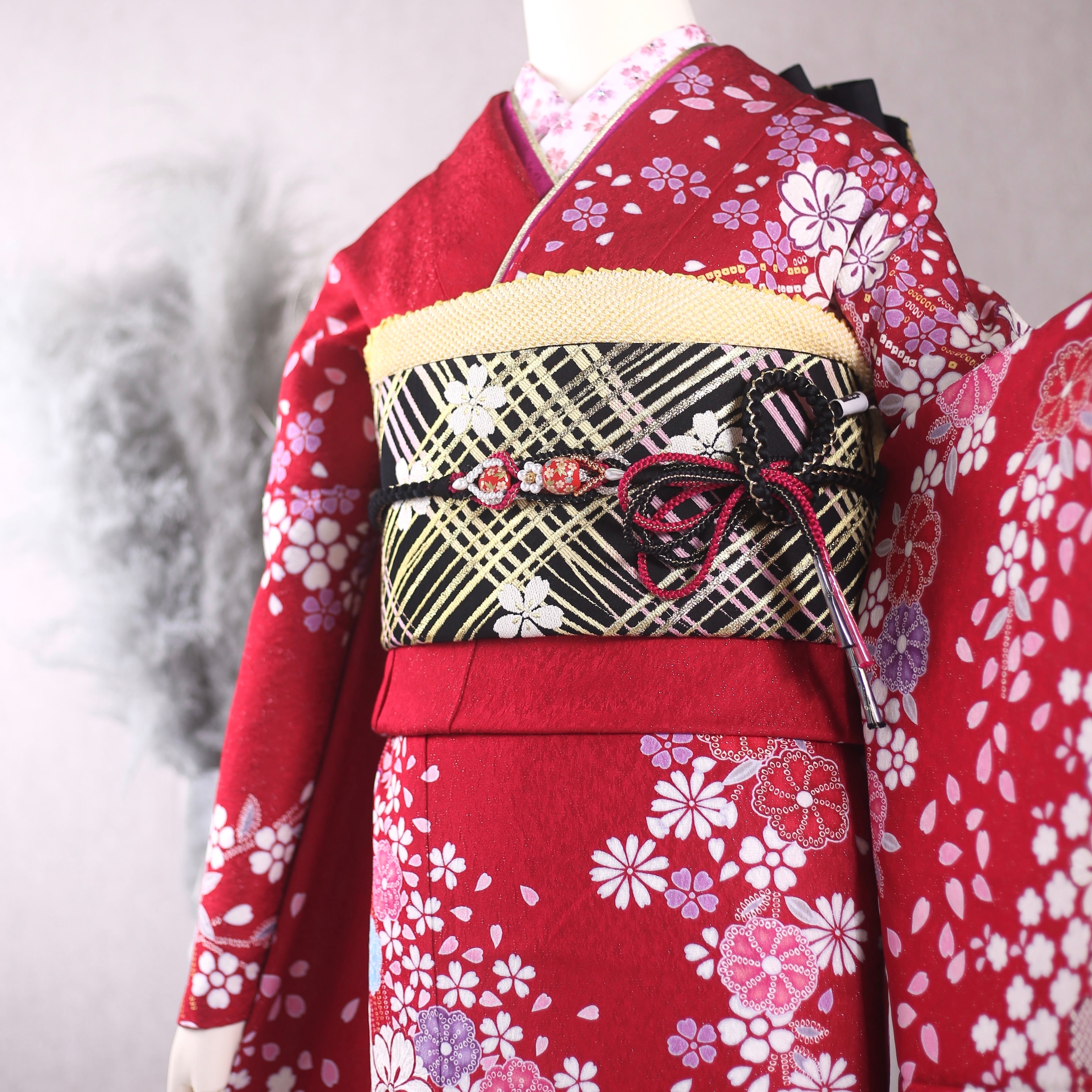 振袖フルセット 振袖セット 振袖 Lサイズ 赤×桜吹雪 美品 成人式 着物 晴れ着 7点フルセット KF-183