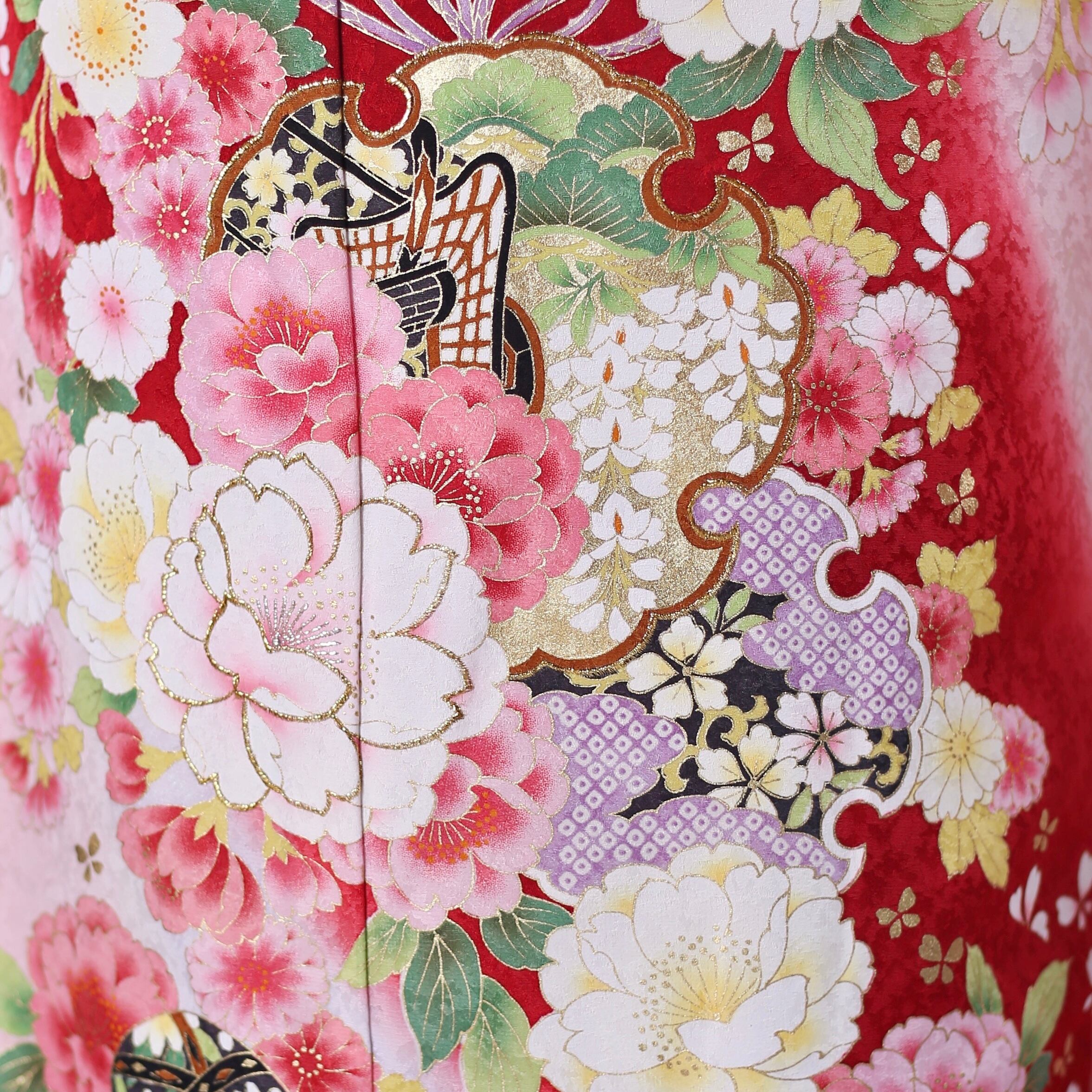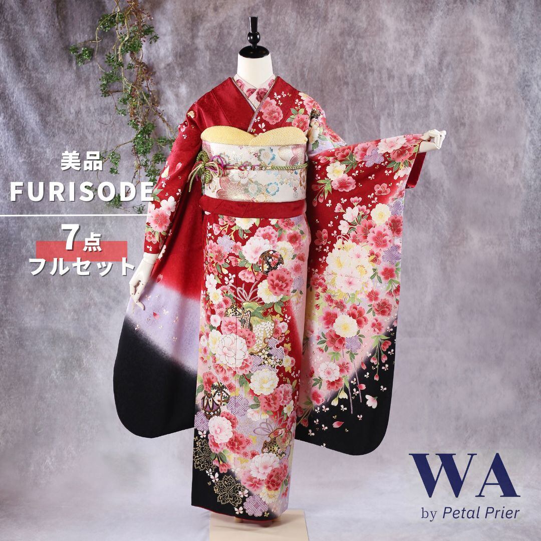 振袖フルセット 振袖セット 振袖 S〜Mサイズ 赤×新古典 美品 成人式 着物 晴れ着 7点フルセット F-49