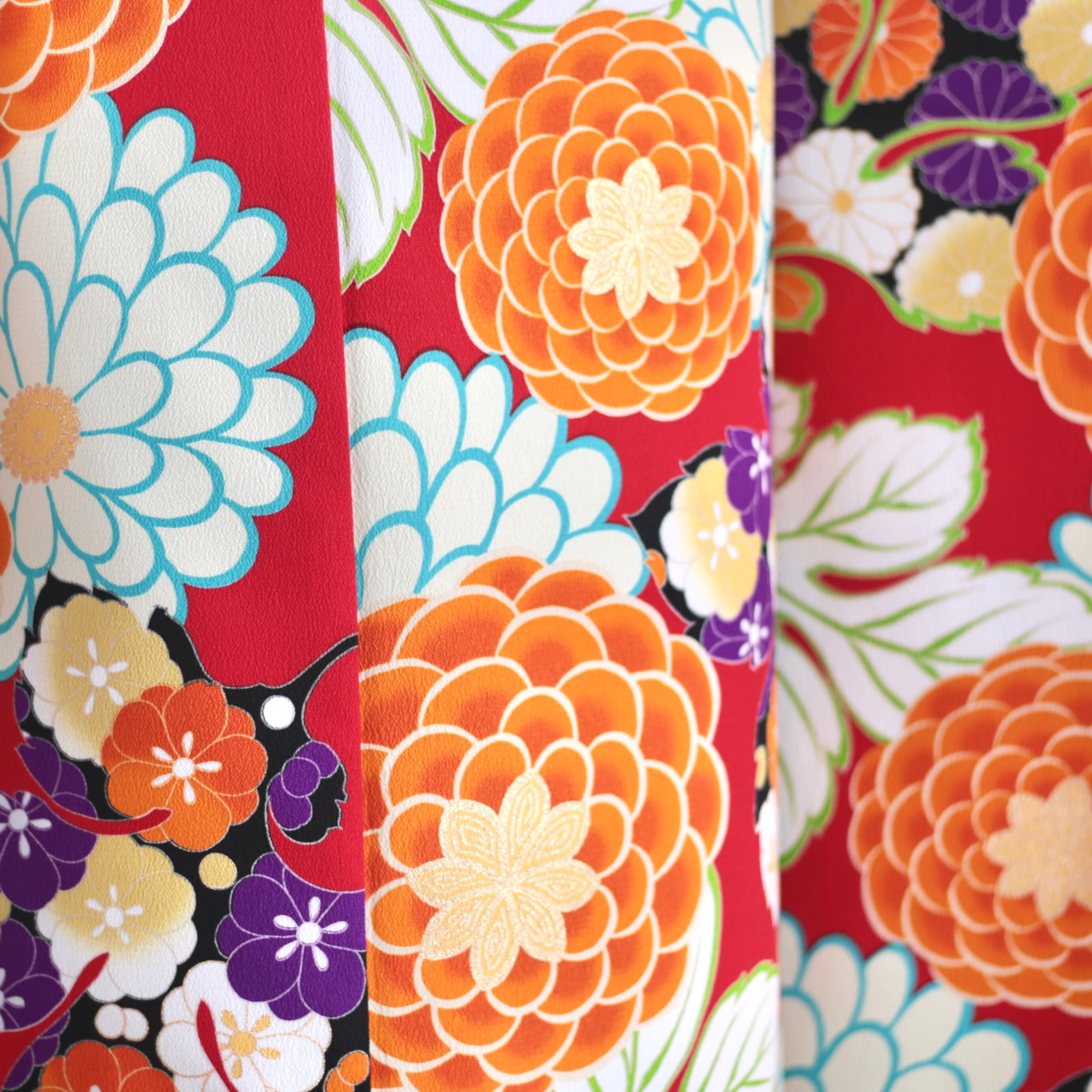 赤地に菊と葉が描かれた個性的なレトロ振袖です。