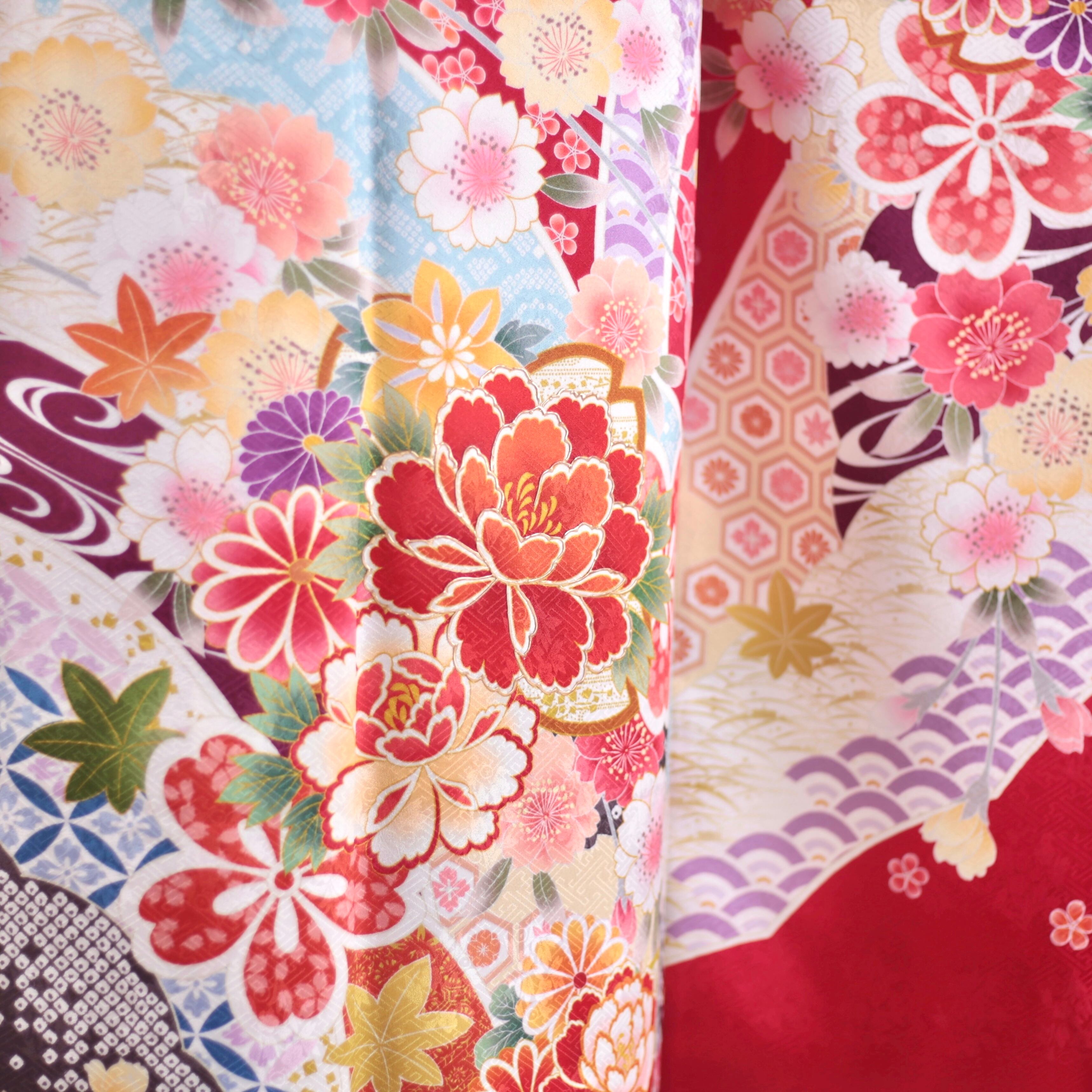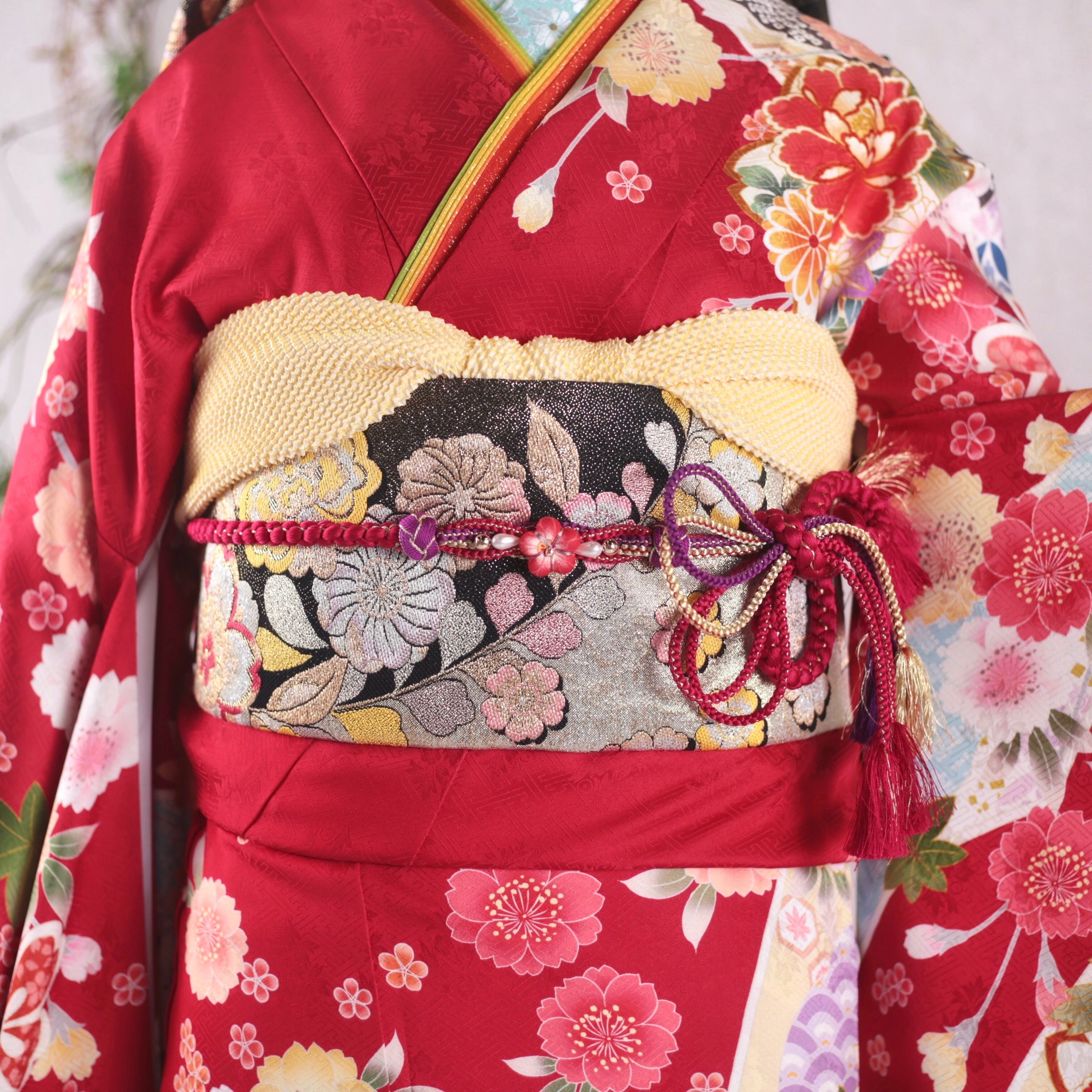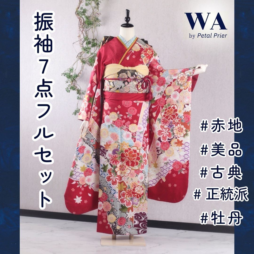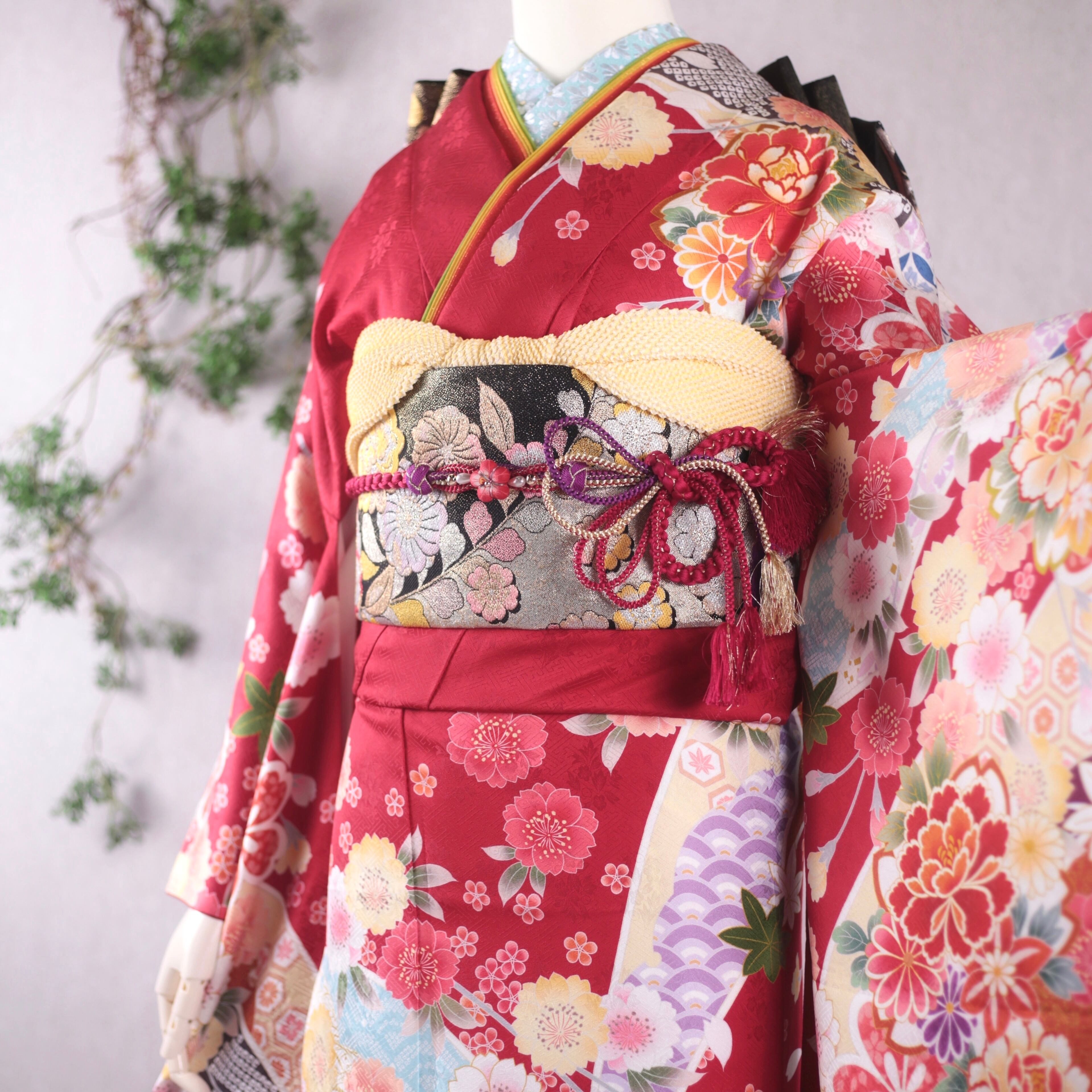 振袖フルセット 振袖セット 振袖 M〜Lサイズ 赤×新古典 美品 成人式 着物 晴れ着 7点フルセット F-331