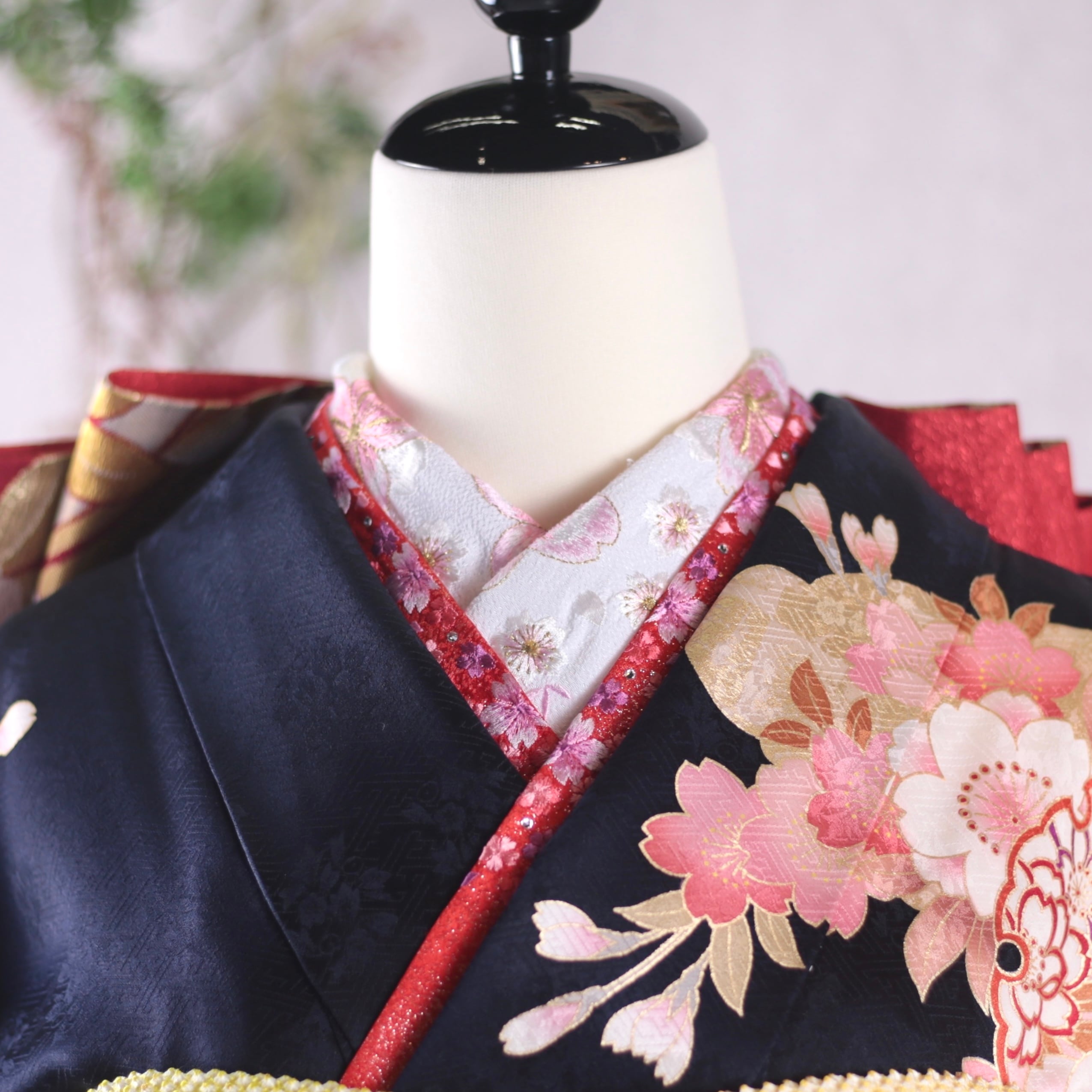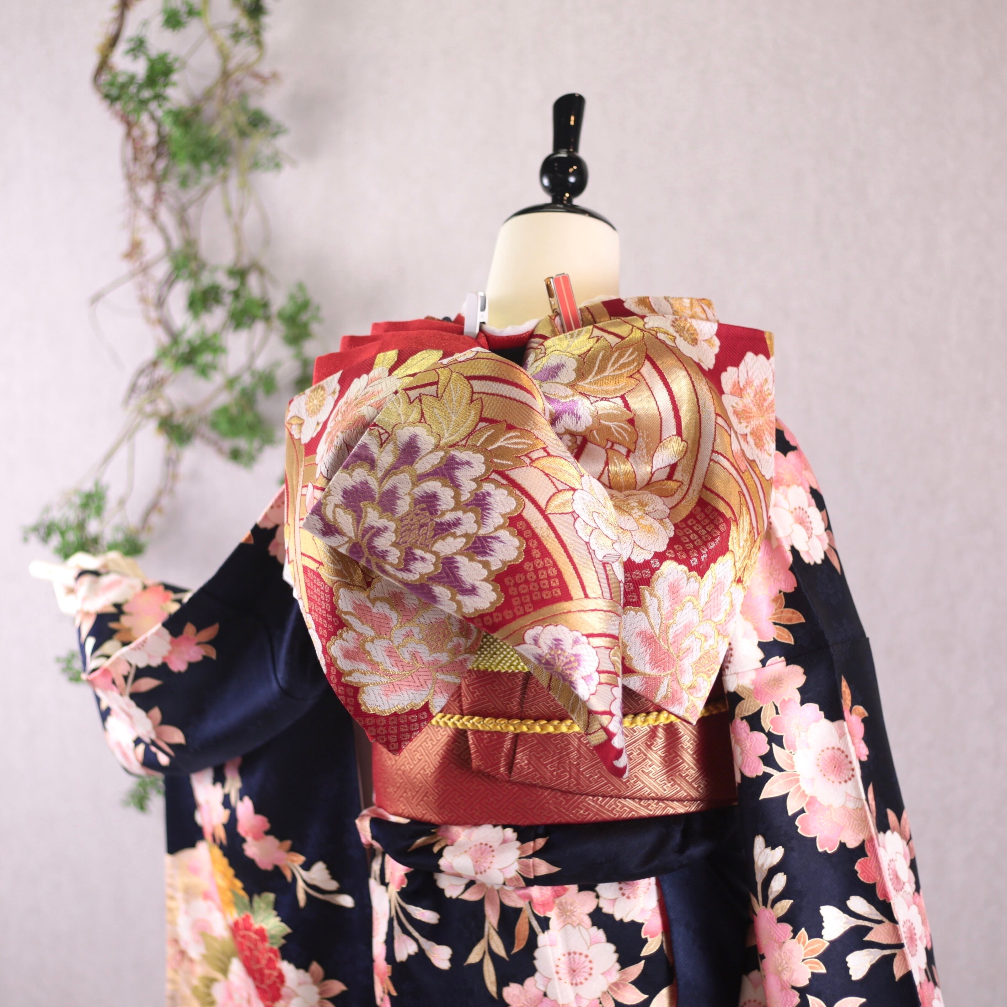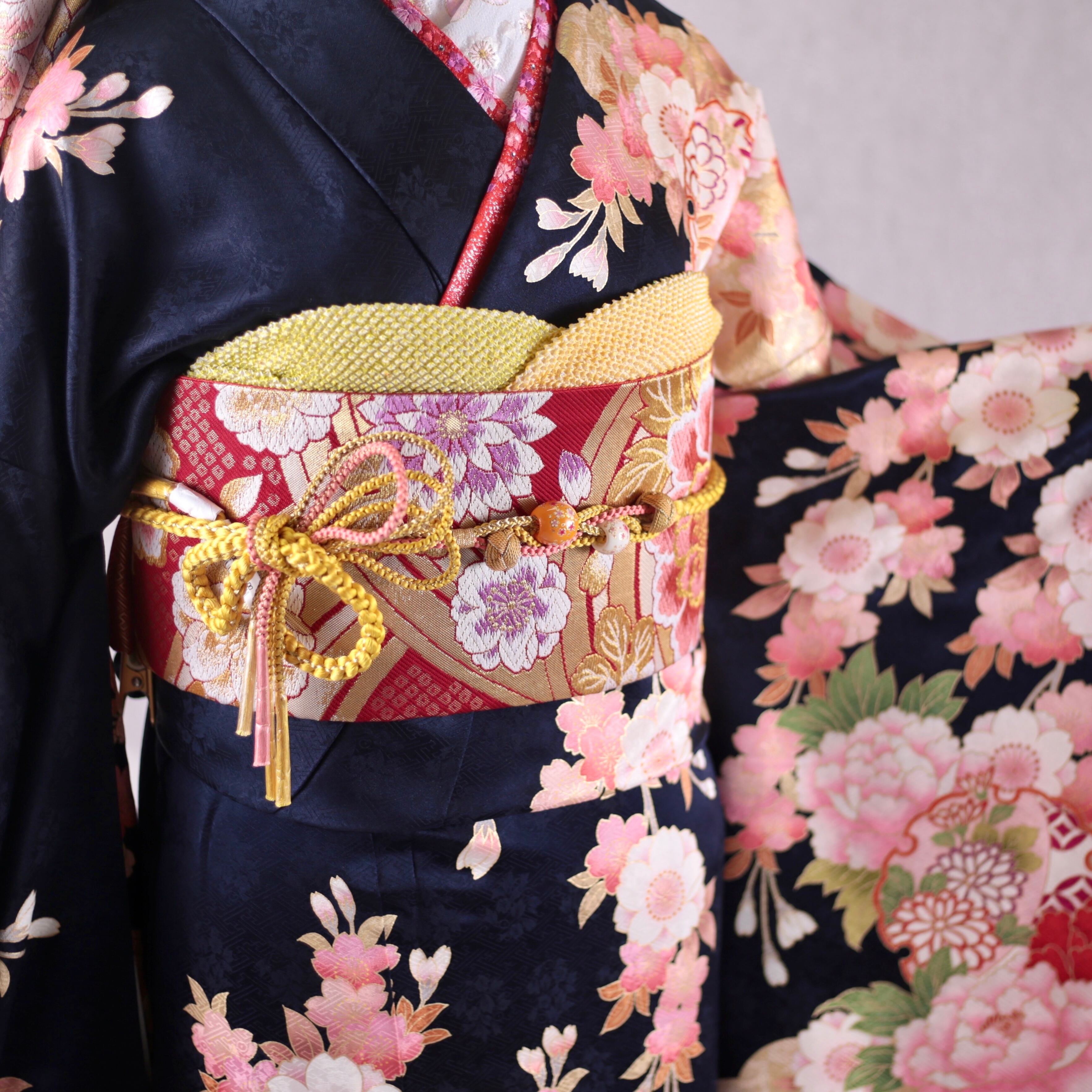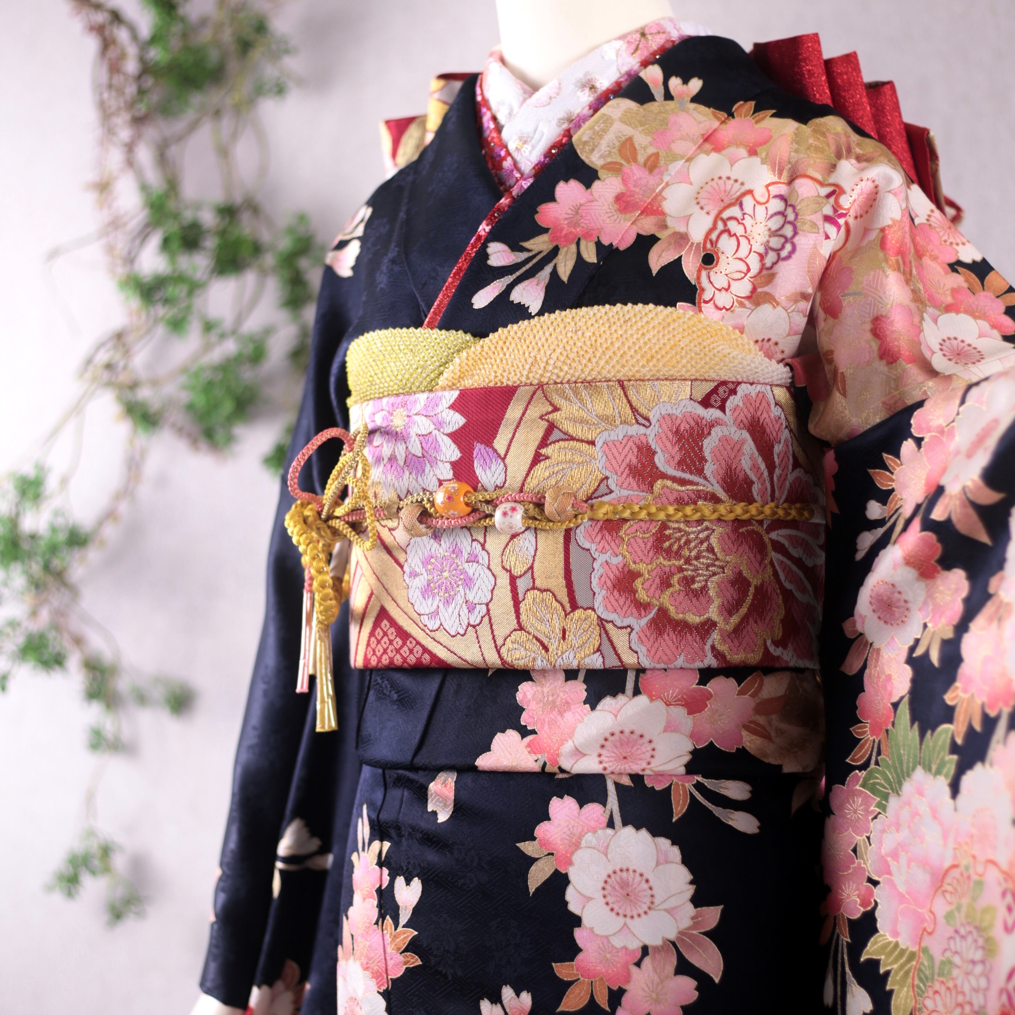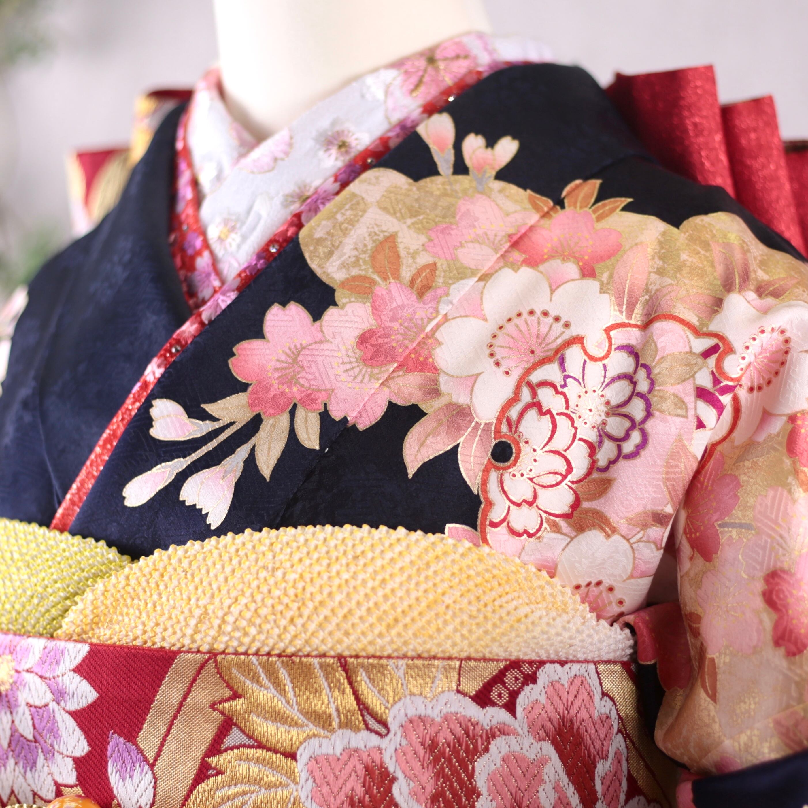 深い紺地に牡丹や桜、雪輪柄が華やかに描かれた振袖です。