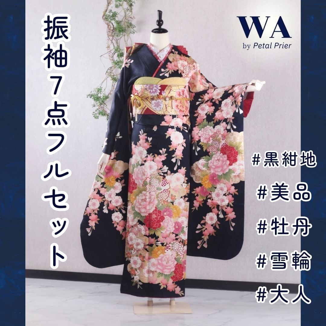 振袖フルセット 振袖セット 振袖 Mサイズ 黒紺×牡丹 美品 成人式 着物 晴れ着 7点フルセット F-338
