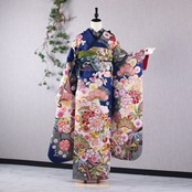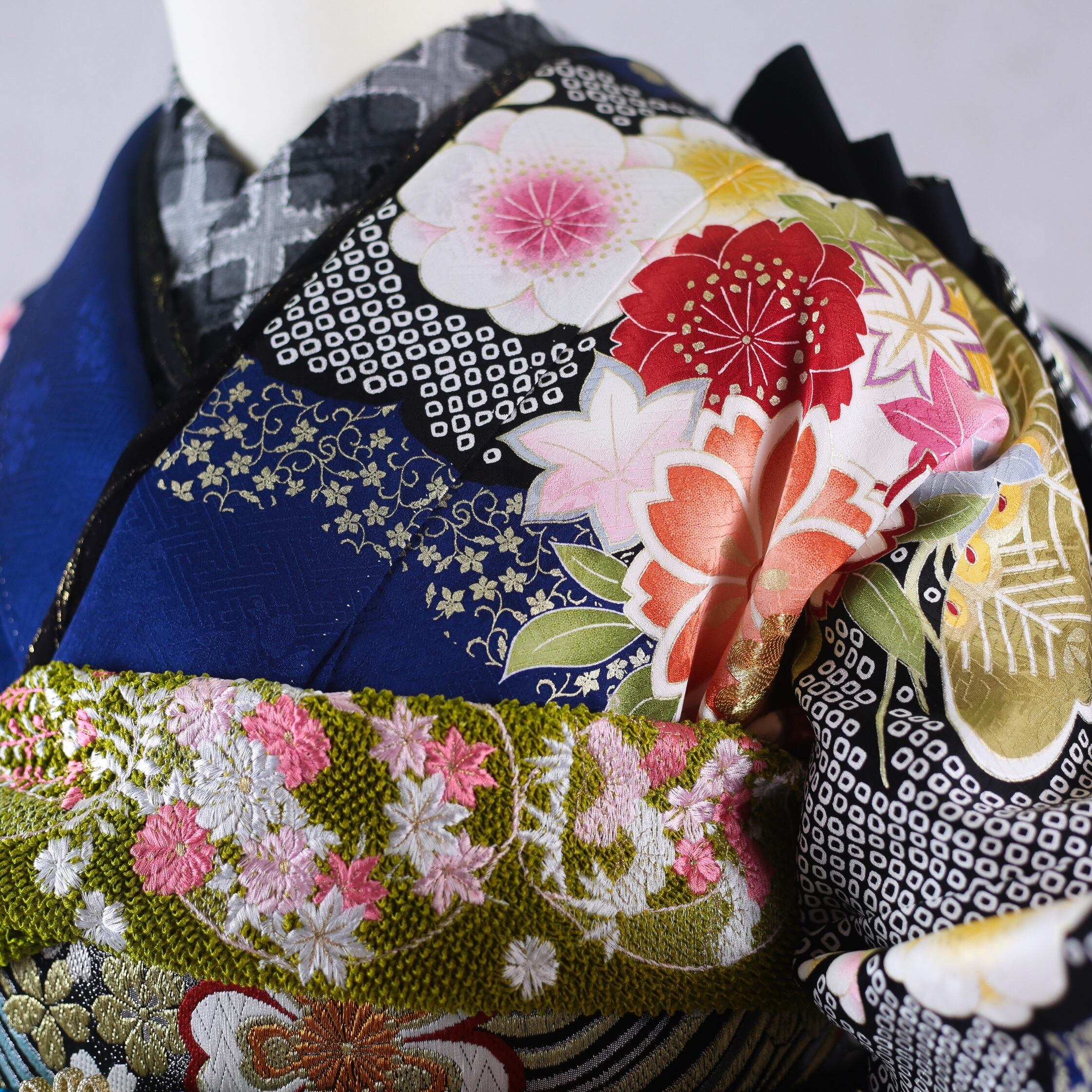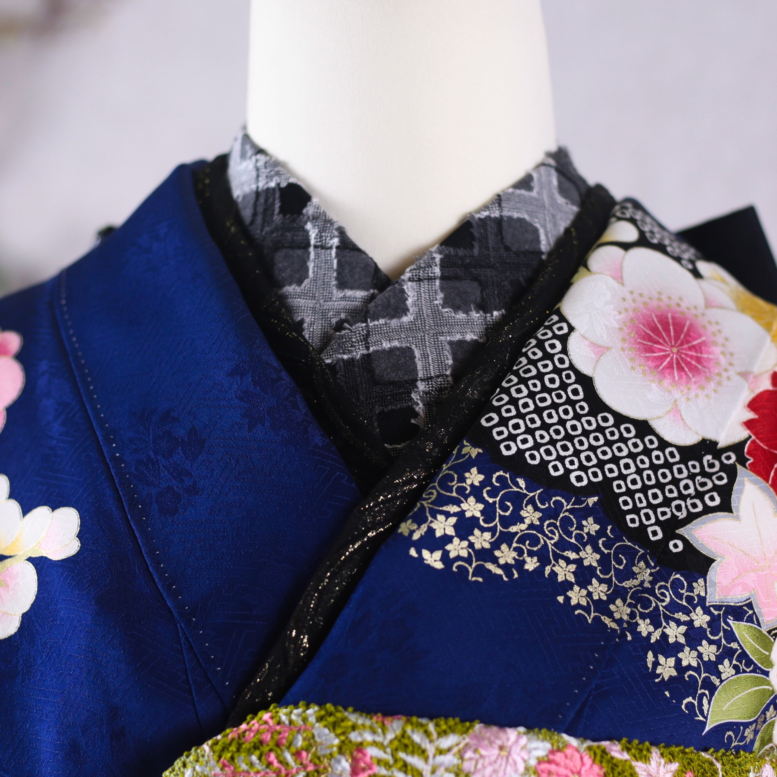 深みある青地に金駒刺繍や松竹梅、牡丹が印象的な振袖です。