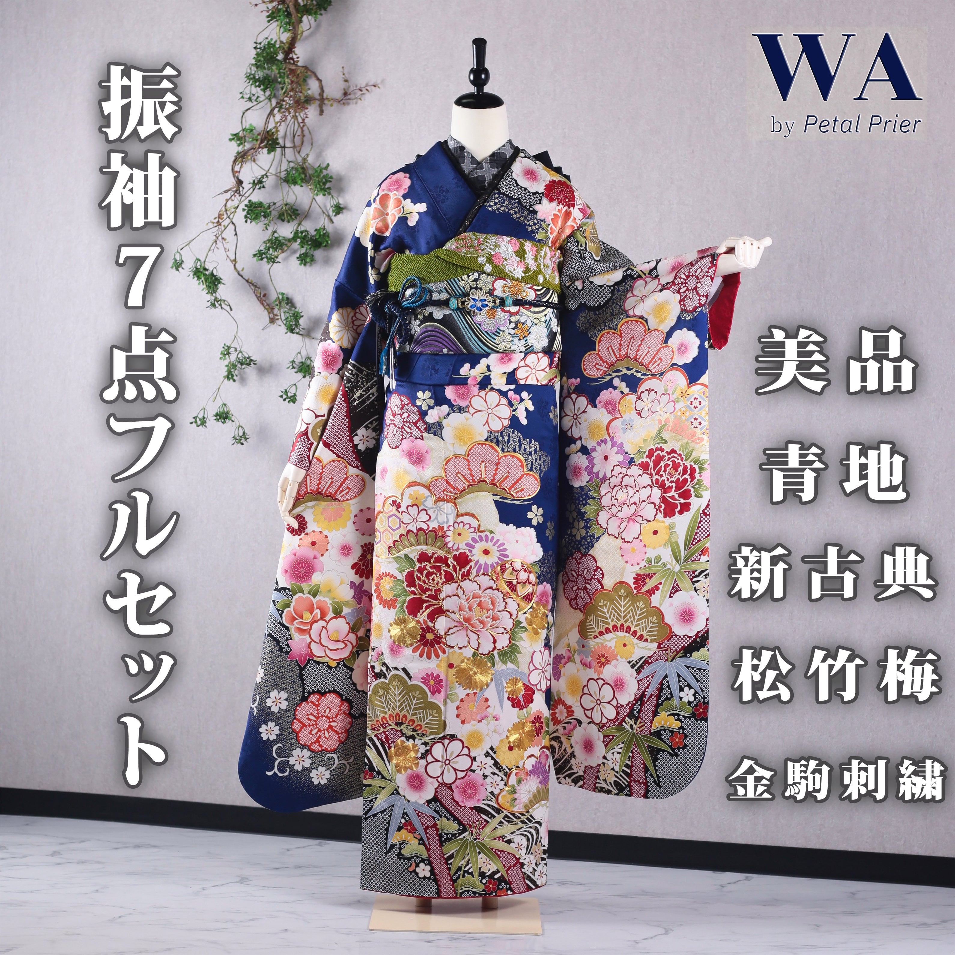 振袖フルセット 振袖セット 振袖 Lサイズ 青×松竹梅 美品 成人式 着物 晴れ着 7点フルセット F-349