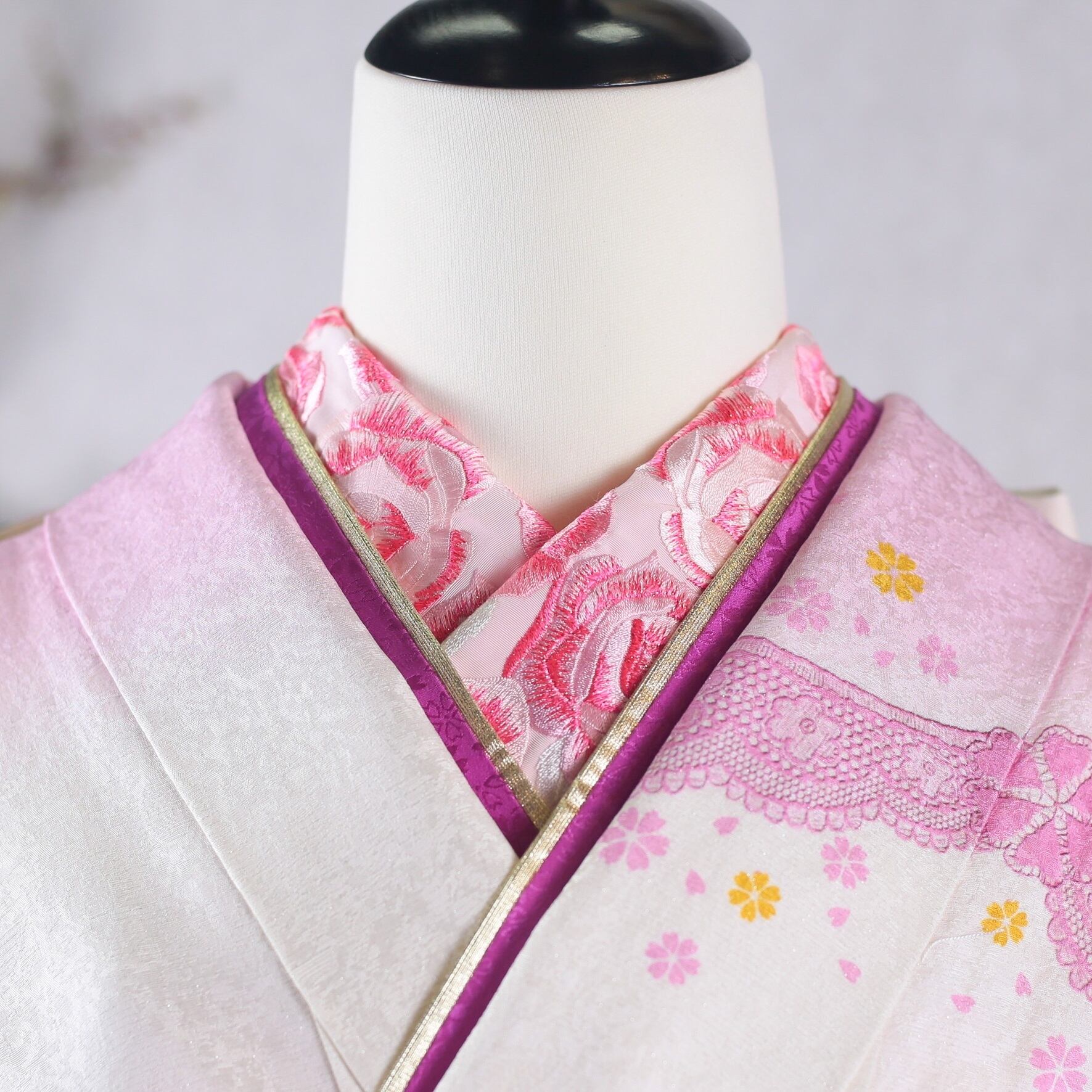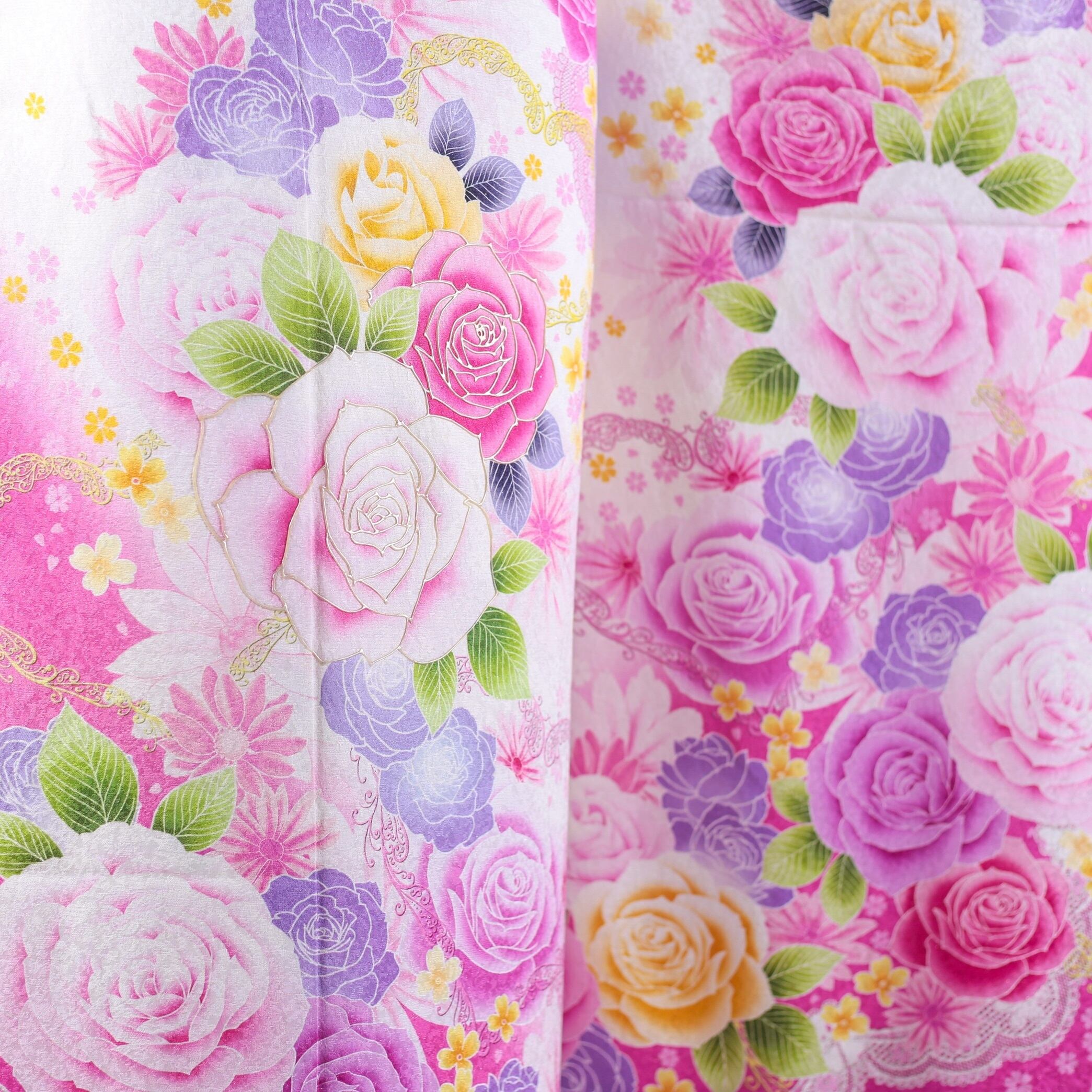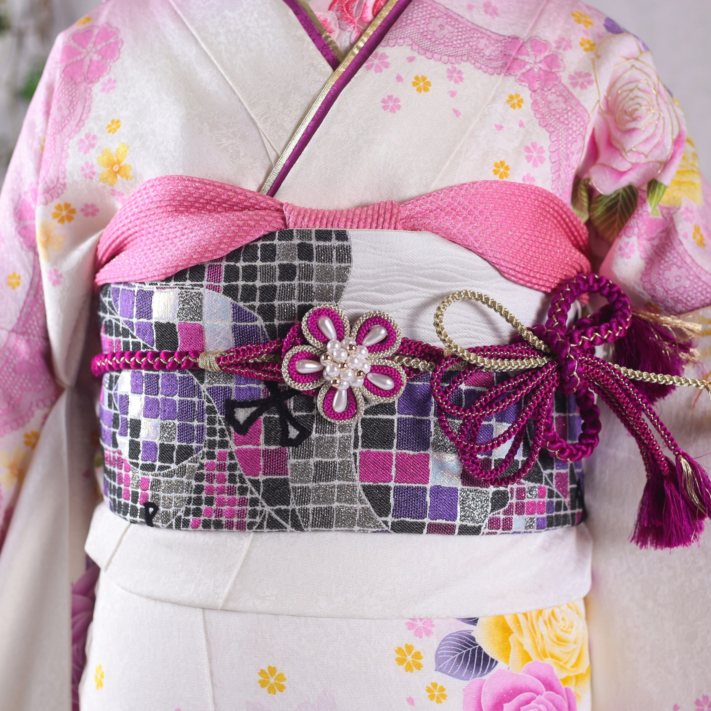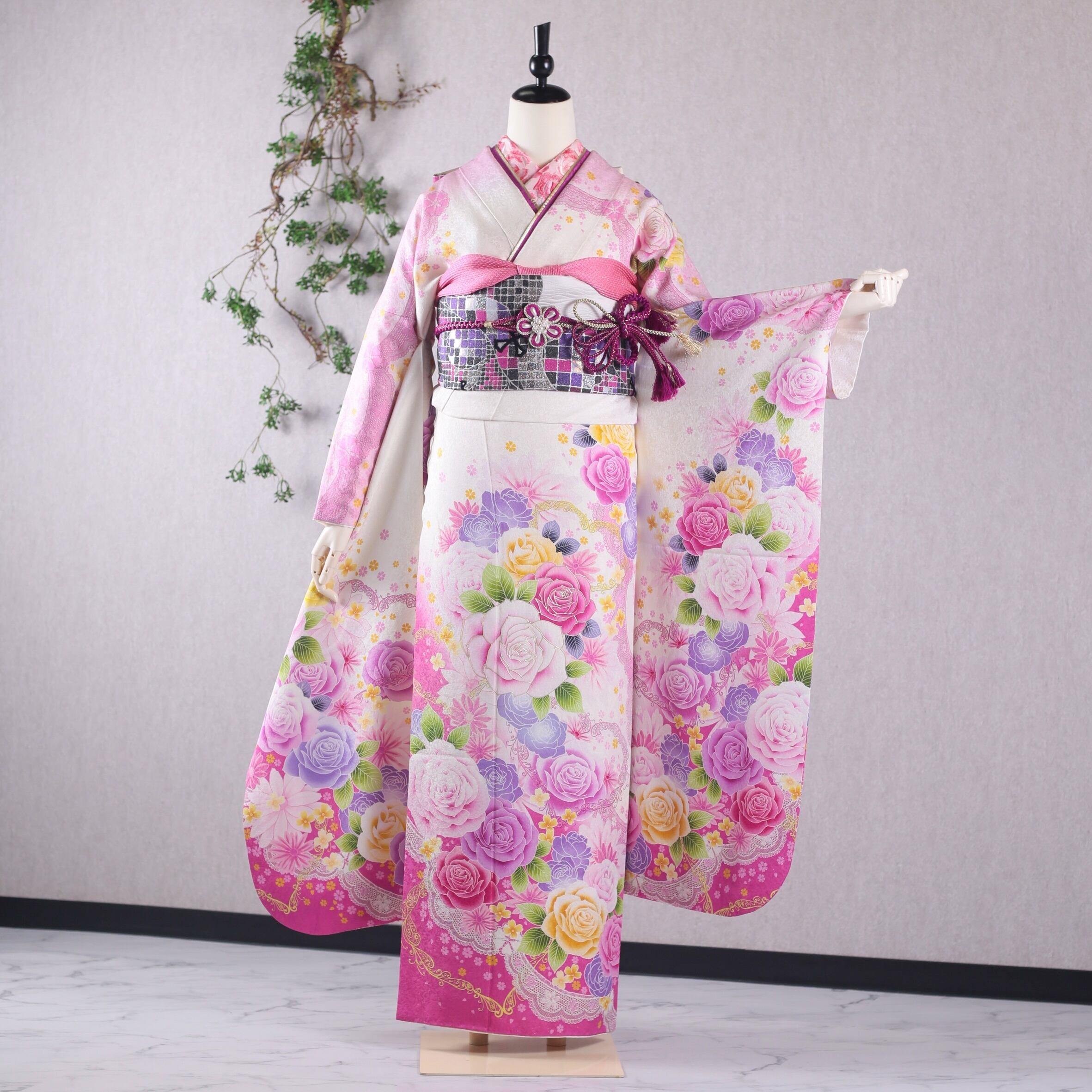 人気高い白地にピンクやパープルの薔薇が印象的な振袖です。