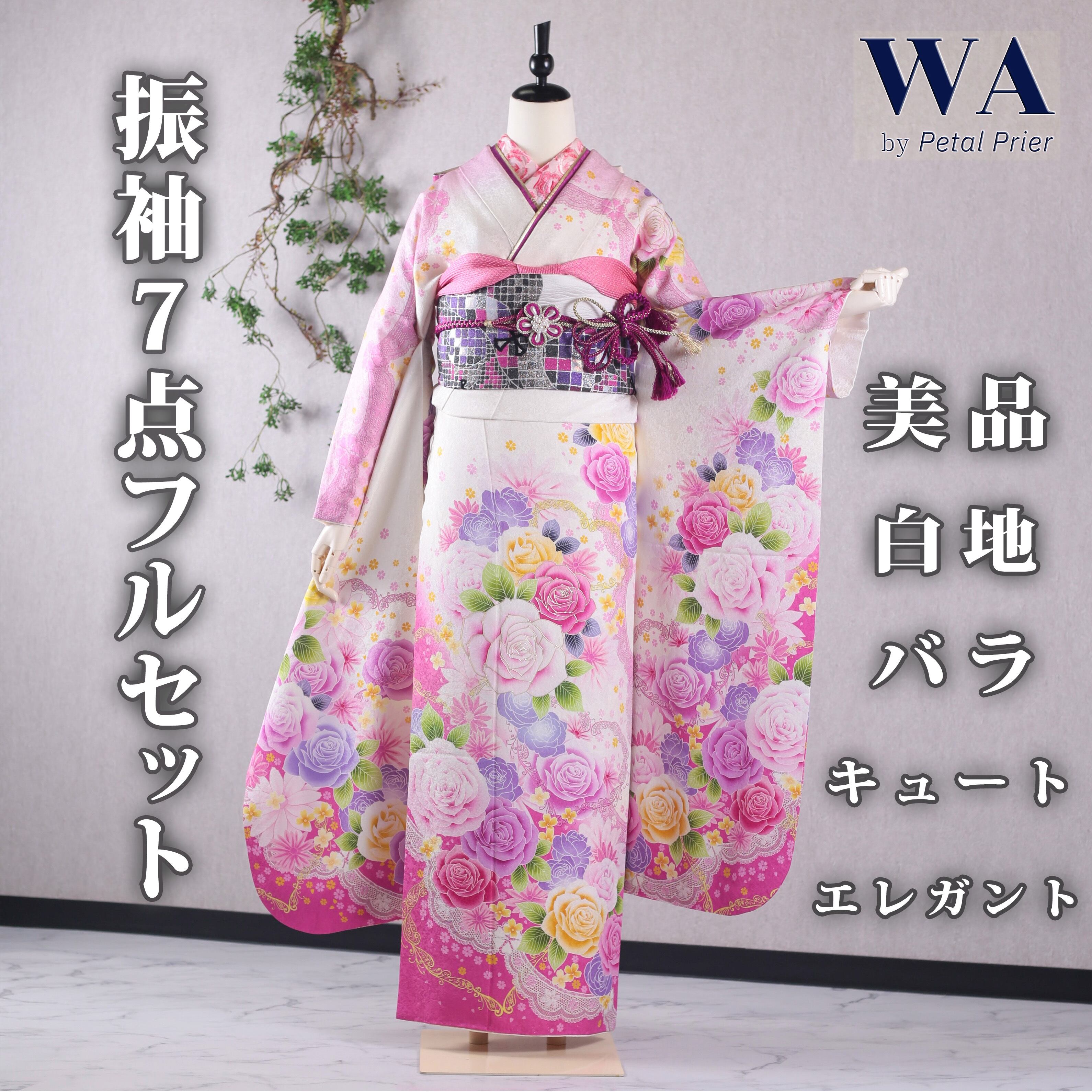振袖フルセット 振袖セット 振袖 Lサイズ 白×エレガント 美品 成人式 着物 晴れ着 7点フルセット F-354