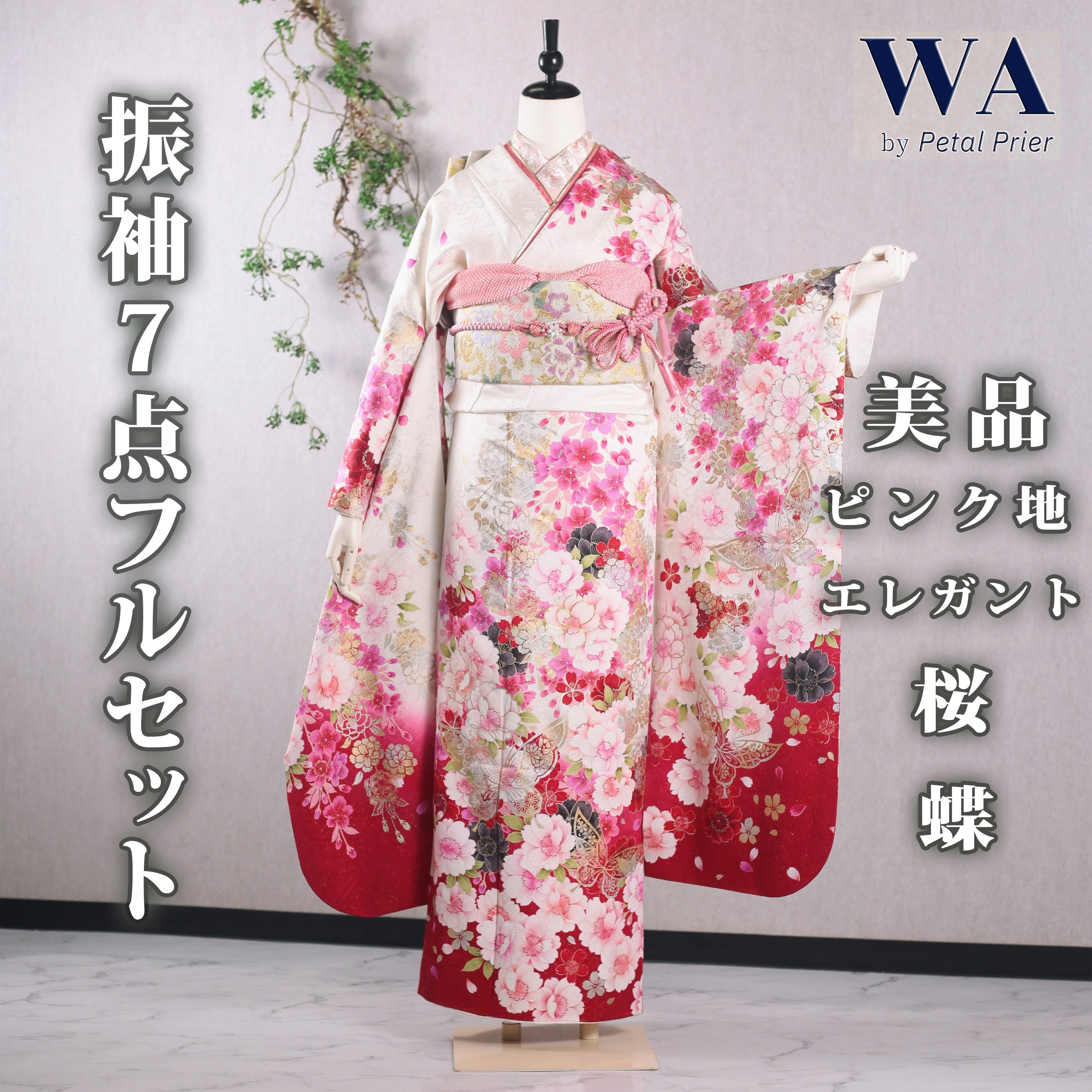 振袖フルセット 振袖セット 振袖 Mサイズ 白×蝶 美品 成人式 着物 晴れ着 7点フルセット F-357