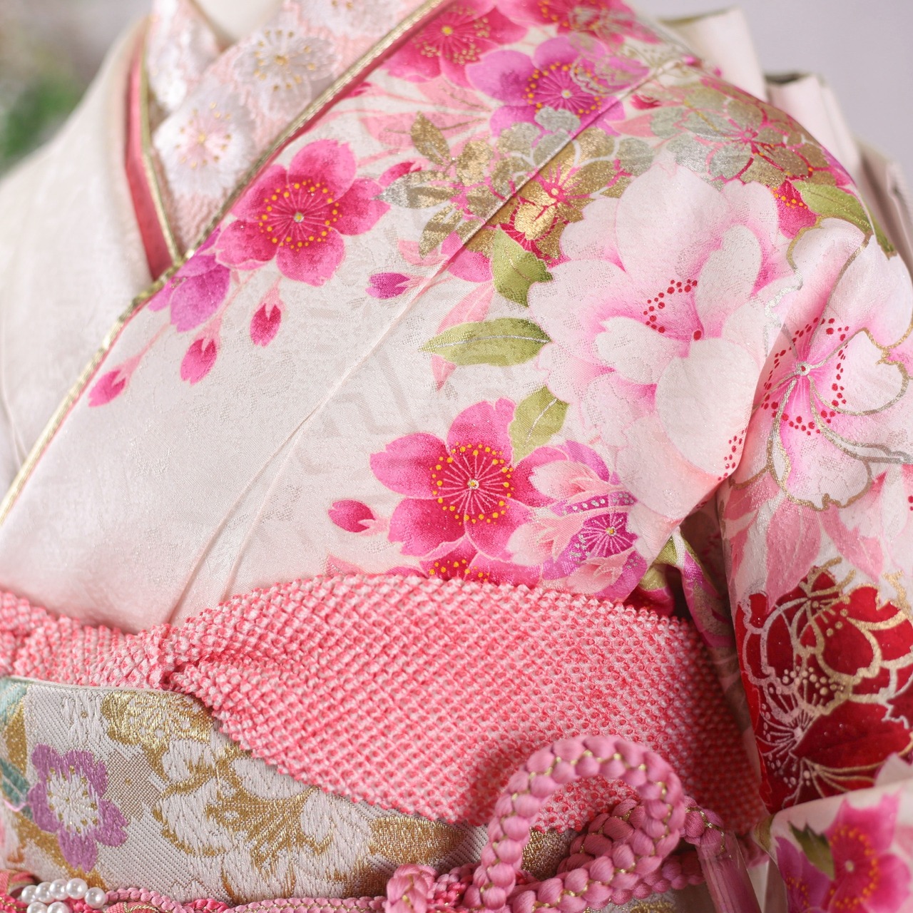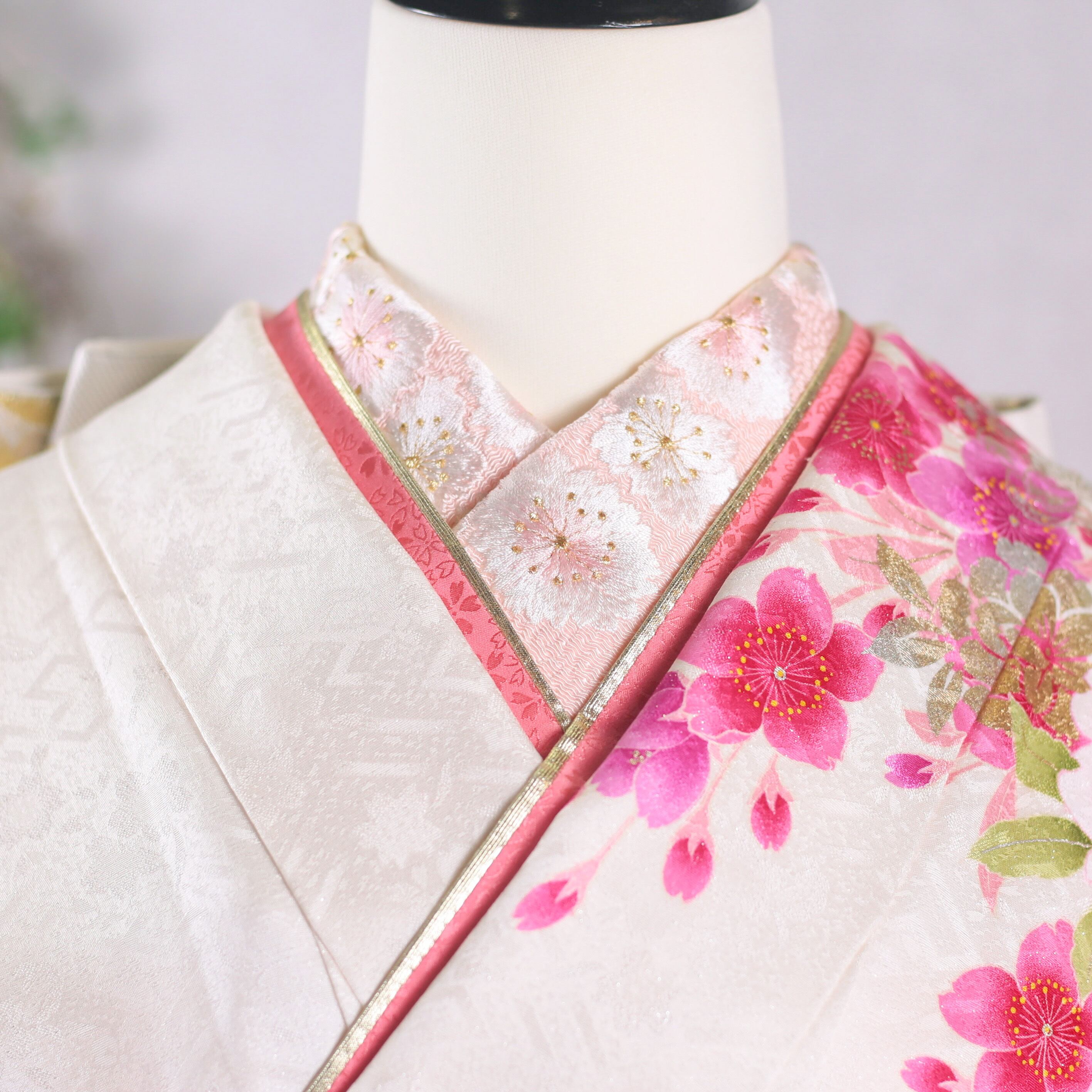 白地に埋め尽くすような桜と蝶が印象的な振袖です。
