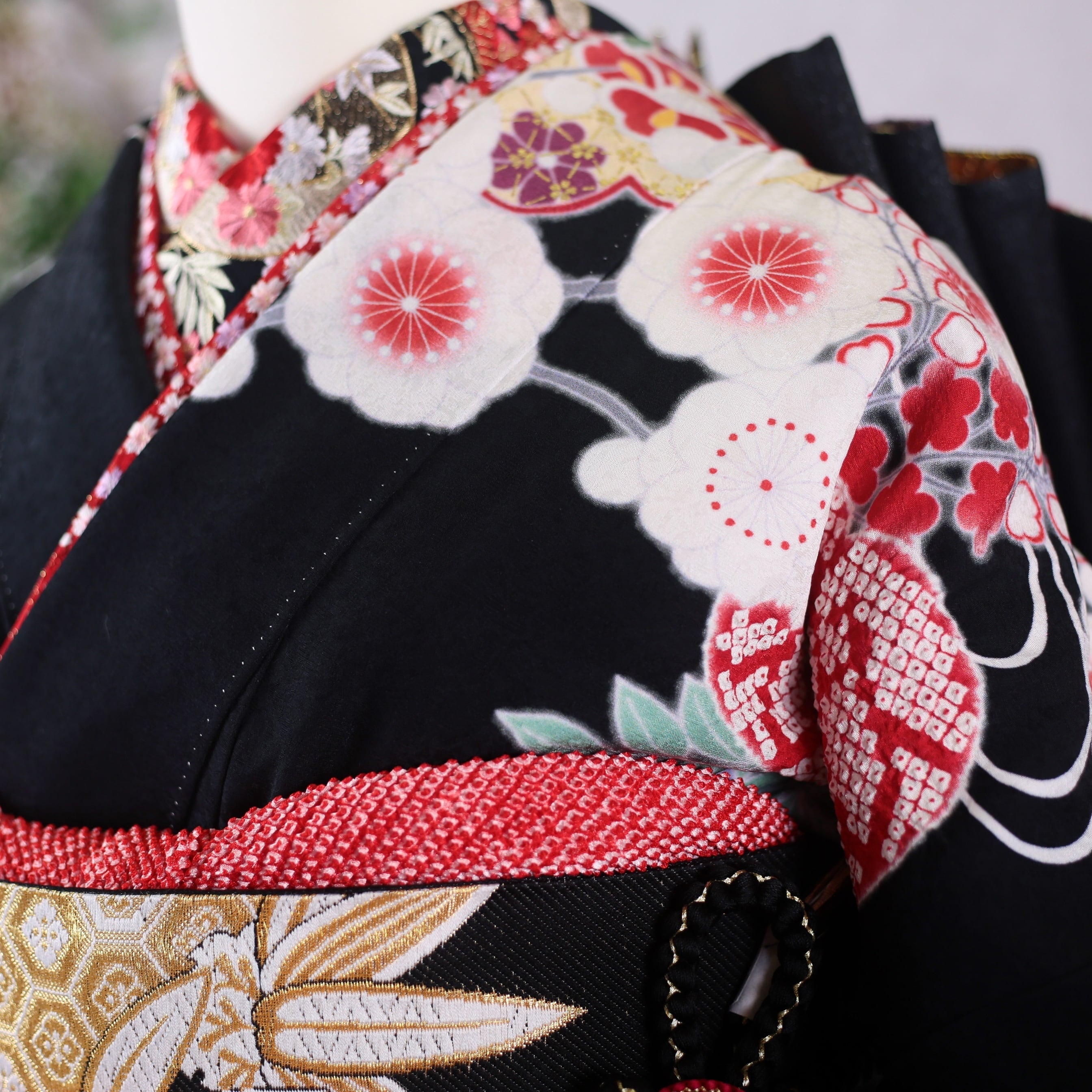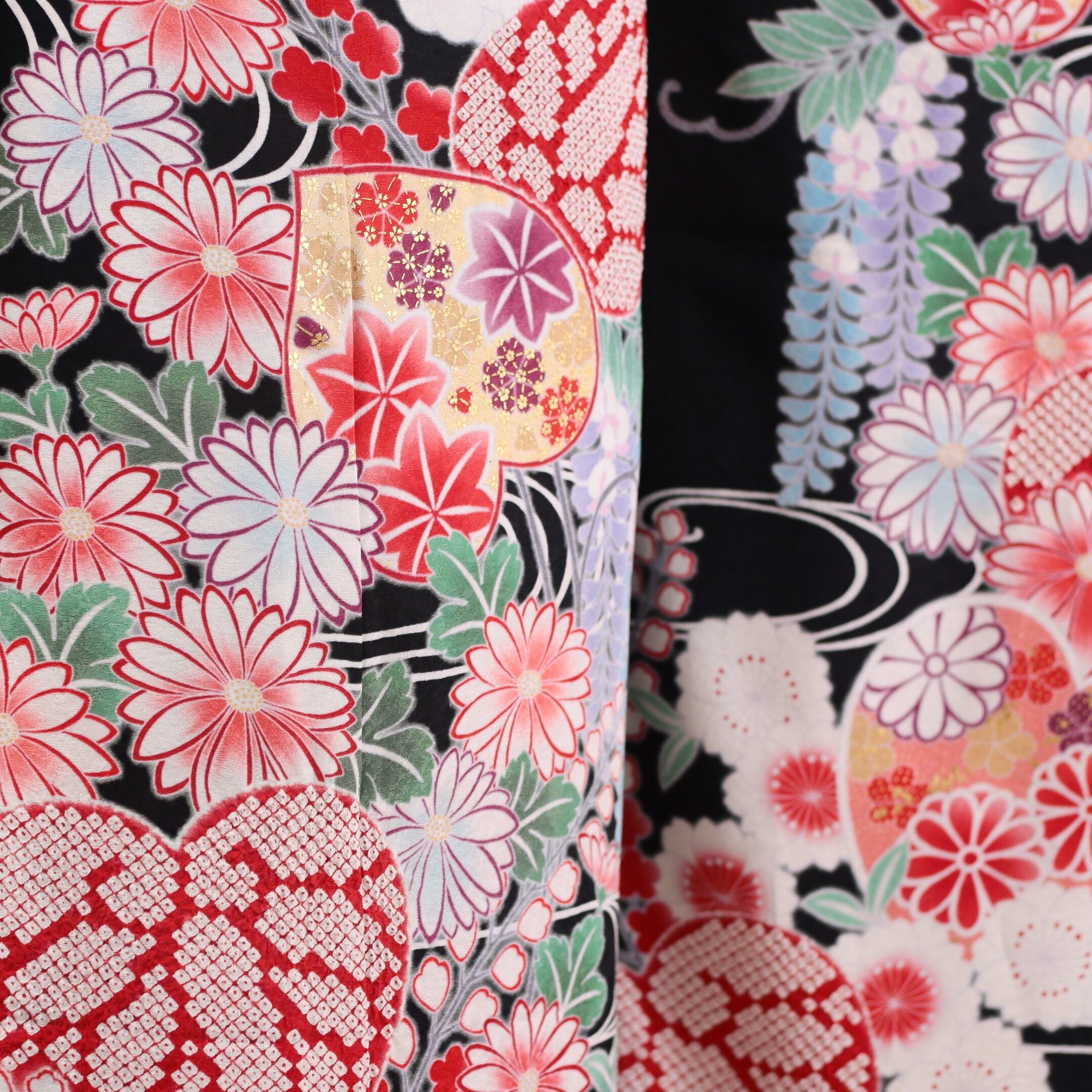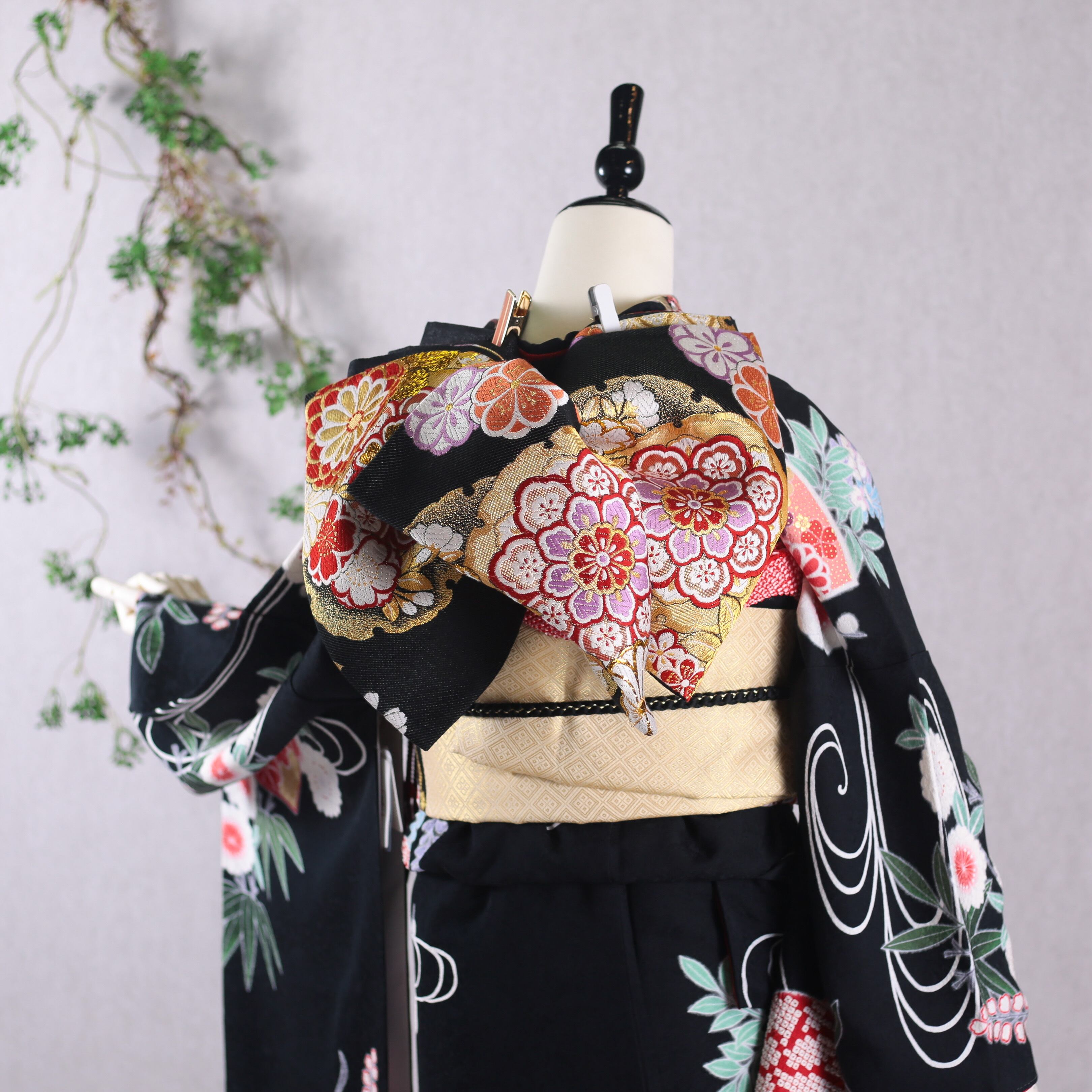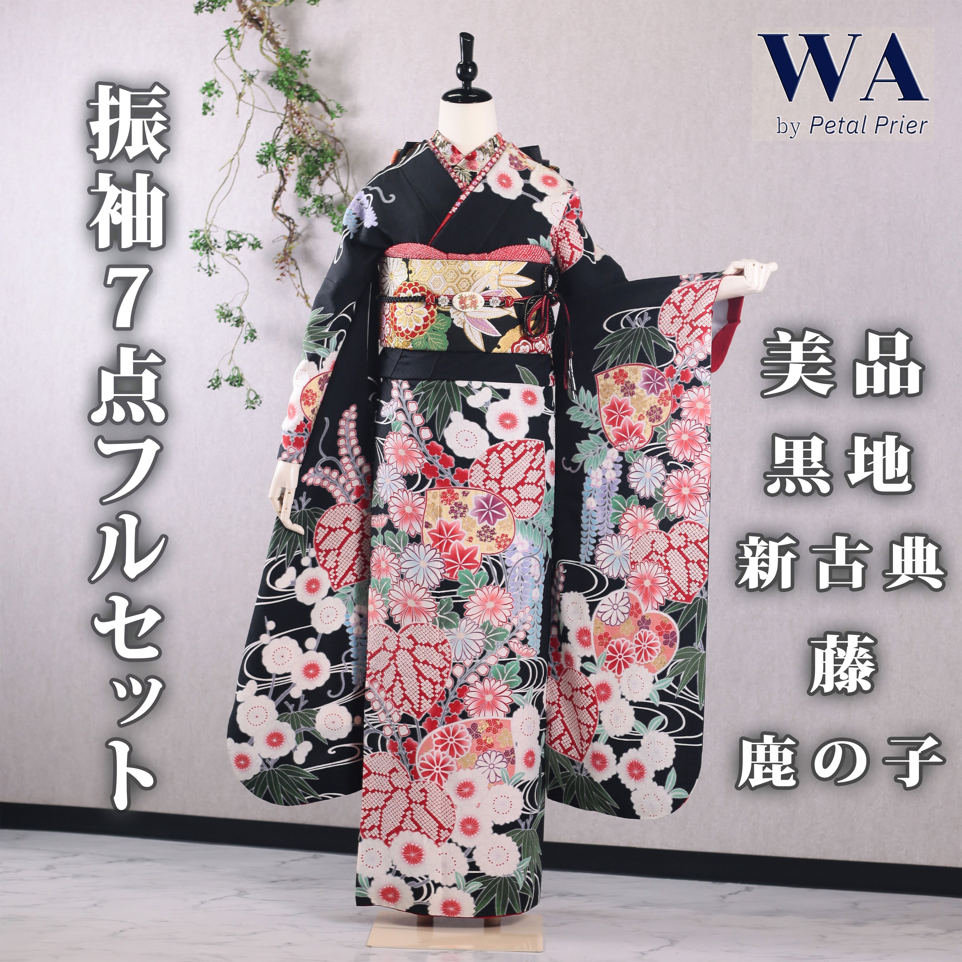 振袖フルセット 振袖セット 振袖 L〜LLサイズ 黒×モダン 美品 成人式 着物 晴れ着 7点フルセット F-361