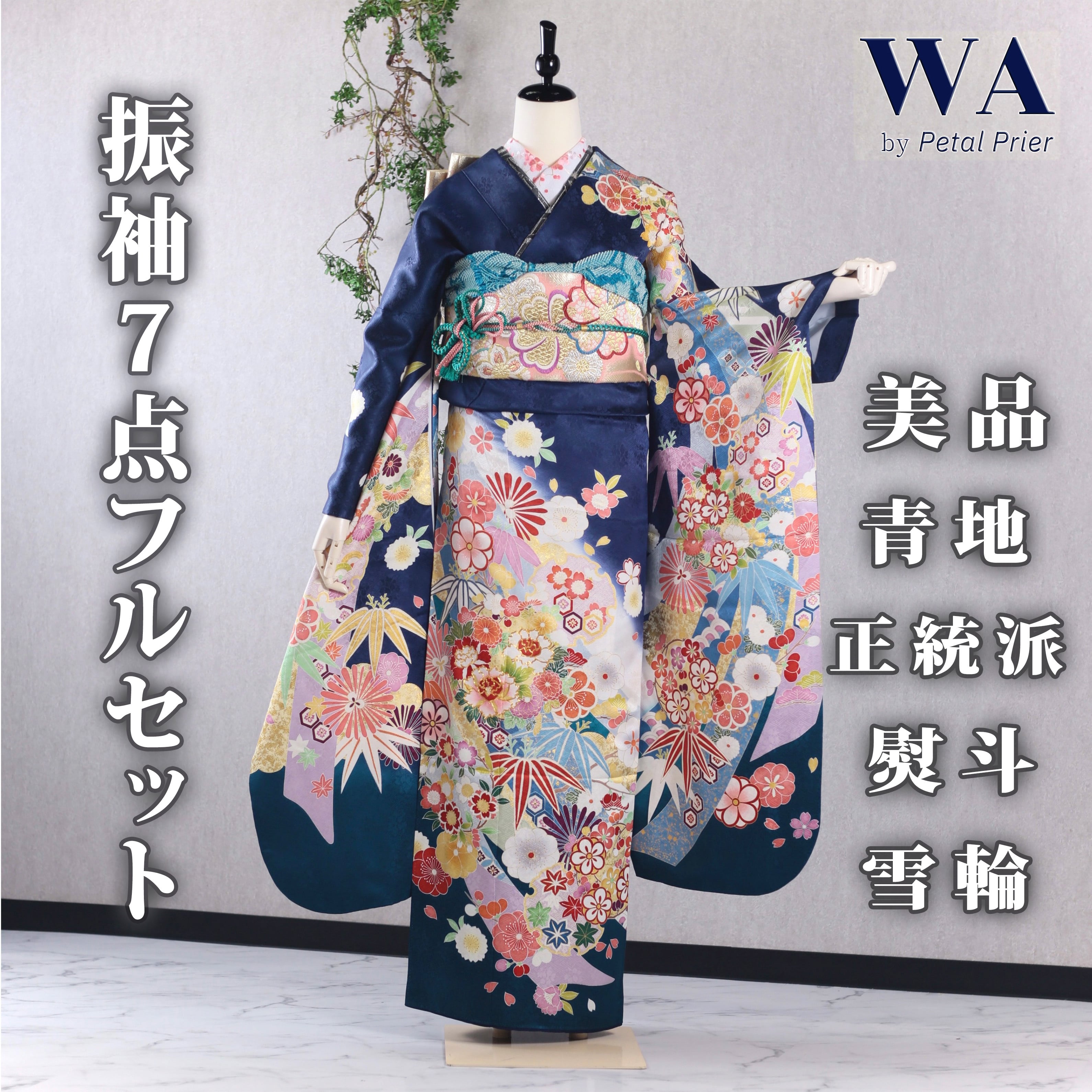 振袖フルセット 振袖セット 振袖 M〜Lサイズ 青×新古典 美品 成人式 着物 晴れ着 7点フルセット F-372