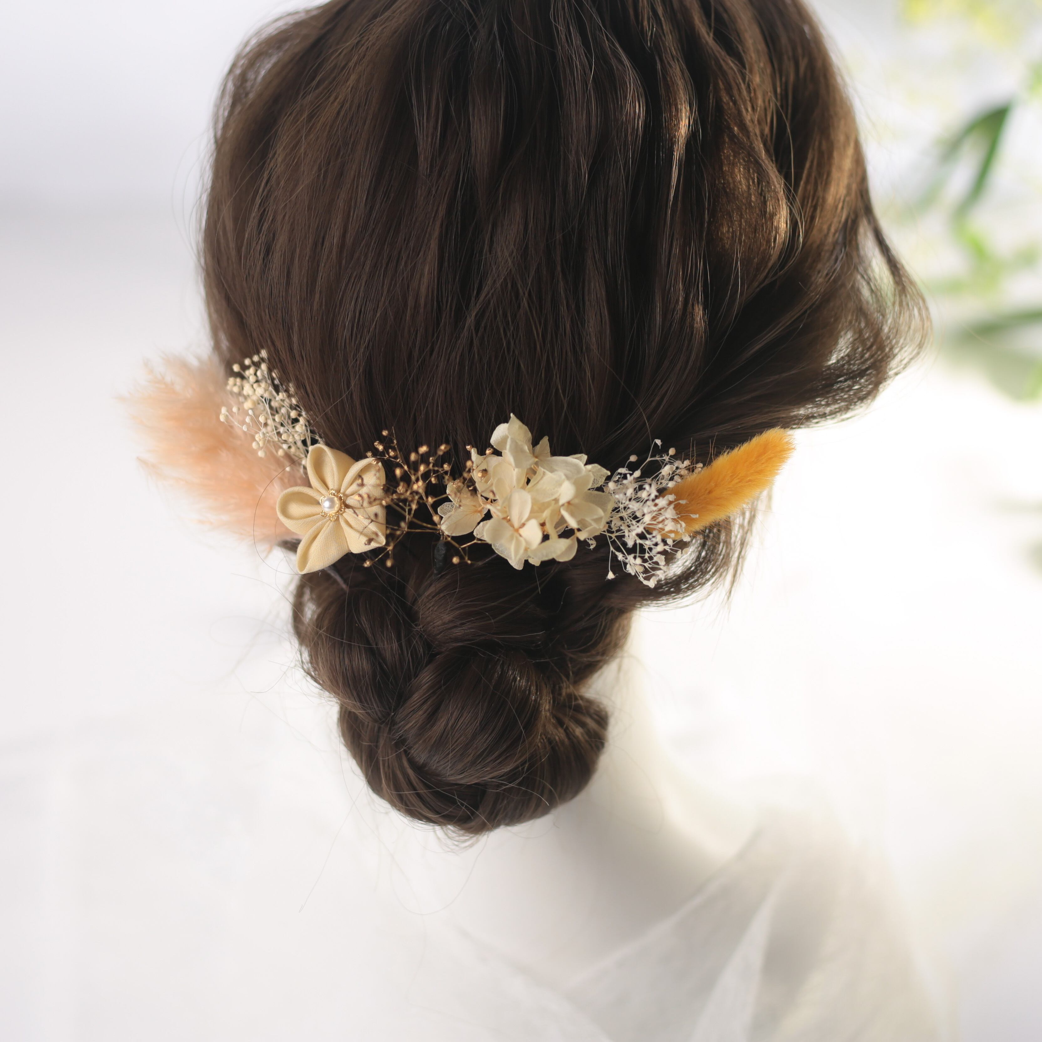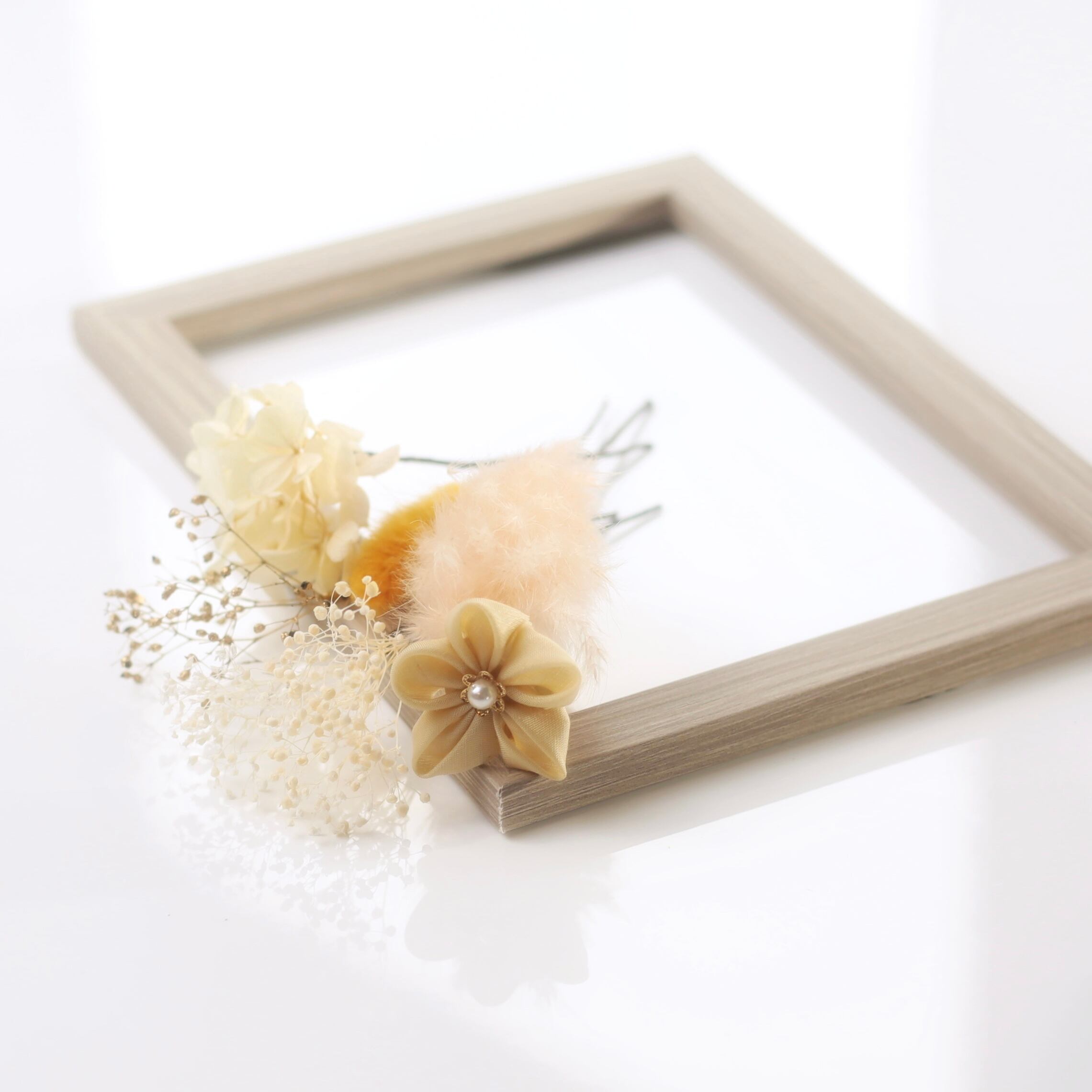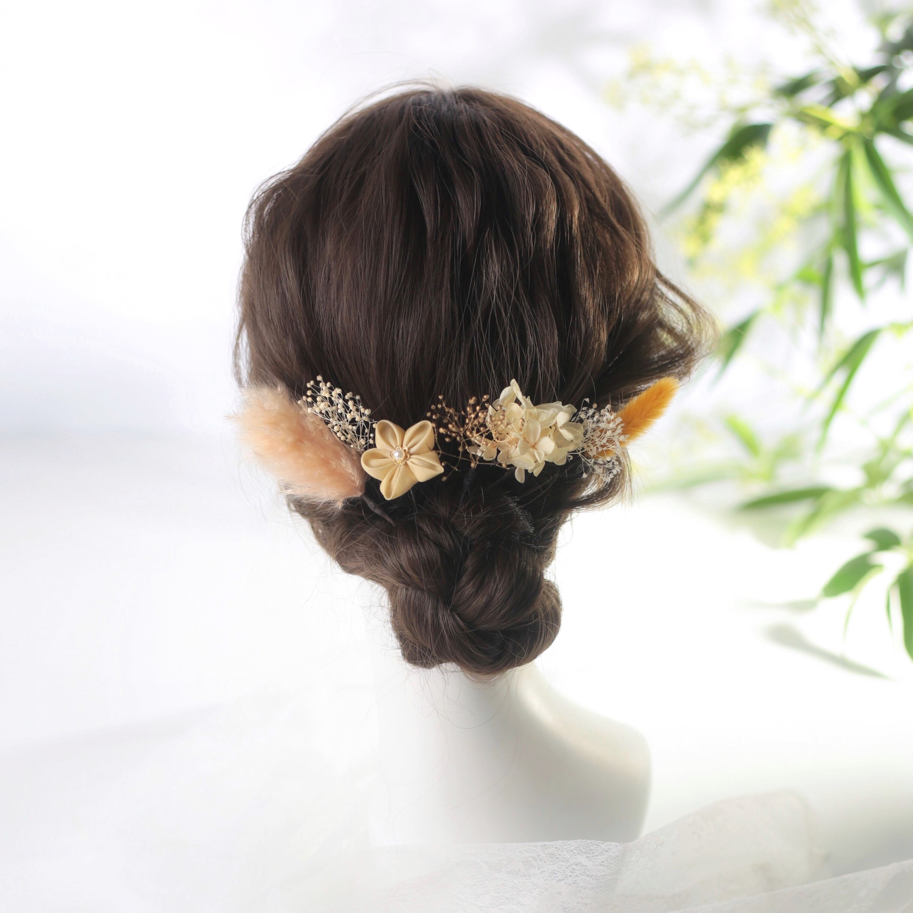 髪飾り 髪飾りセット 成人式 振袖 結婚式 ブライダル ヘッドドレス 卒業式 七五三 前撮り ピンク ベージュ カスミソウ あじさい つまみ細工 ドライフラワー K-165 | WA by Petal Prier