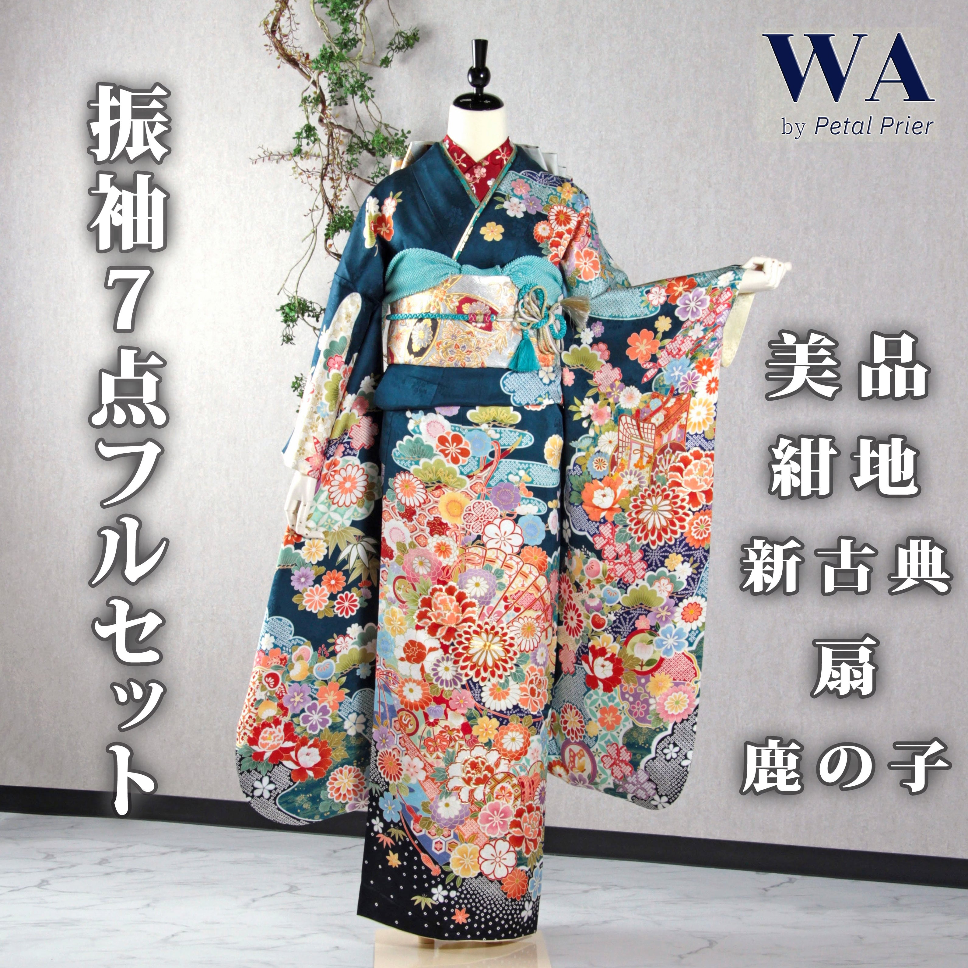 振袖フルセット 振袖セット 振袖 Mサイズ 青紺×新古典 美品 成人式 着物 晴れ着 7点フルセット F-373