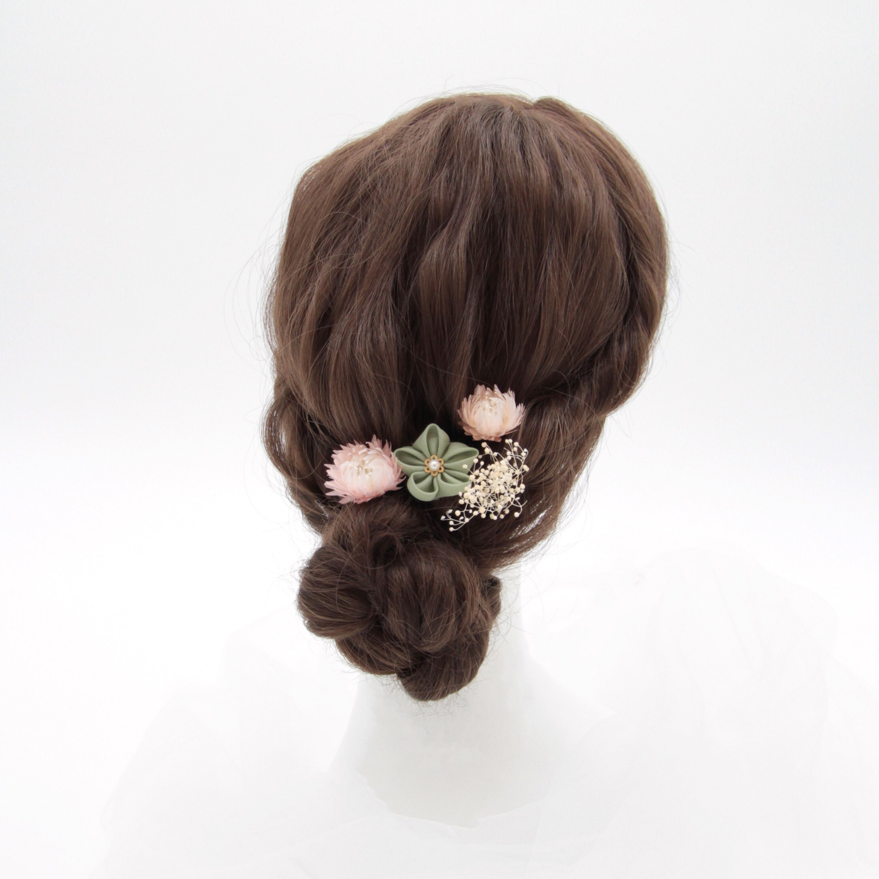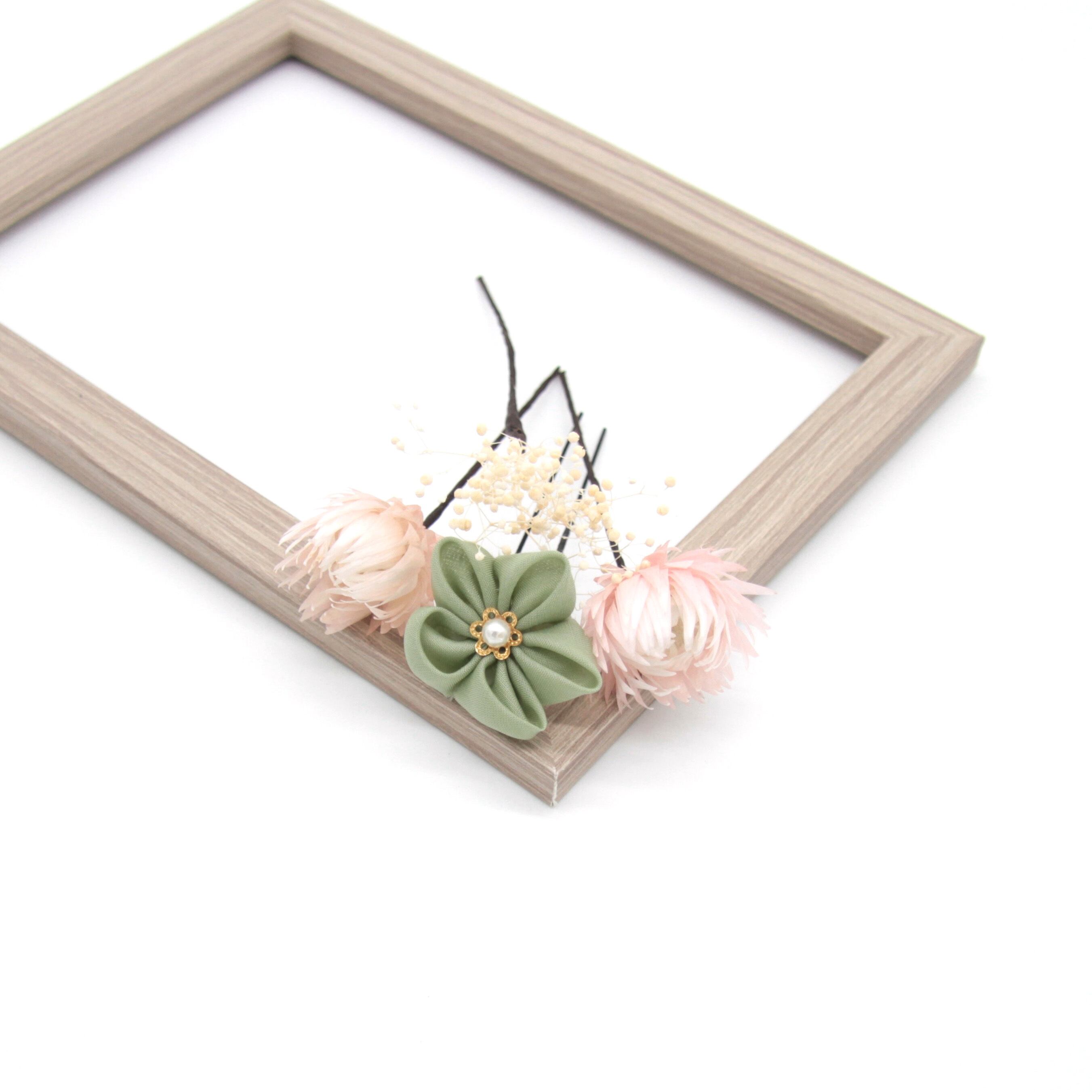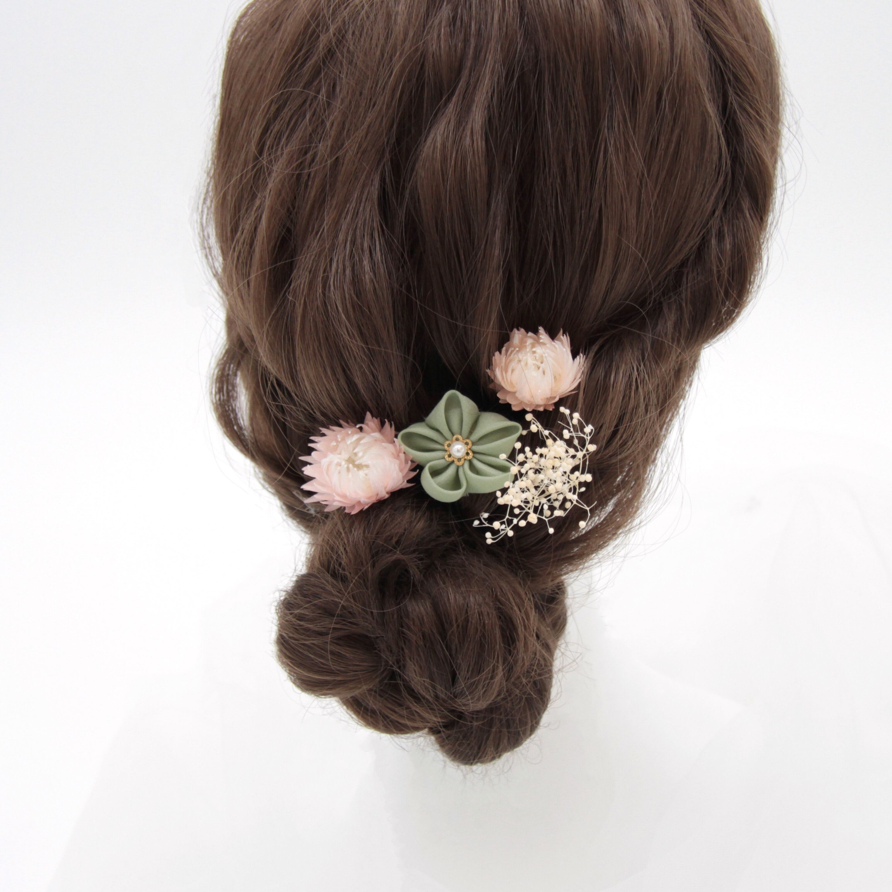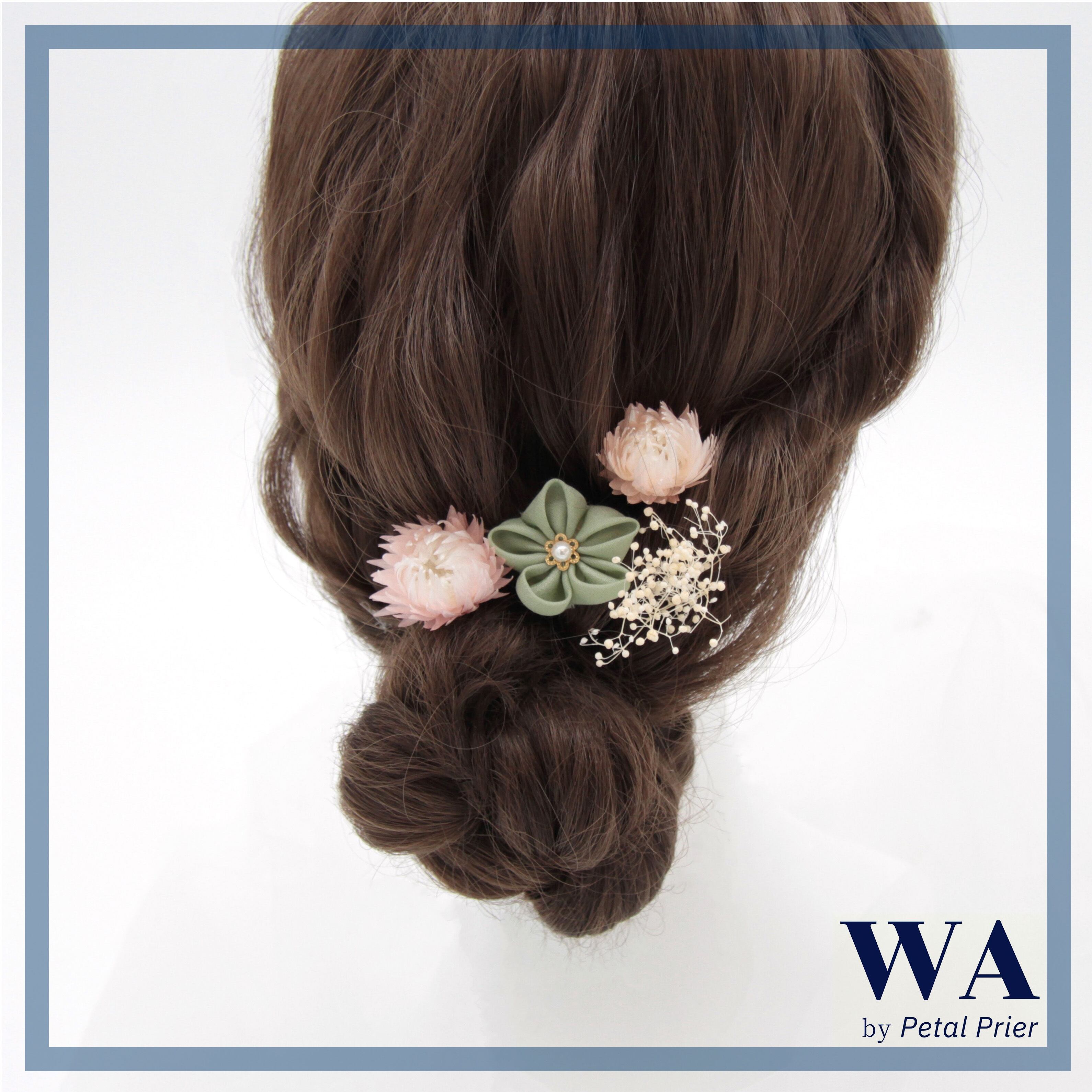 髪飾り 髪飾りセット 成人式 振袖 結婚式 ブライダル ヘッドドレス 卒業式 七五三 前撮り 緑 グリーン くすみ ピンク ドライフラワー つまみ細工 K-181 | WA by Petal Prier