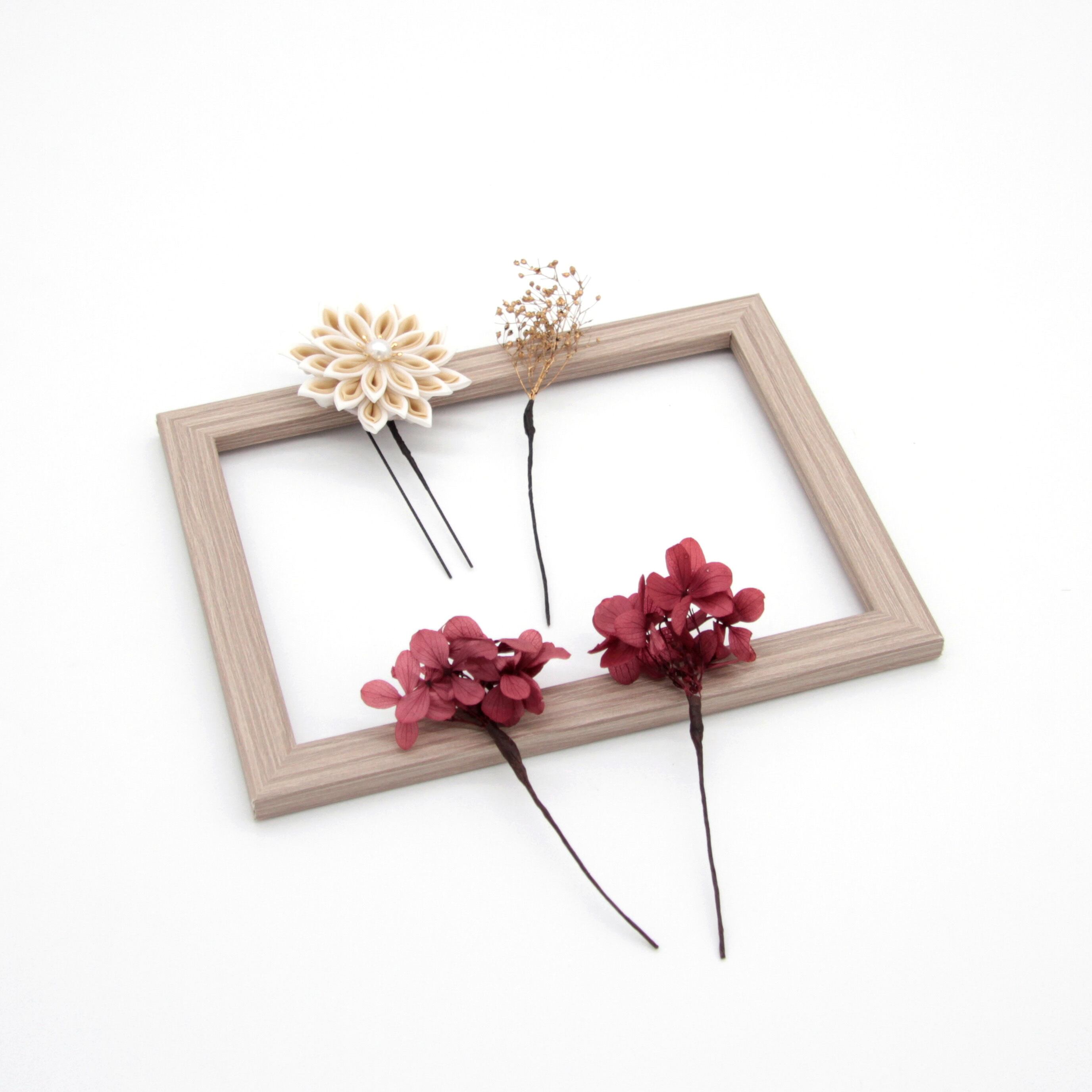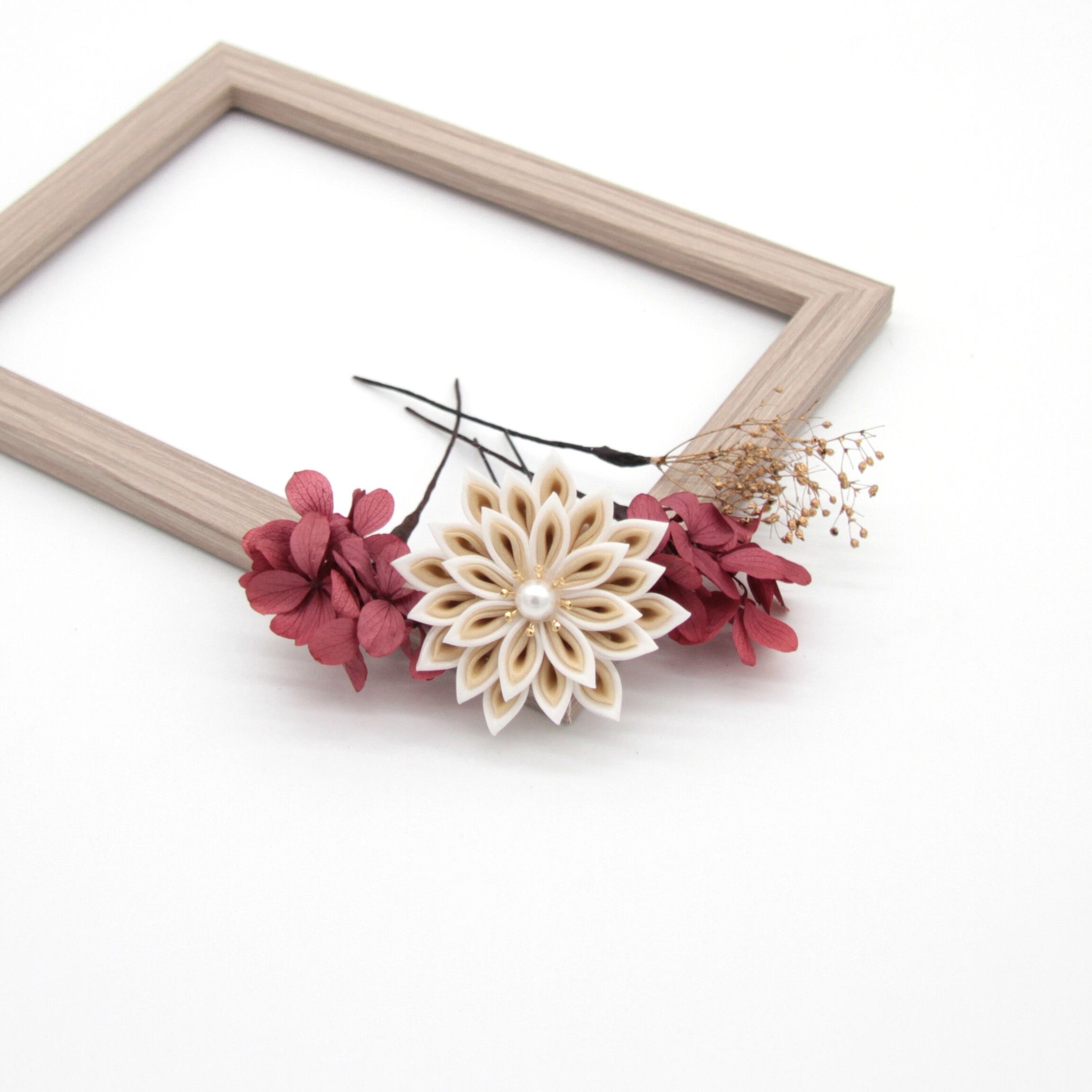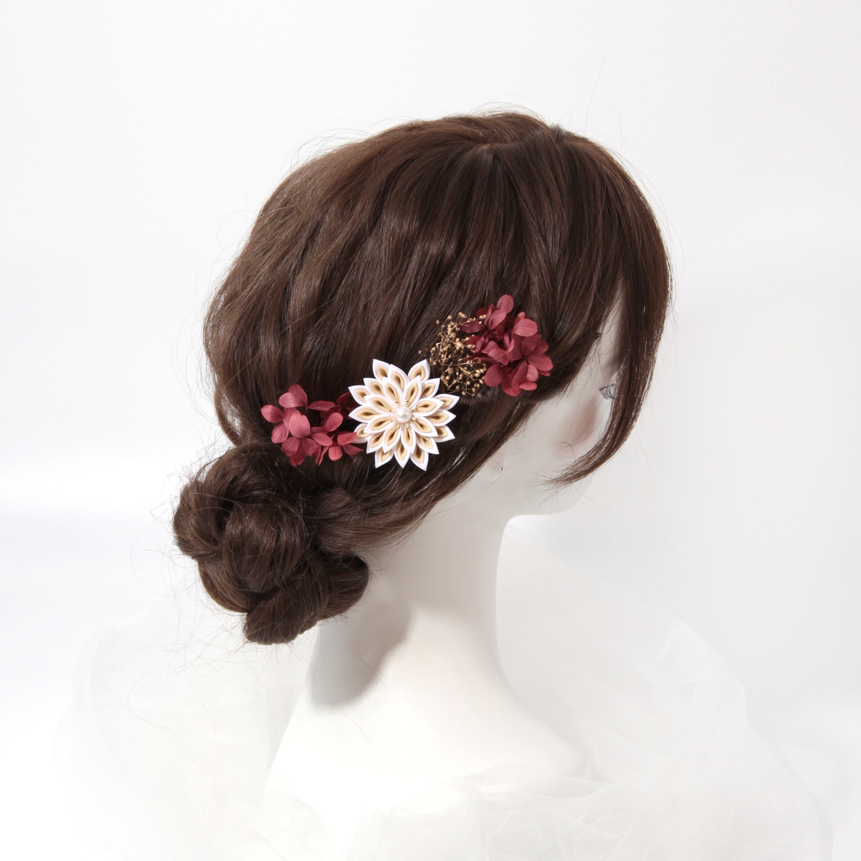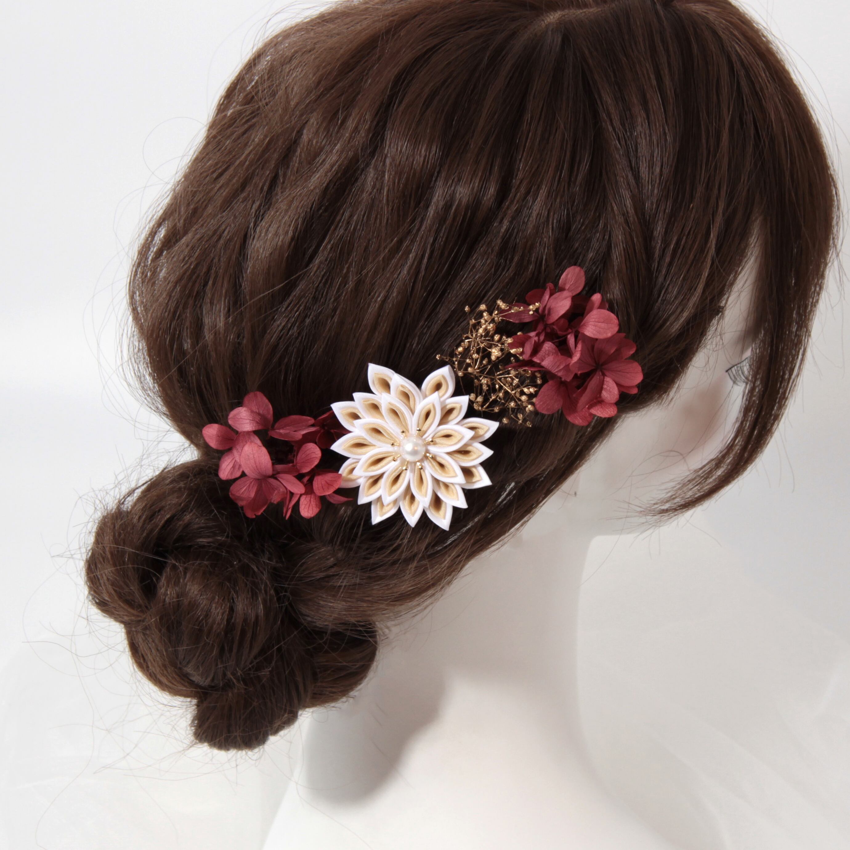 ワインレッドとかすみ草のゴールドが大人っぽい髪飾りです。