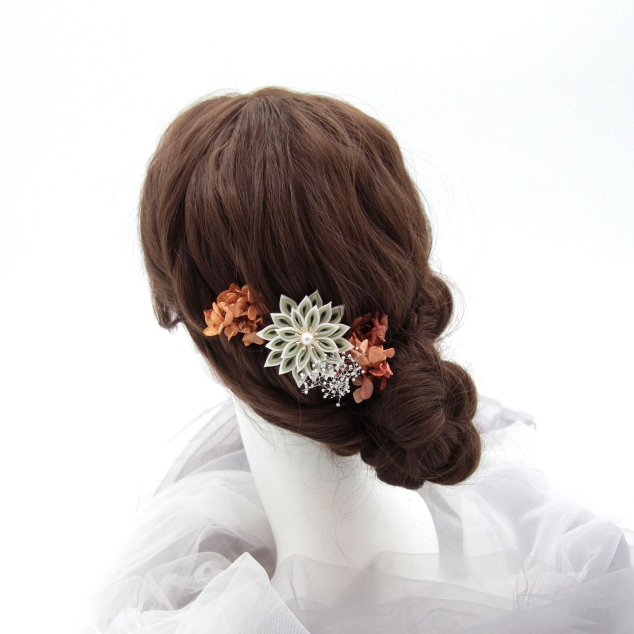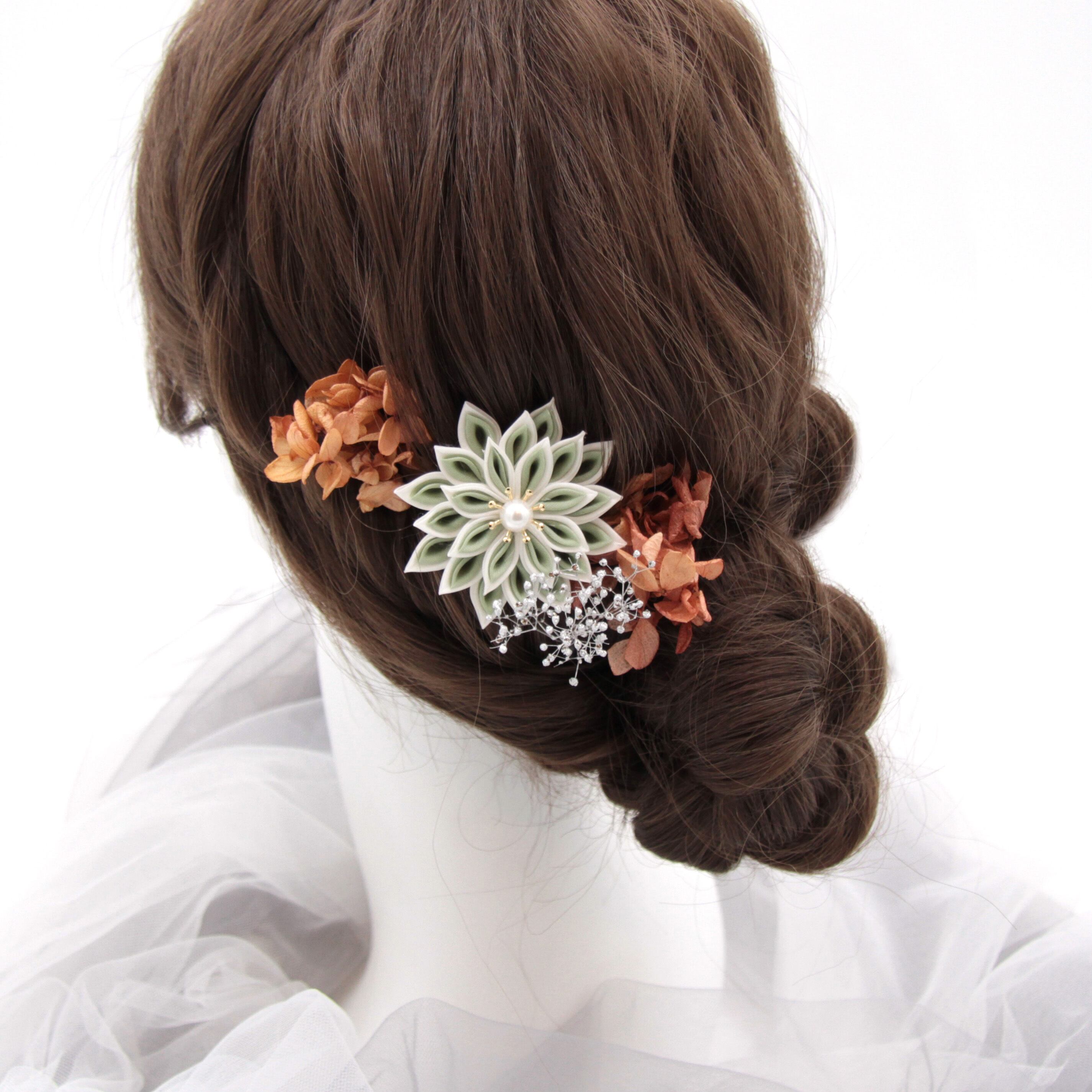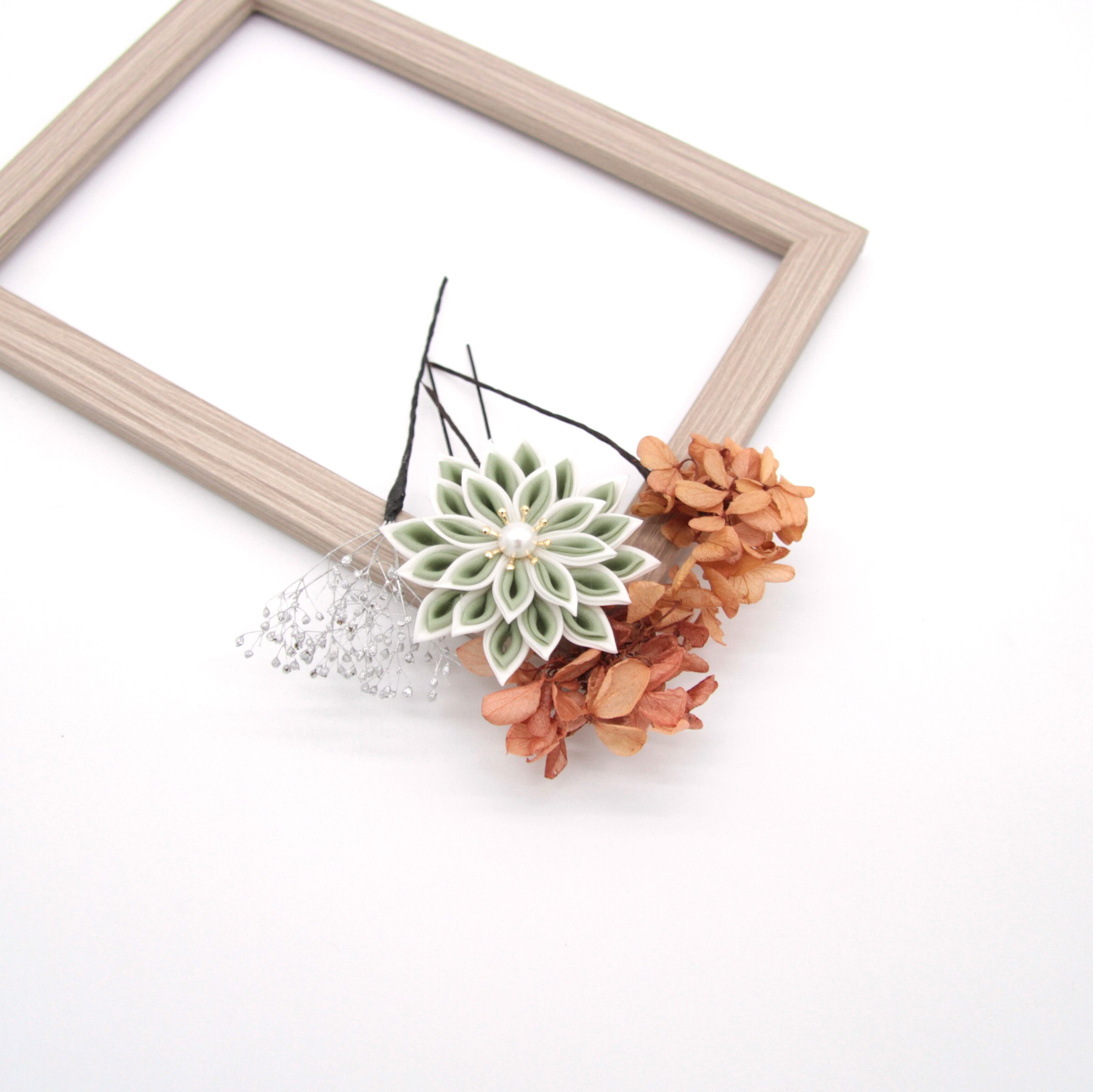 髪飾り 髪飾りセット 成人式 振袖 結婚式 ブライダル ヘッドドレス 卒業式 七五三 前撮り 緑 グリーン くすみ 茶 ブラウン つまみ細工 あじさい K-184 | WA by Petal Prier